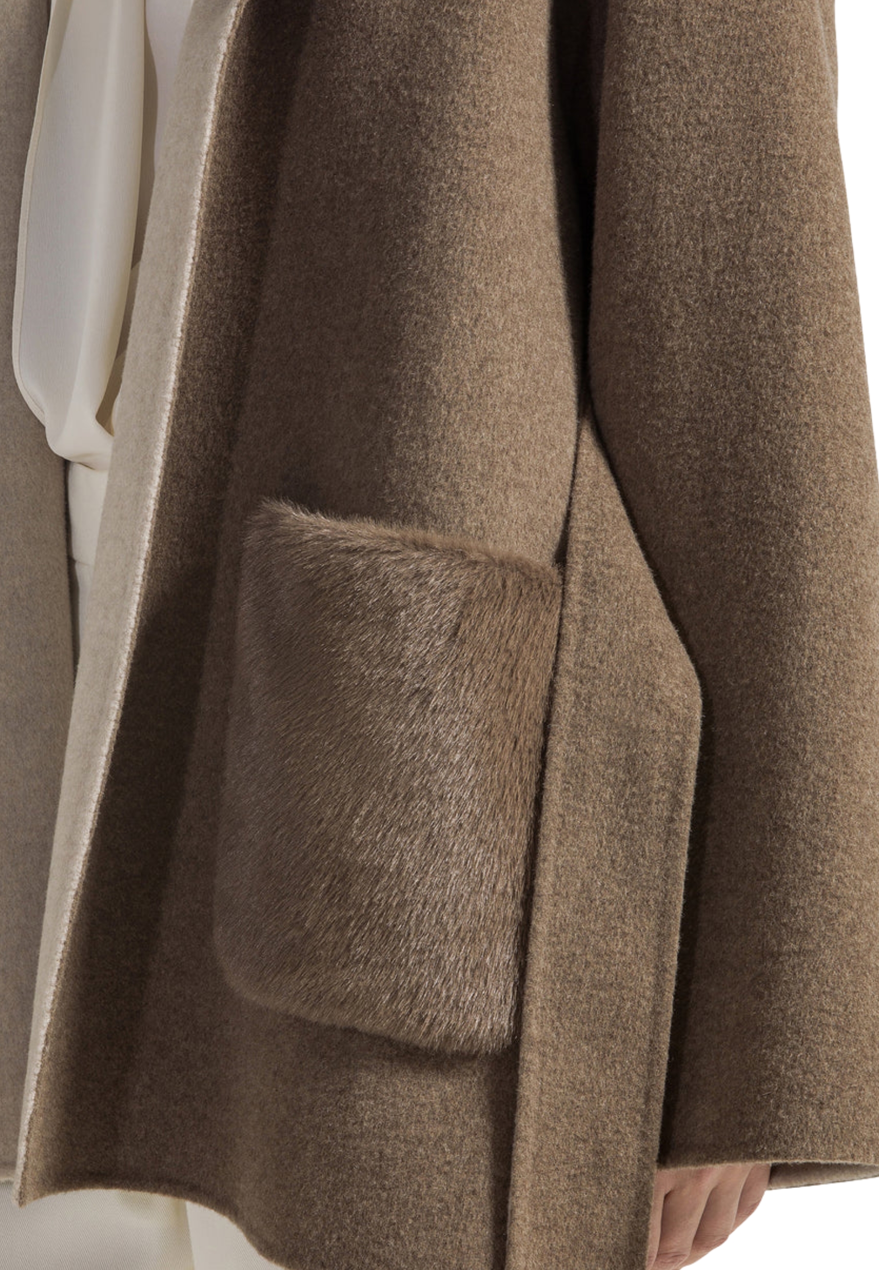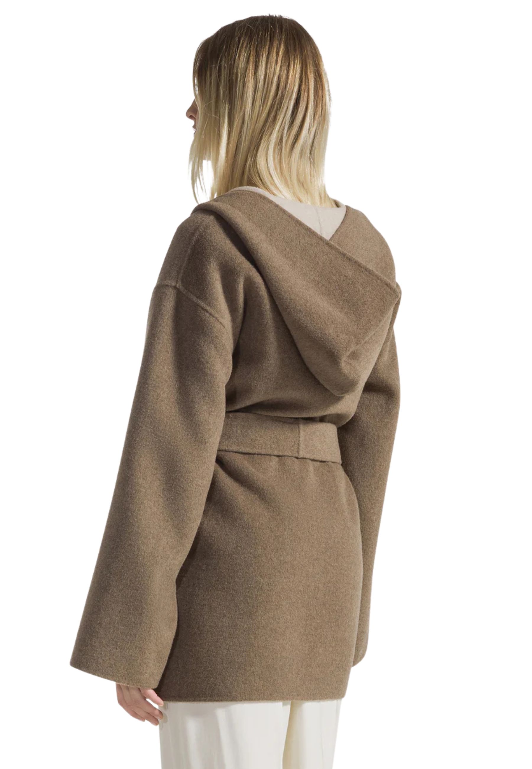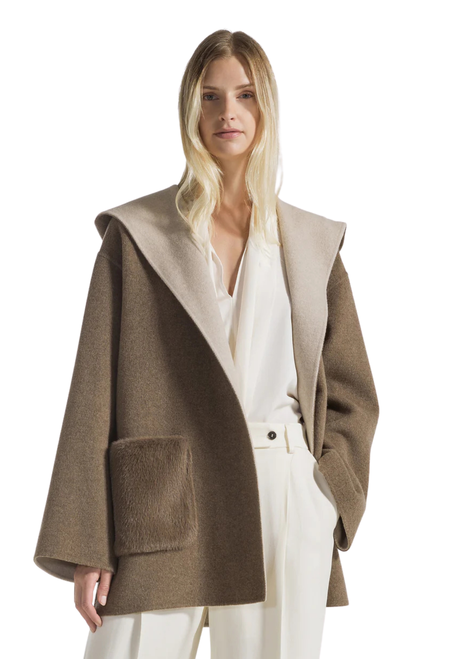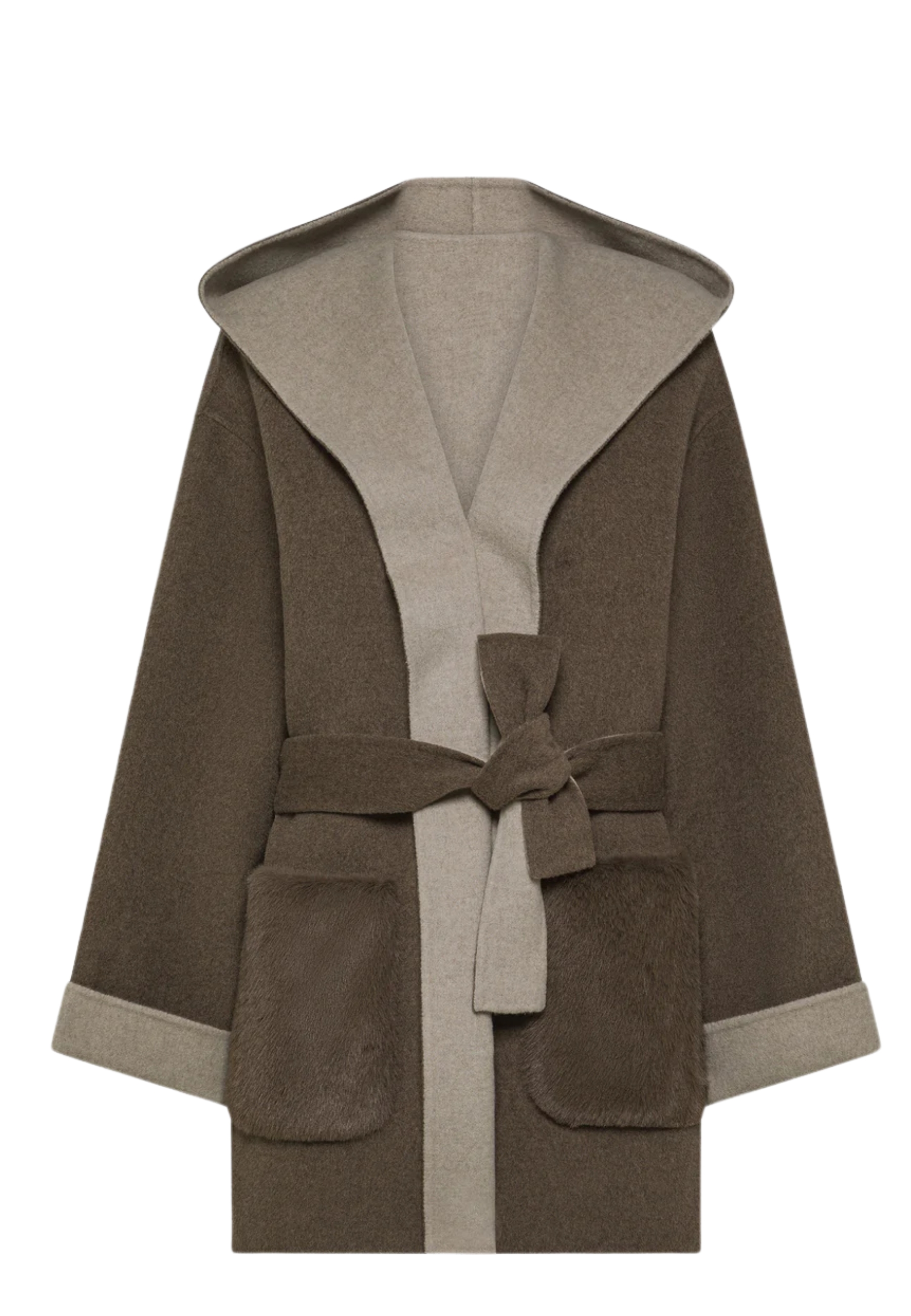 Cappotto a vestaglia corto in double mistolana mélange bicolore con cappuccio e fusciacca in vita.