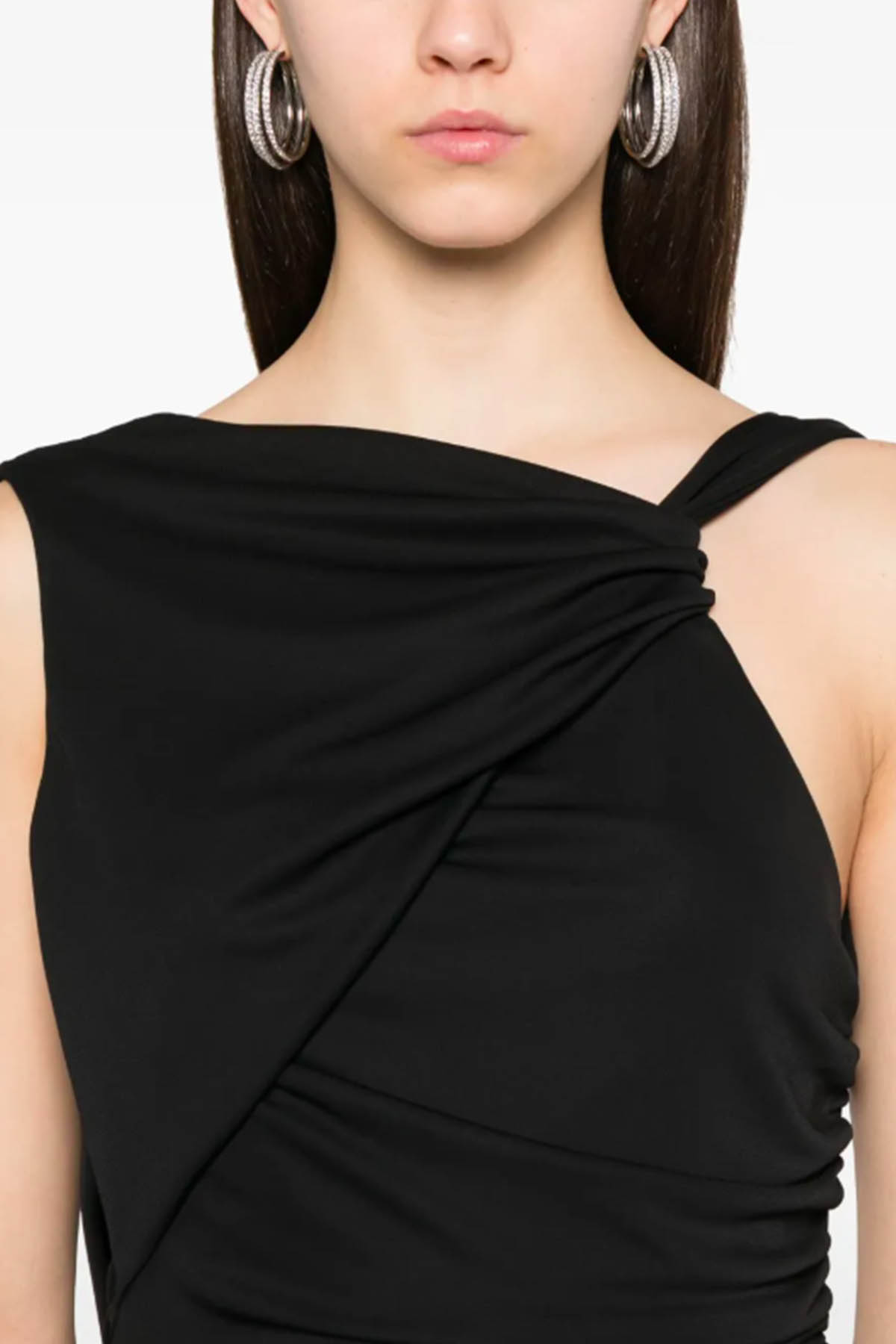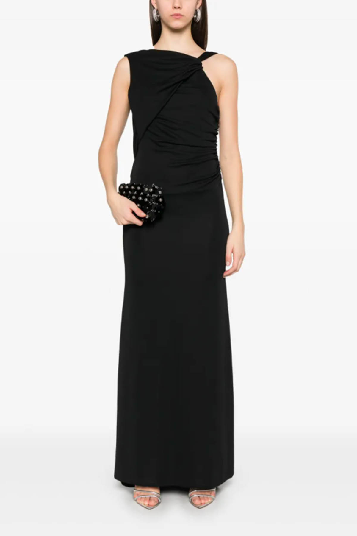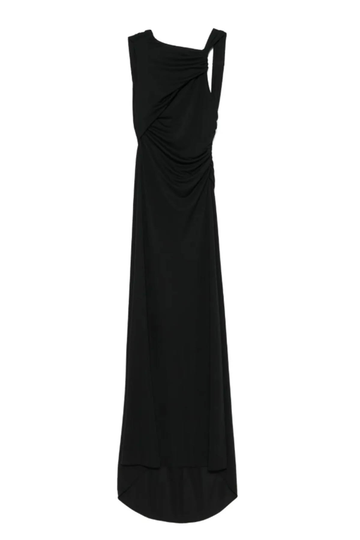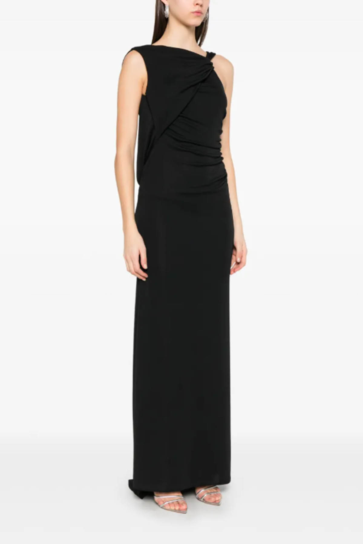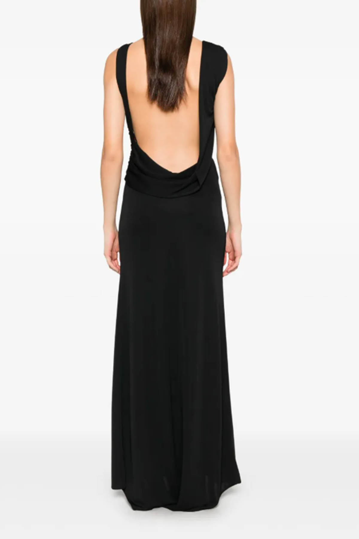 Modello in jersey elasticizzato, schiena scoperta, dettaglio con nodo sul davanti, drappeggio in vita che modella la silhouette, design lungo. Composizione: 94% poliestere 6% elastan Made in Italy