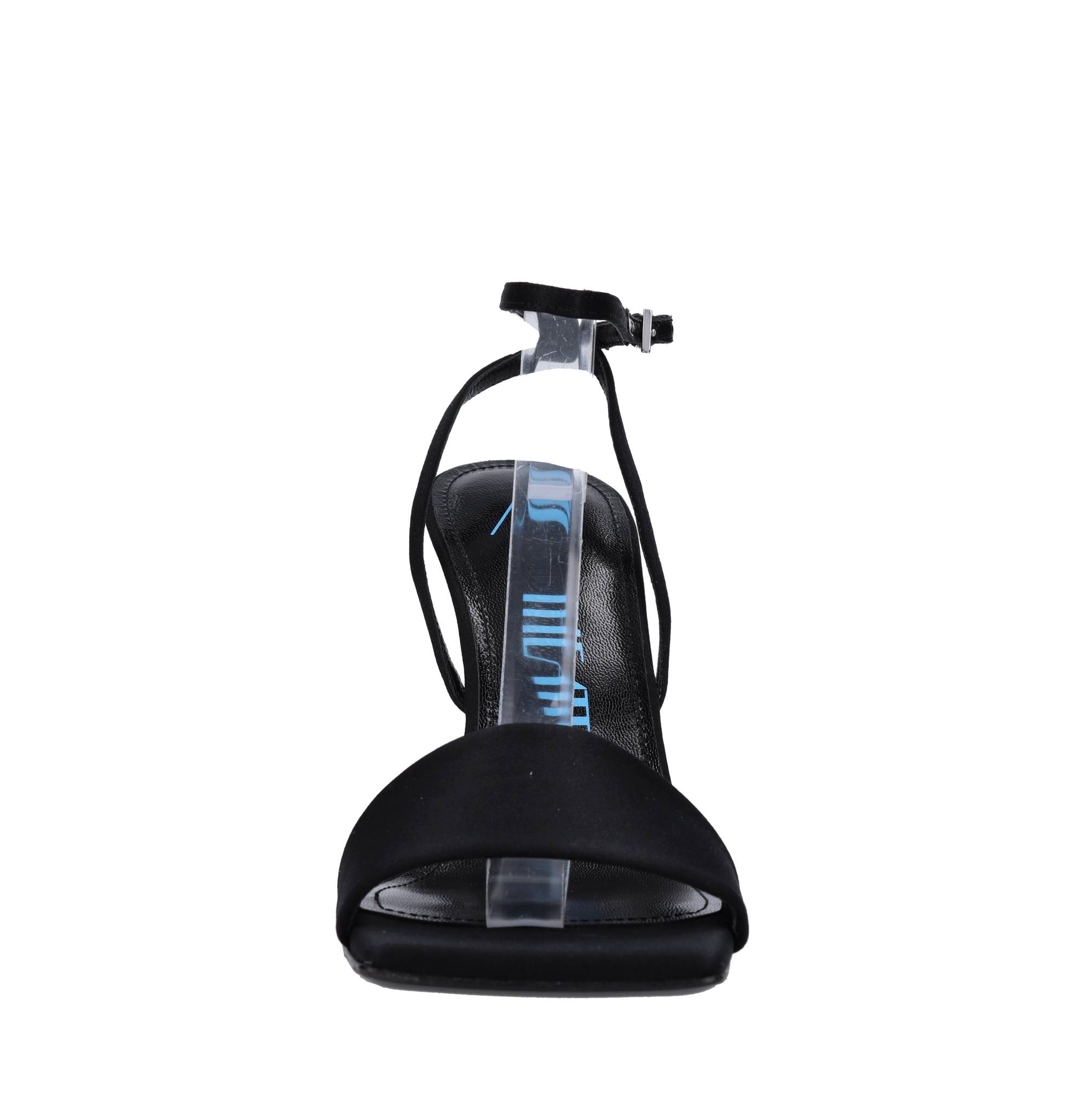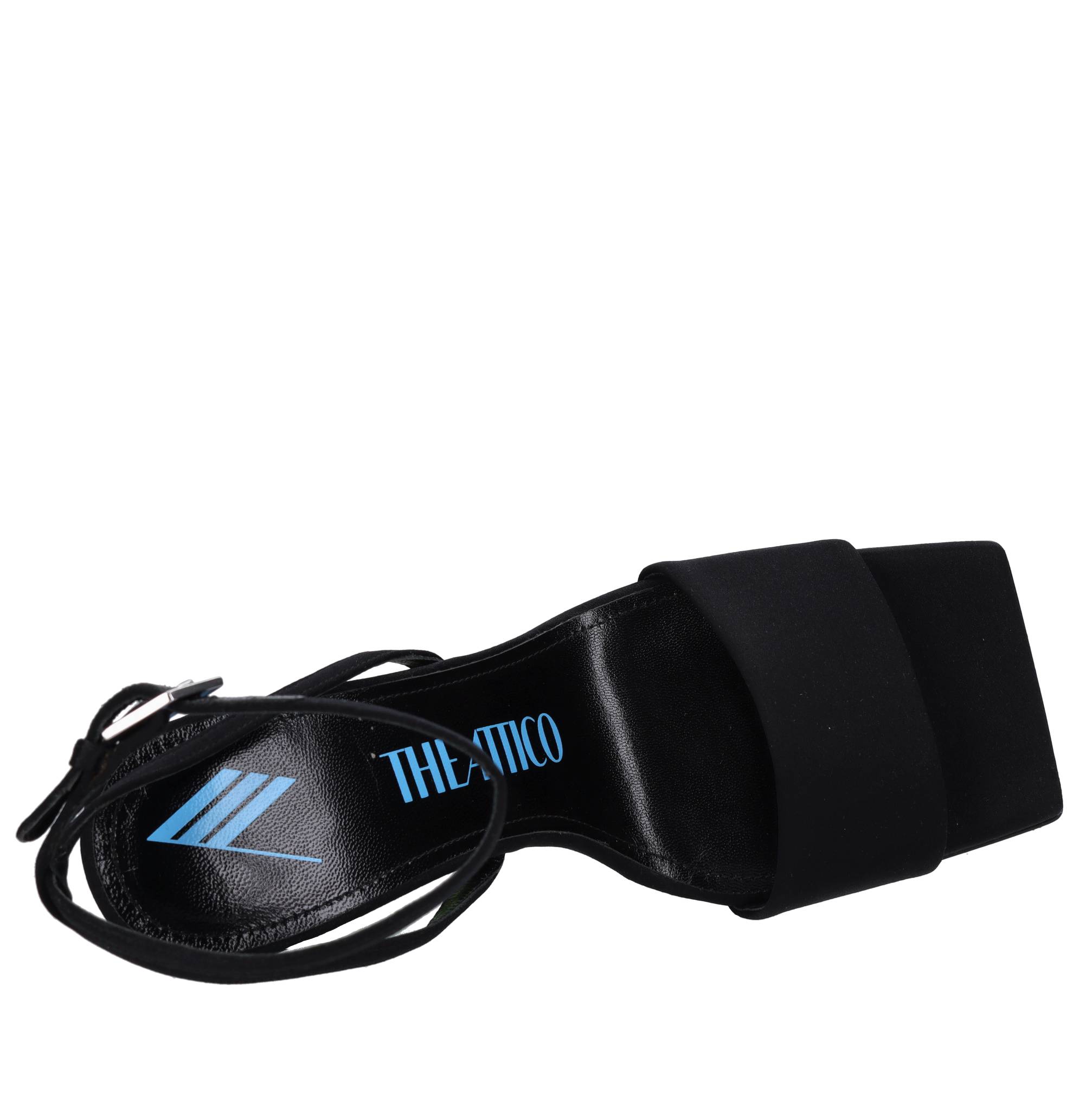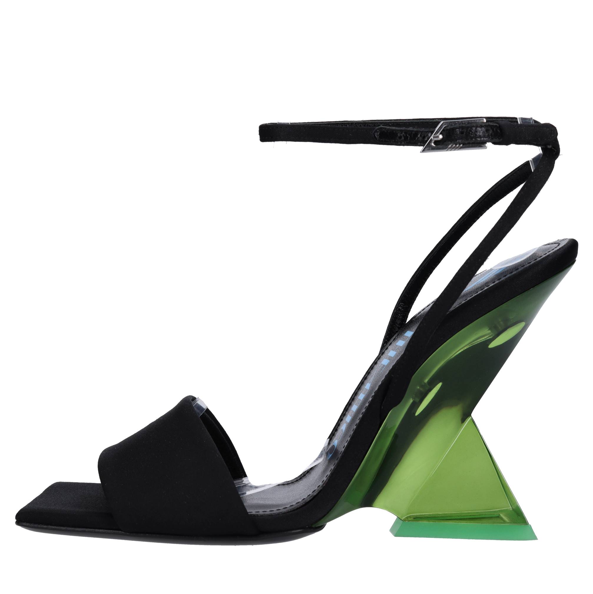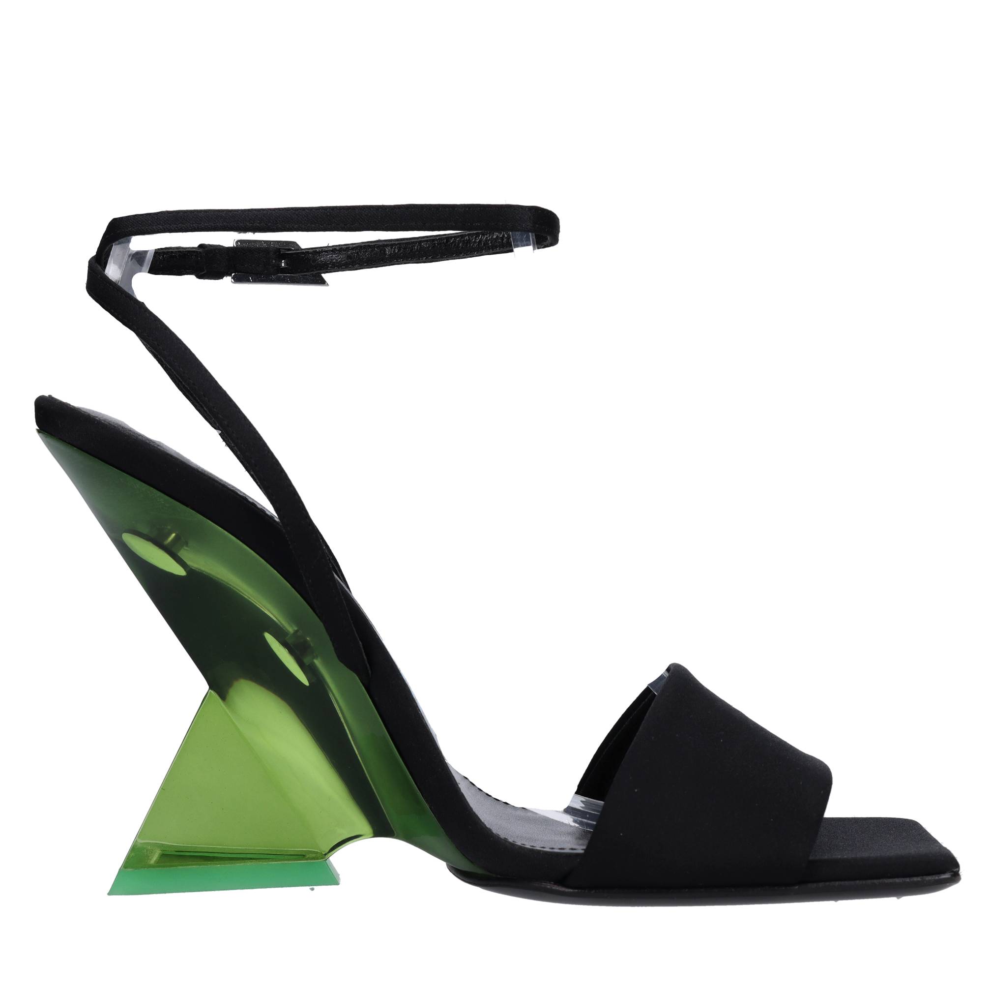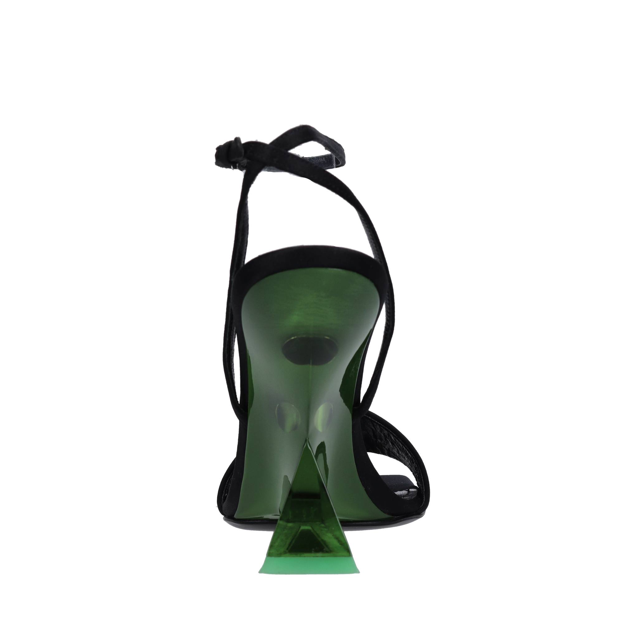 Sandali in raso. Modello Cheope. Suola esterna in cuoio. Tomaia interna in pelle e tessuto. Tacco piramidale plexi verde.