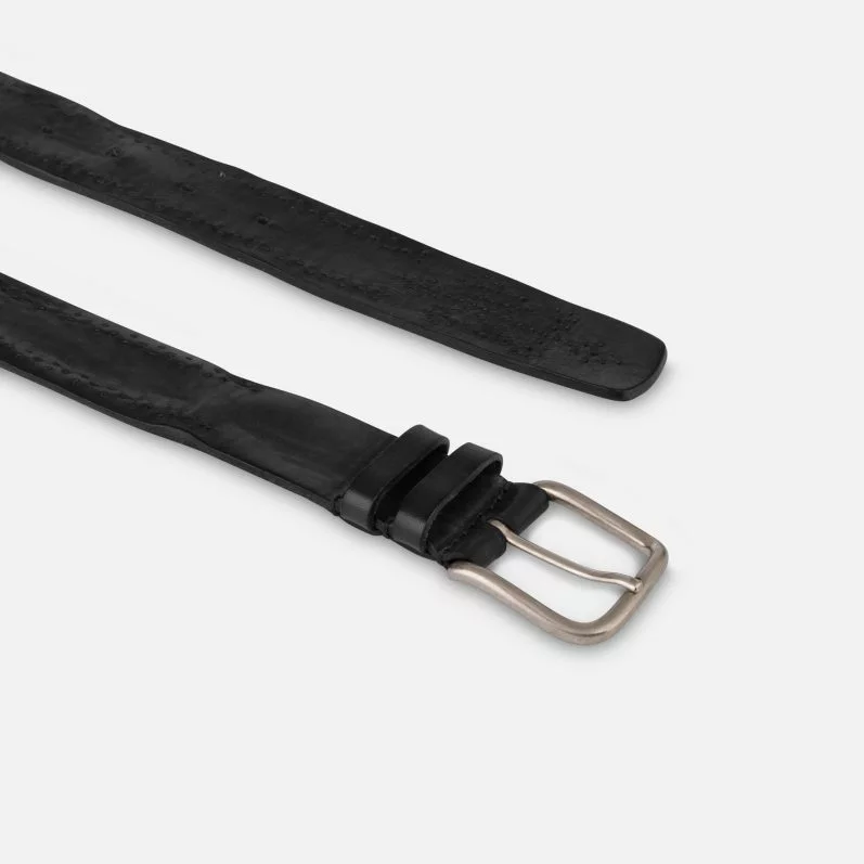 Cintura regolabile in cuoio nero lavato e schiacciato, tinta a mano. Decorata da un traforo perimetrale e in punta. Fibbia stondata in zama. Estremante raffinata, è la scelta perfetta per chi ricerca un accessorio elegante ma non convenzionale. Perfetta da abbinare alle vostre derby con traforo all’inglese.