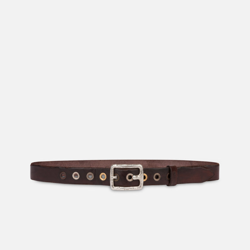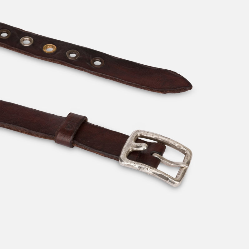 Cintura in cuoio invecchiato testa di moro con bordi intagliati a mano. Gli occhielli in metallo di galvaniche differenti, battuti uno ad uno, illuminano la cintura. La fibbia doppia è singolare: massiccia, con filo battuto e con barretta decorativa. Estremamente versatile, è perfetta da abbinare ai vostri boots di pelle.