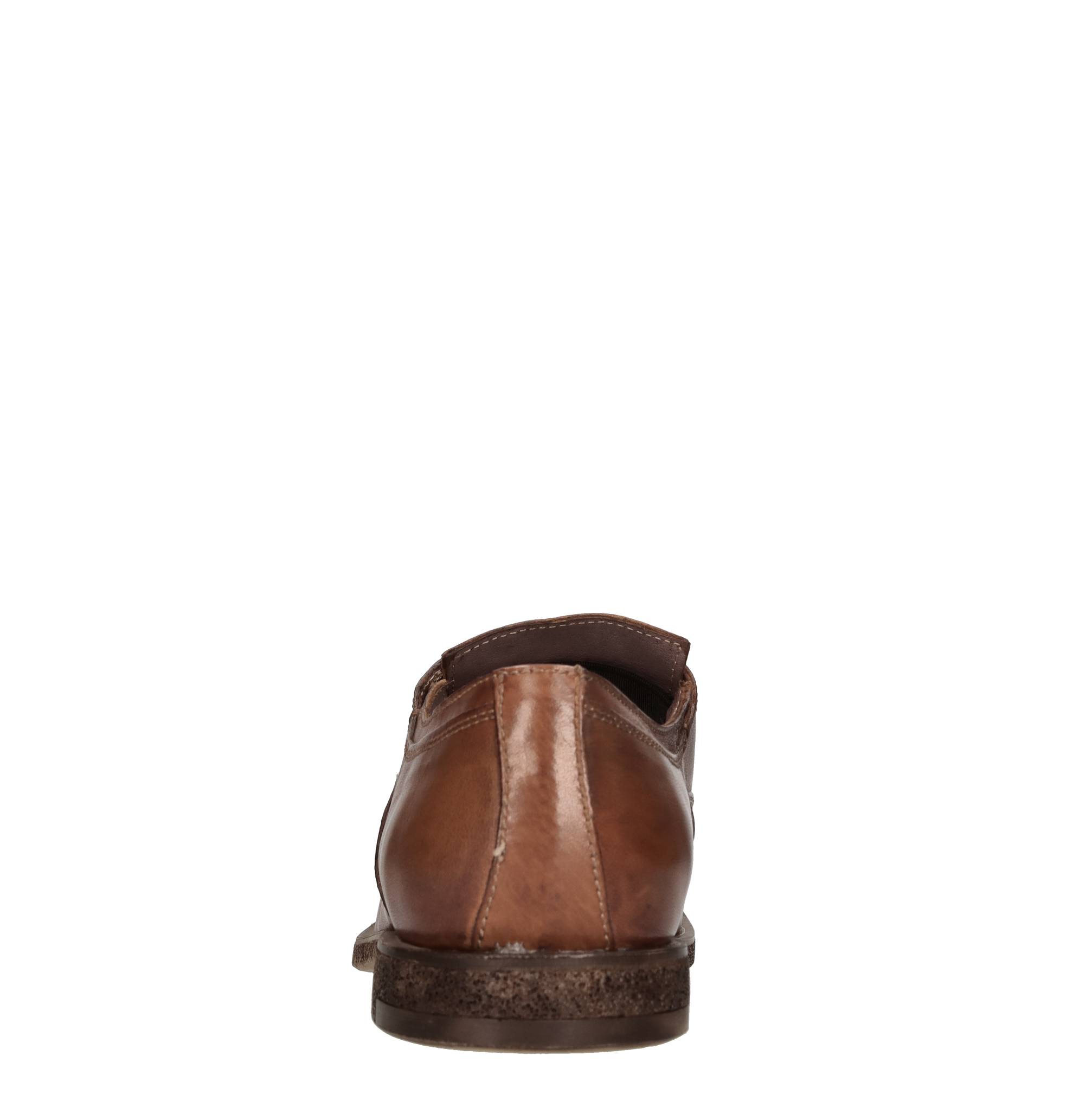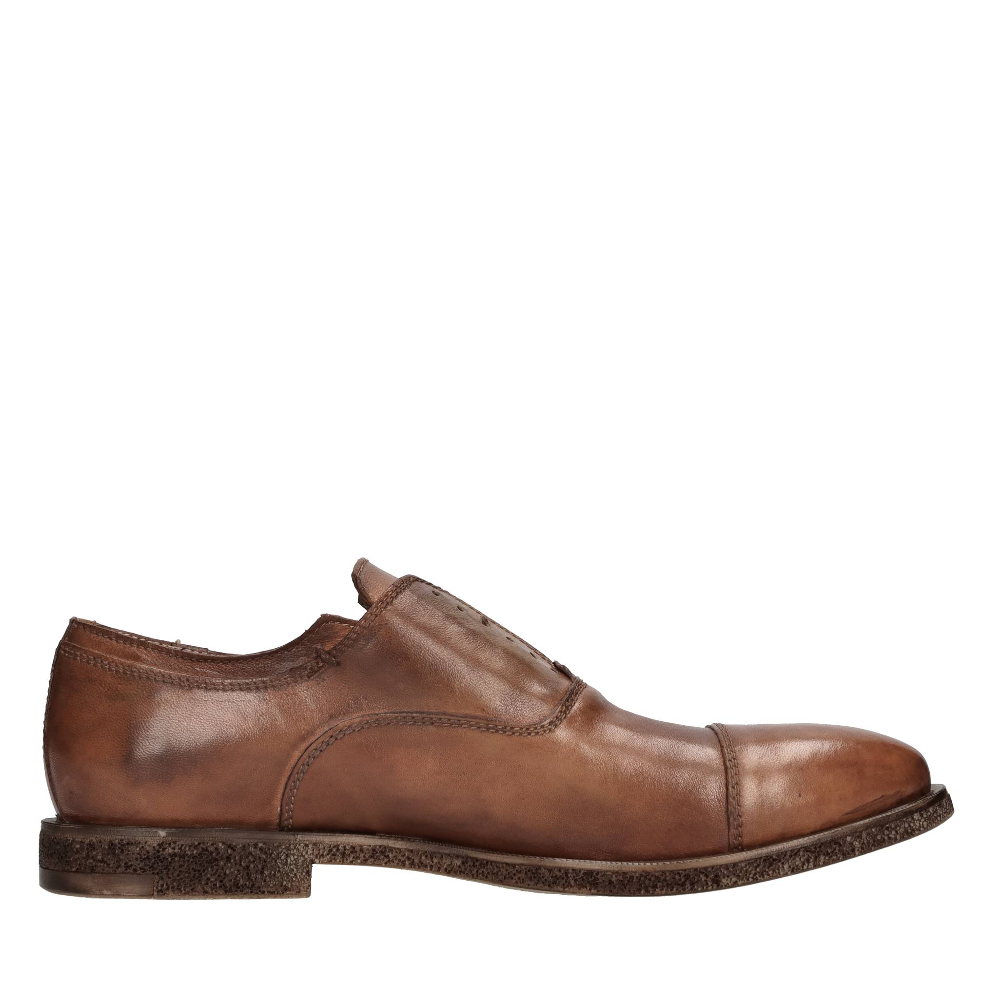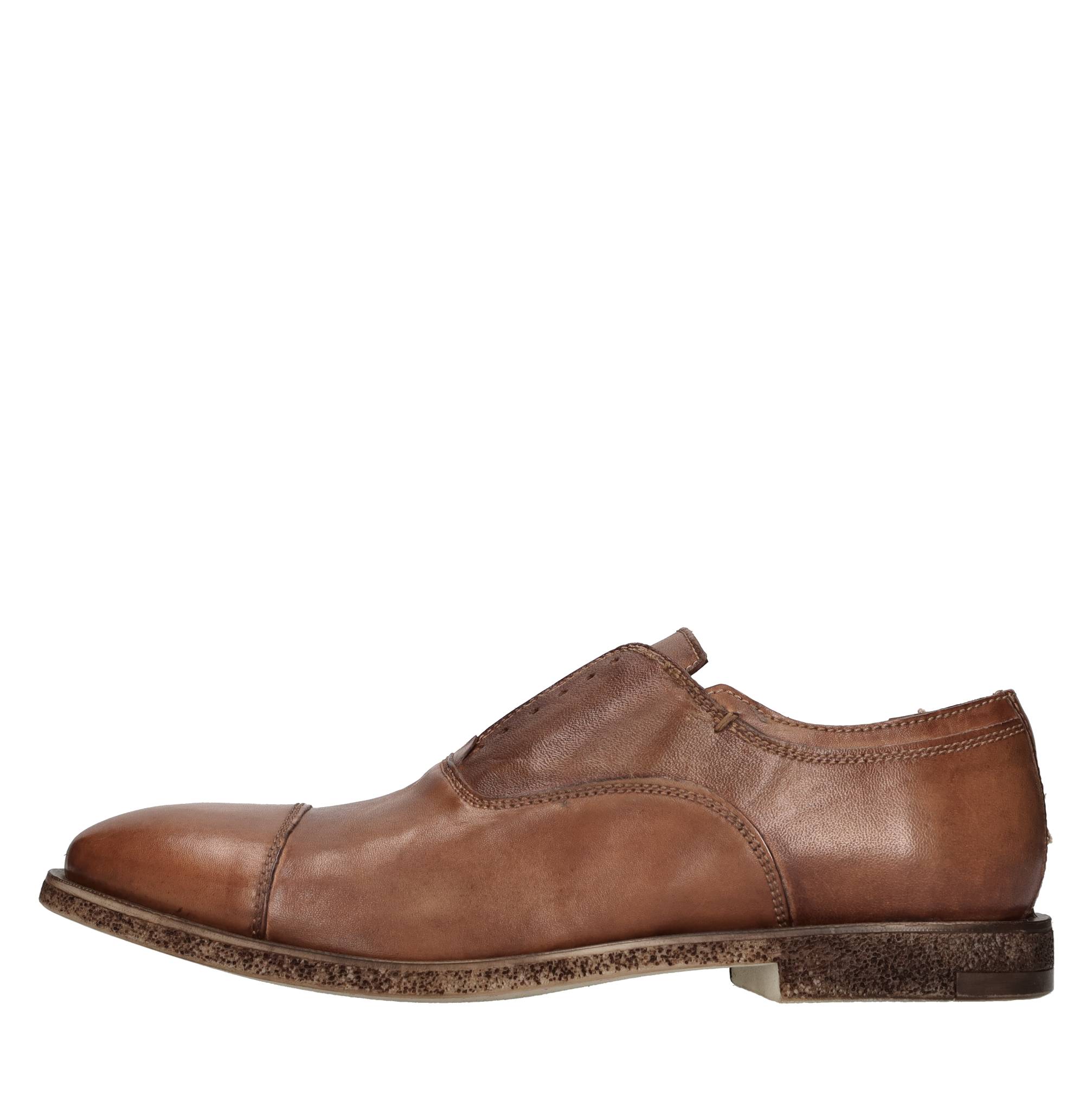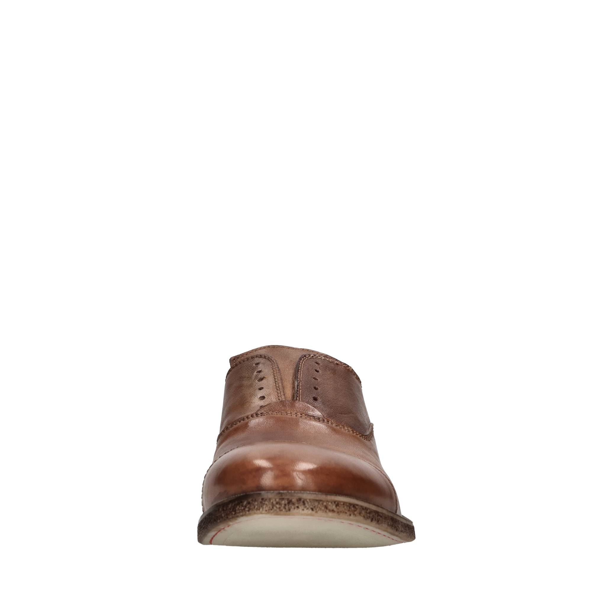 Stringate in pelle. Chiusura frontale con lacci. Suola esterna in gomma logata. Tomaia interna in pelle logata. Questo prodotto è stato fabbricato interamente in italia e sottoposto a trattamento di lavaggio in centrifuga dove ogni irregolarità risulta un pregio e non un difetto. Calzata abbondante.