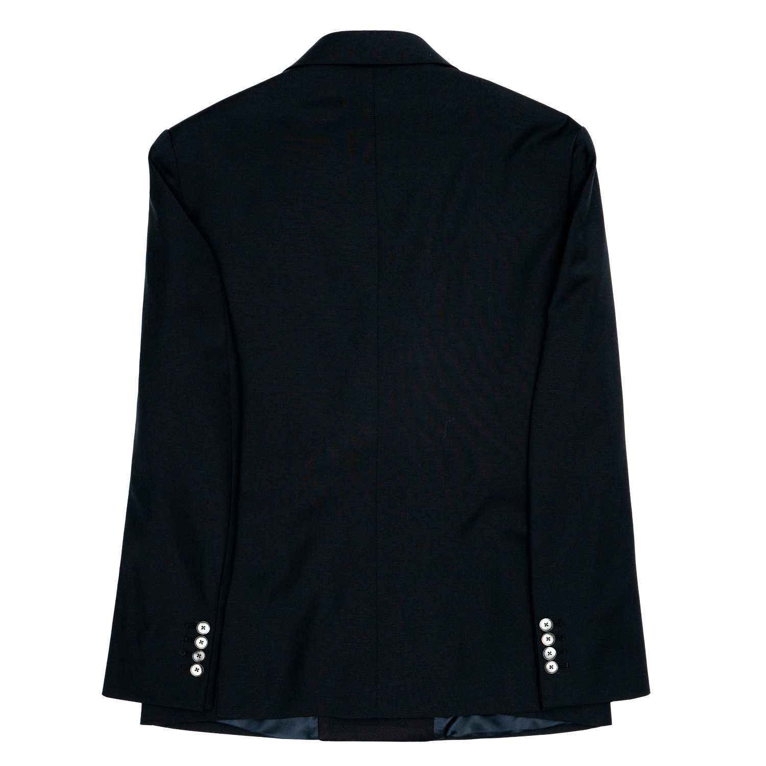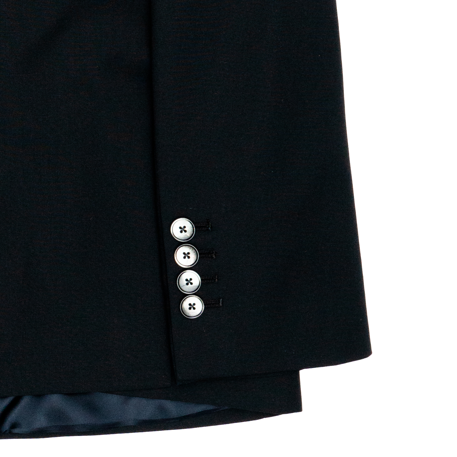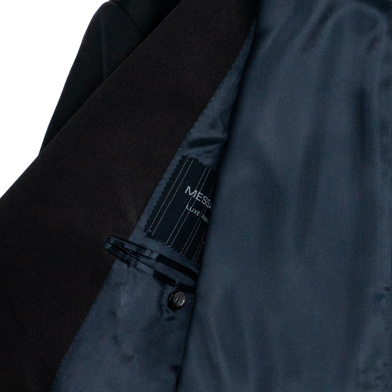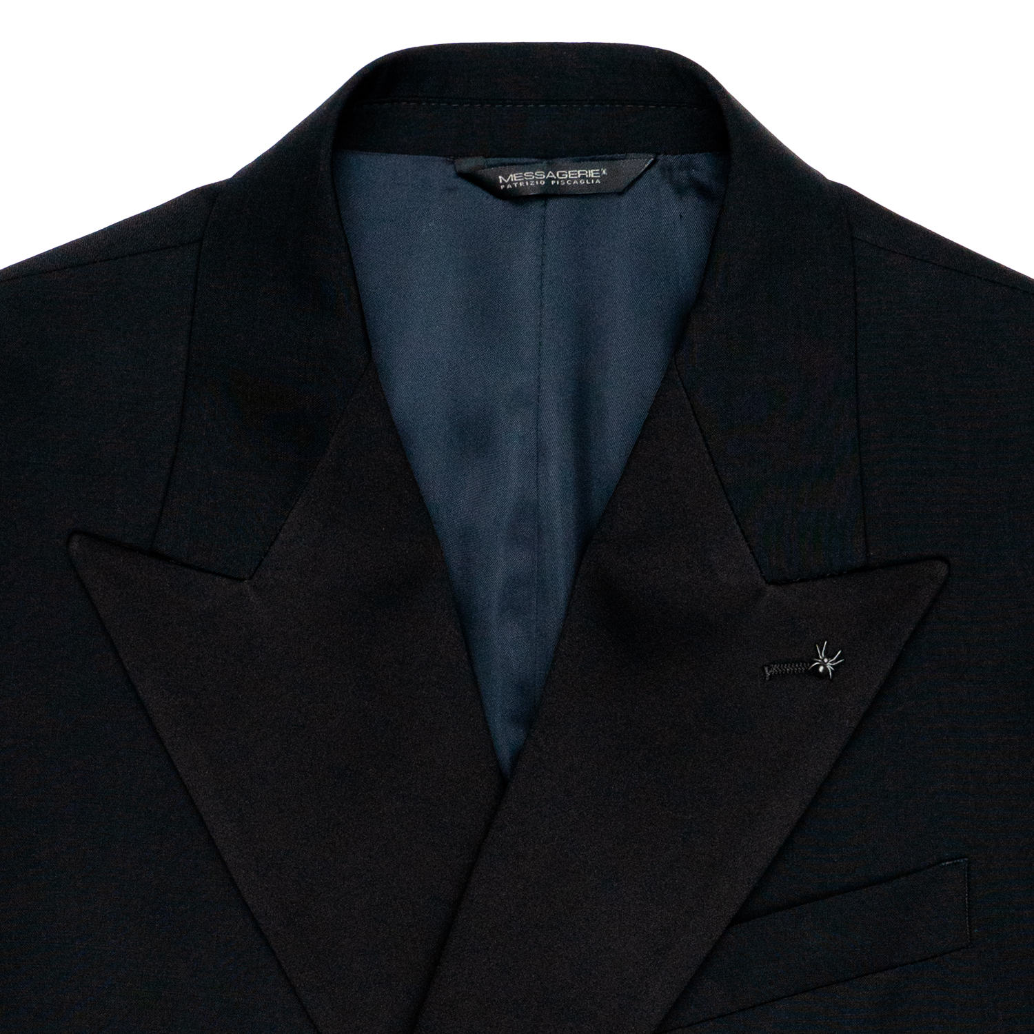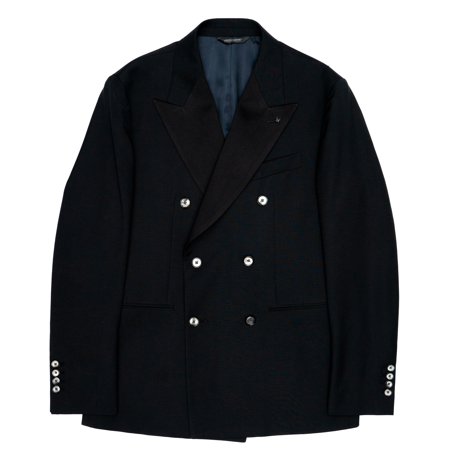 -Abito doppio petto -Rever contrasto raso nero -Tasca filetto con pattina interna -Interno foderato -Giacca con aperture laterali -Pantalone tasco a filo con una pence centrale -Bottoni in madre perla 54% Lana 44% Poliestere 2% Elastan cucito in Italia