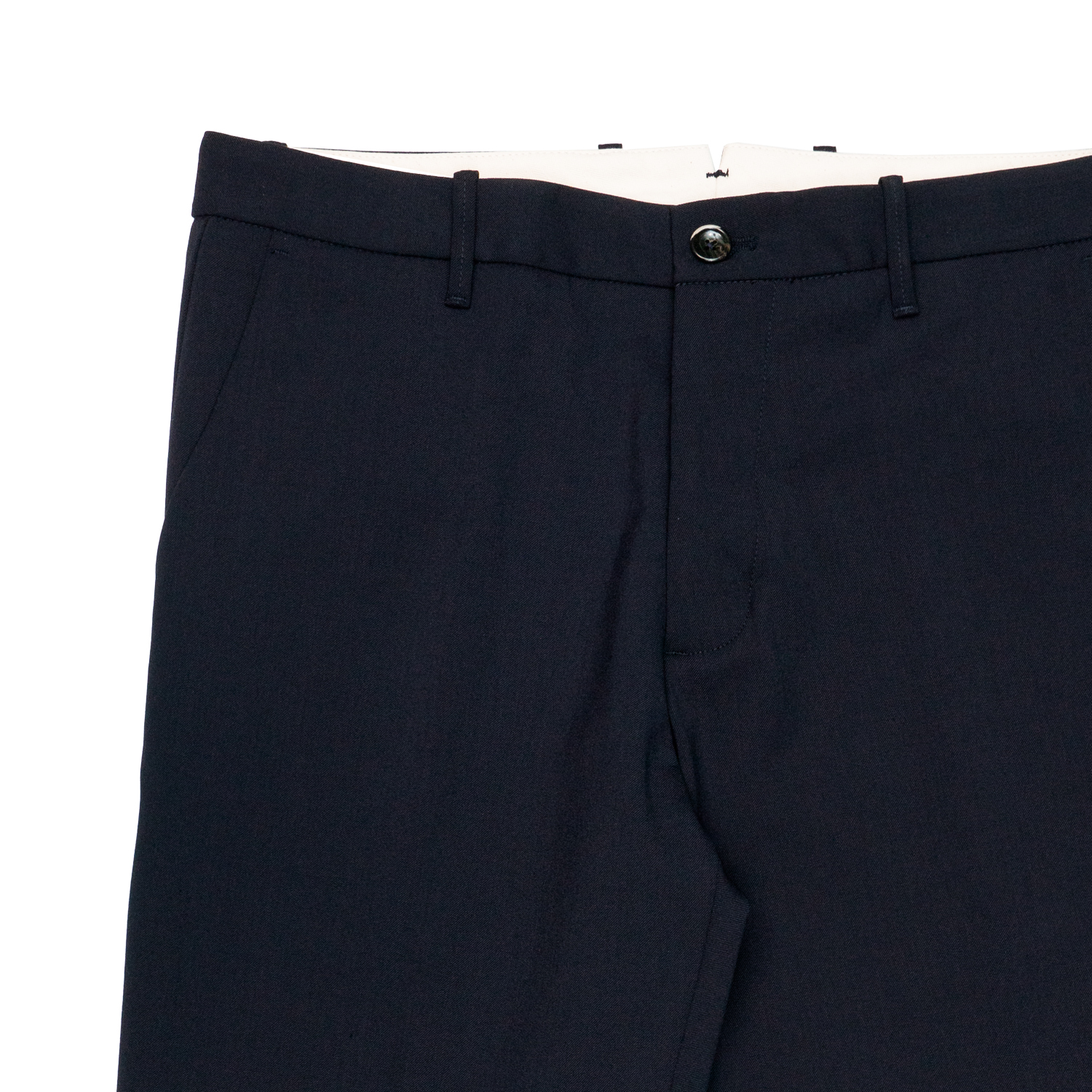 Pantalone chino in misto lana con vestibilità slim; chisura con bottone in corno.