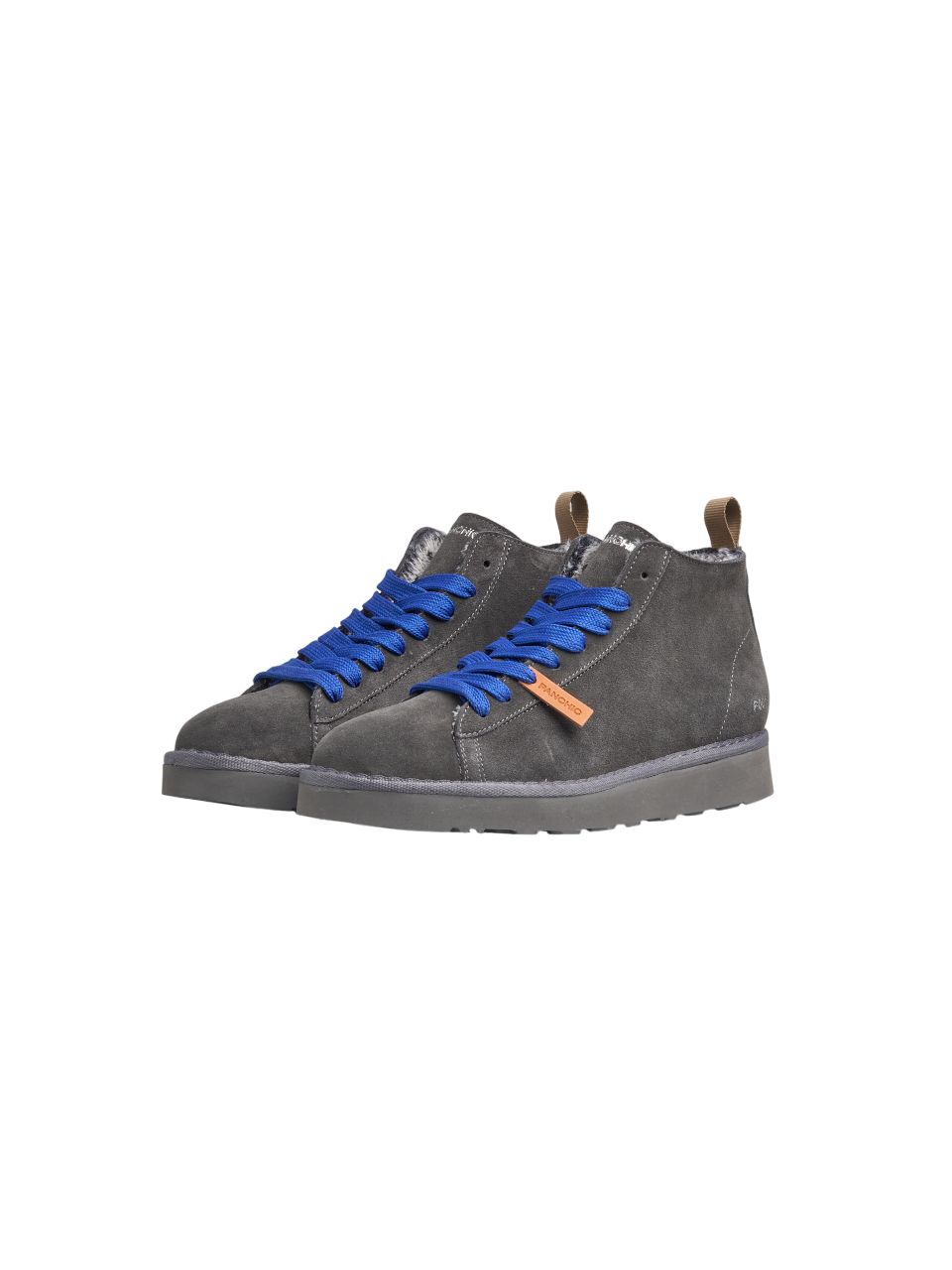 Polacchini uomo P001 con tomaia di camoscio grigio antracite, lacci a trama larga blu e fodera di faux-fur. La P01 con le sue linee pulite rappresenta il perfetto equilibrio fra design e comfort. Suola leggera in EVA alta 2,8 cm con logo Panchic in rilievo; Allacciatura ad otto fori senza occhielli; Fodera di tessuto effetto pelliccia; Sottopiede antibatterico estraibile in microfibra; Comodi elastici interni per agevolare i movimenti e fissare la linguetta; Lacci di ricambio: abbinati al colore della suola; Materiale: 100% pelle.