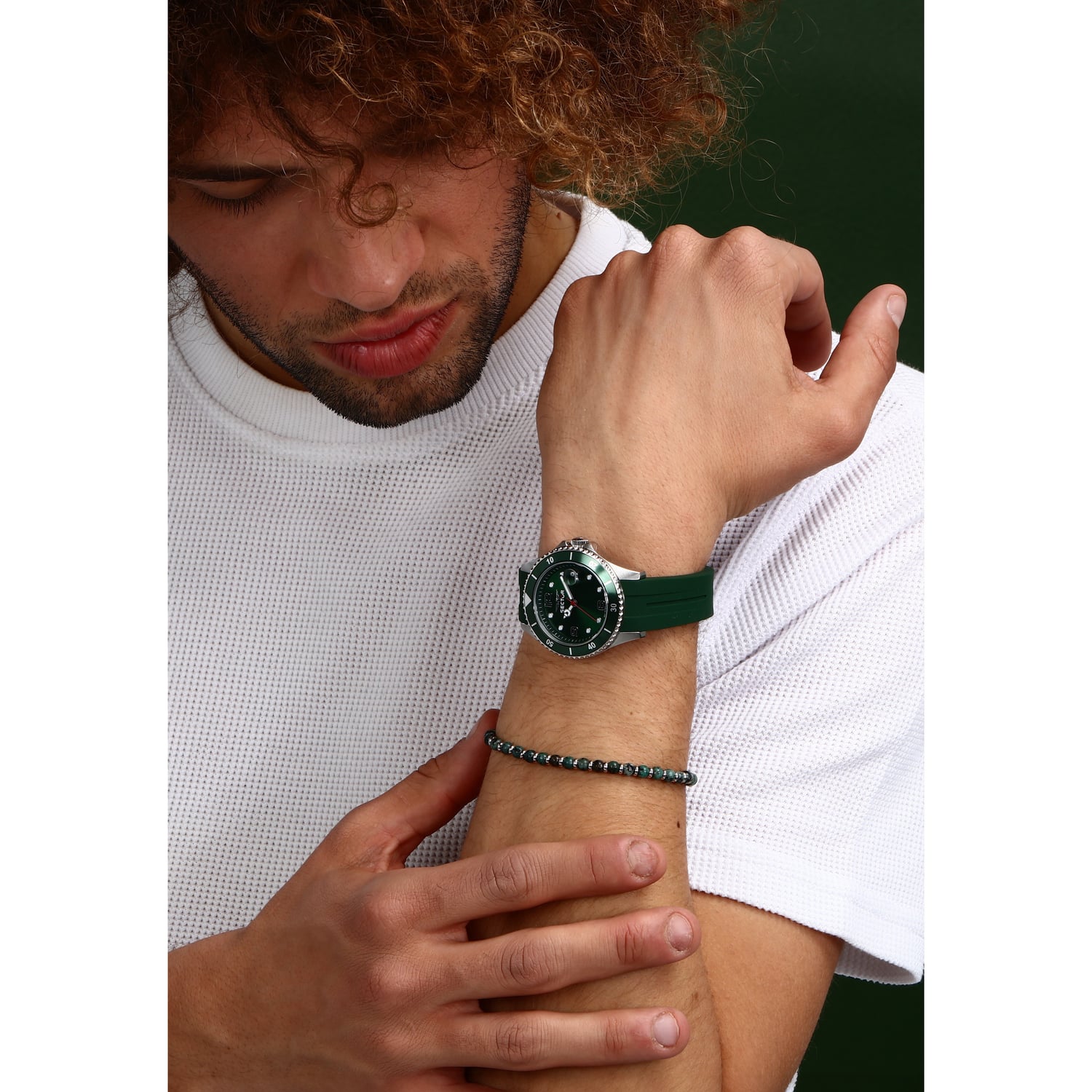 L'orologio è Completato Da Un Bracciale Elestico Con Pietre NAturali Verdi e Rondelle In Acciaio.