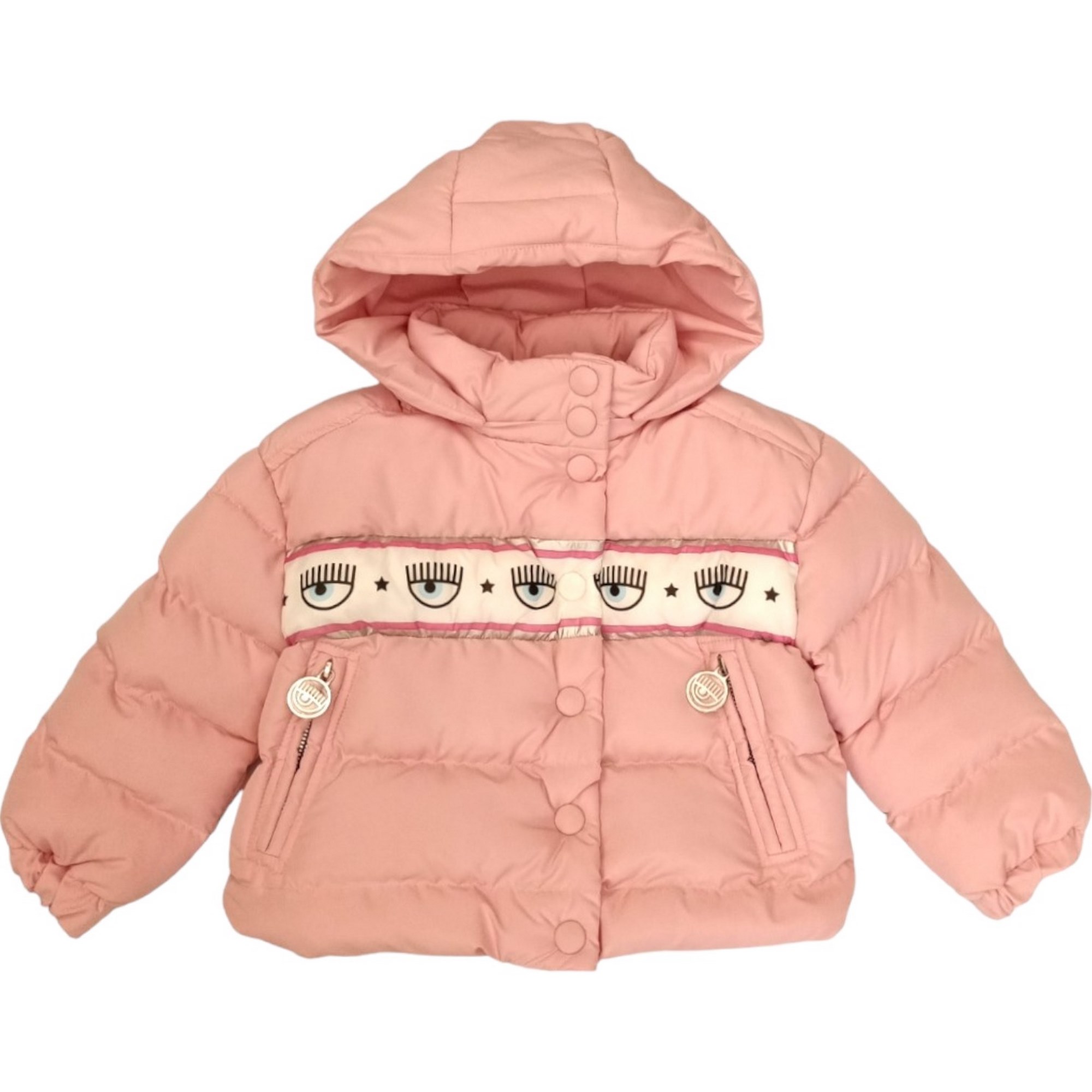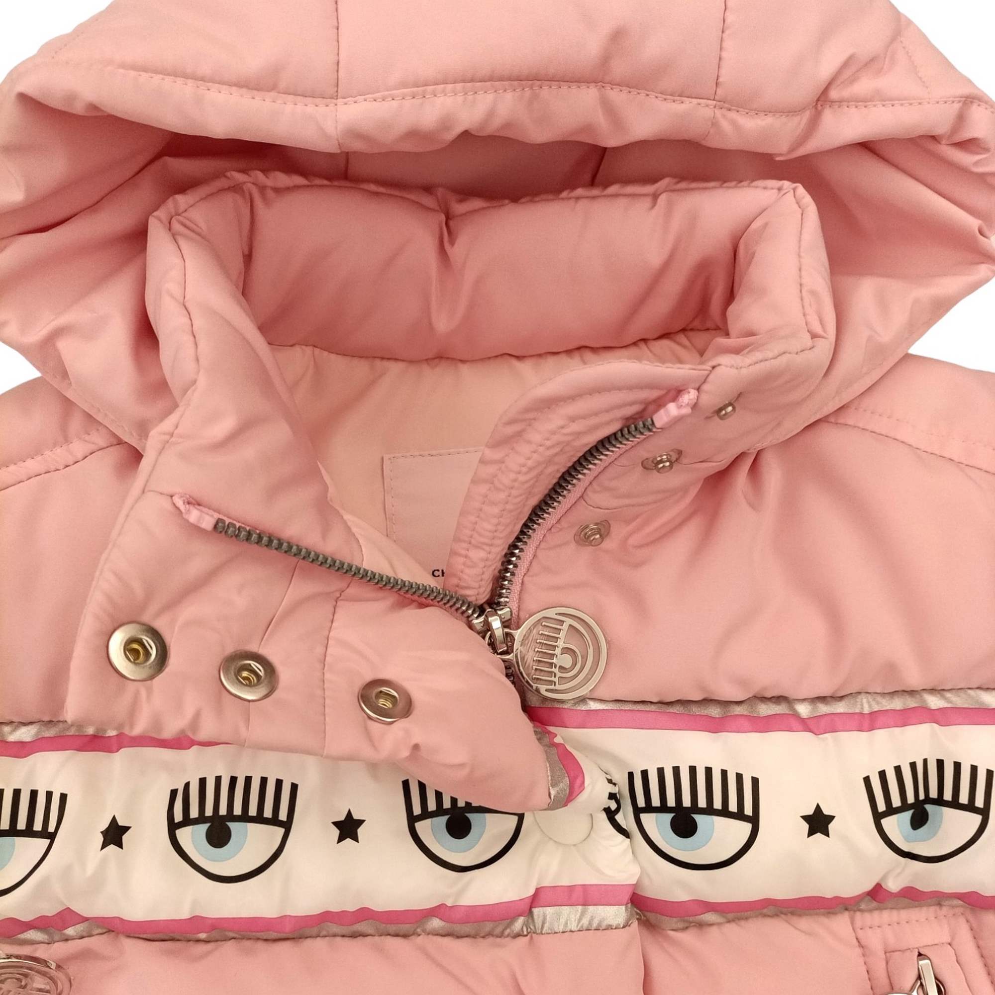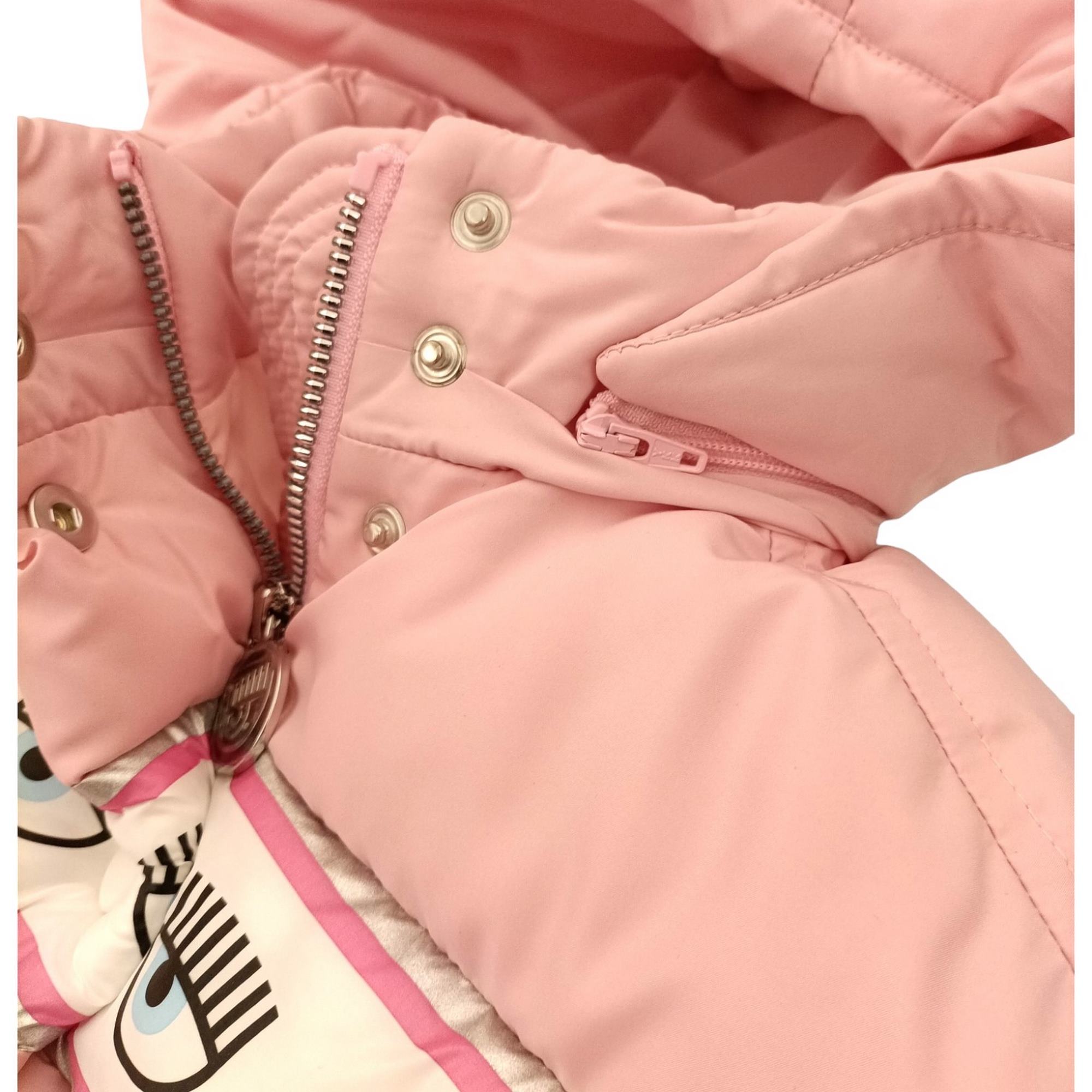 Jas Chiara Ferragni roze kleur met afneembare kap, ritssluiting en knoppen.
