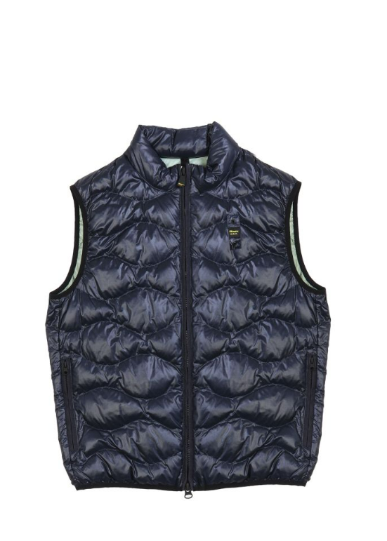 Mouwloze jas met licht controlepatroon, duurzame opvulling gestikt met golven en contrasterende kleurvoering Zipsluiting Sorona® ovaal gewatteerde Twee ritszakken Profiel in lycra op ronde mouwen en onderzakken met klittenband Passing met logo