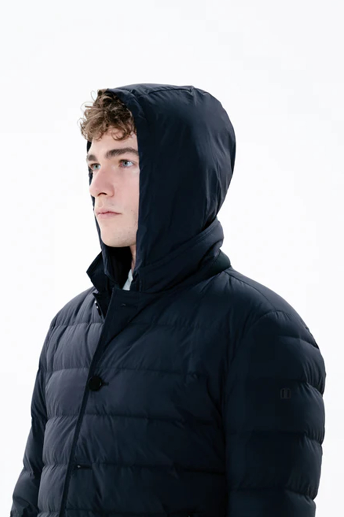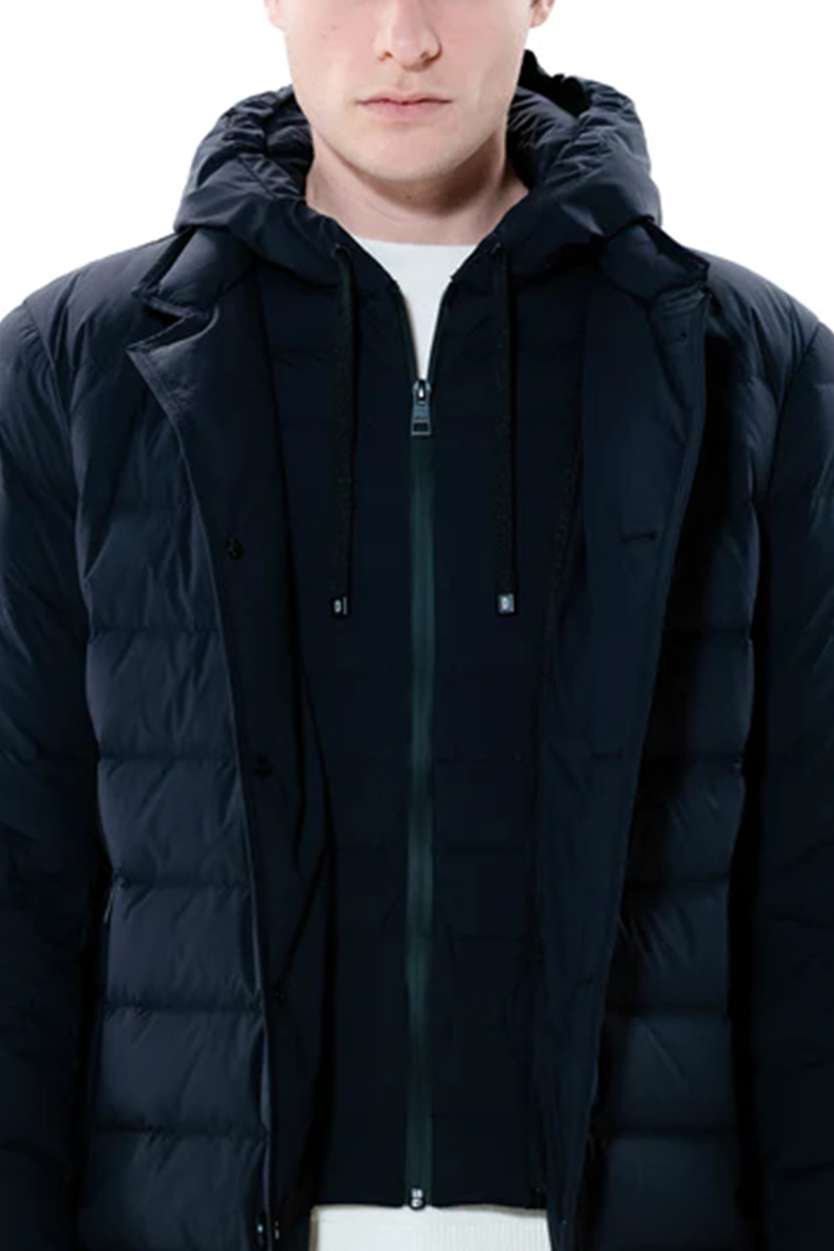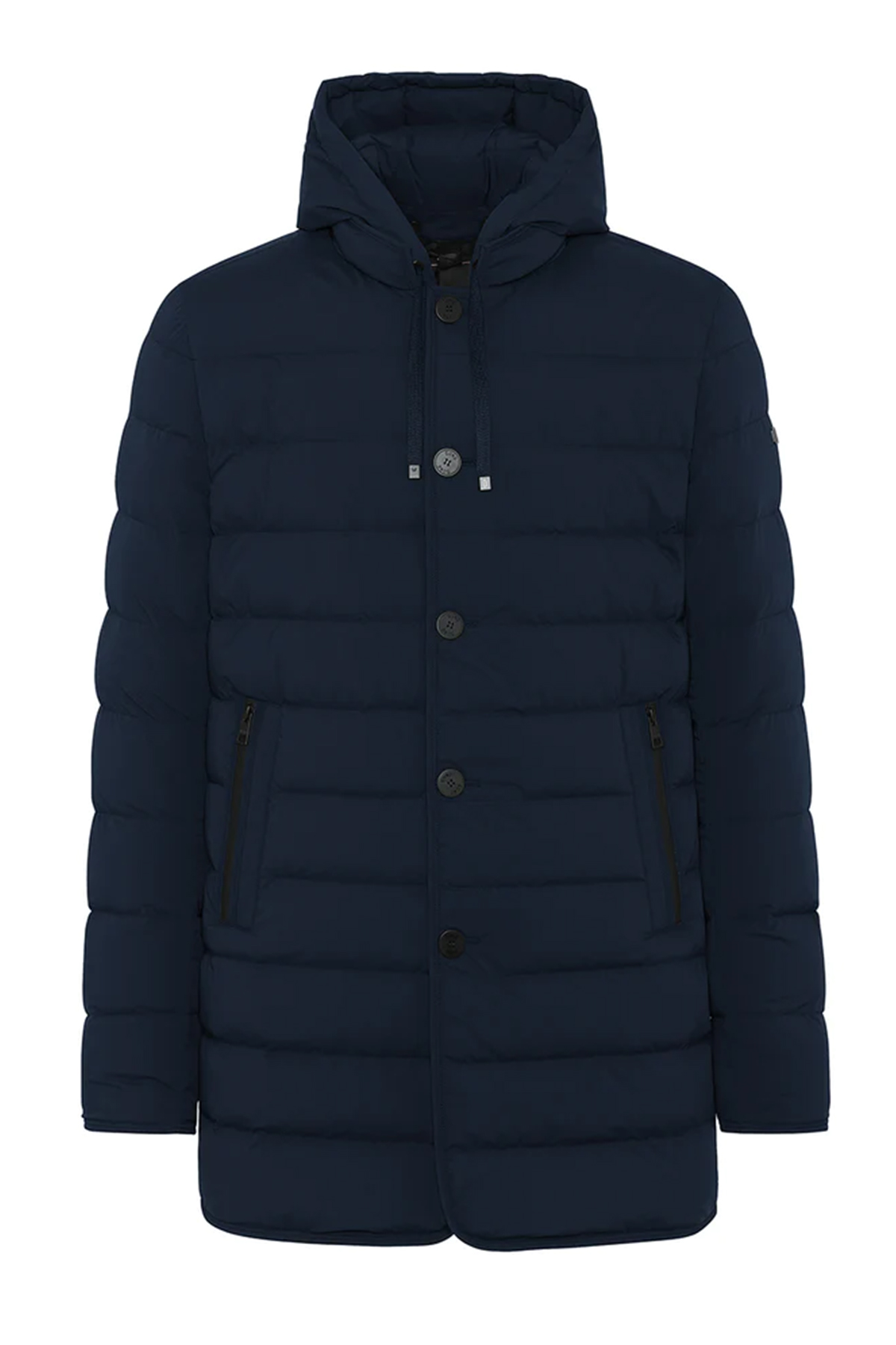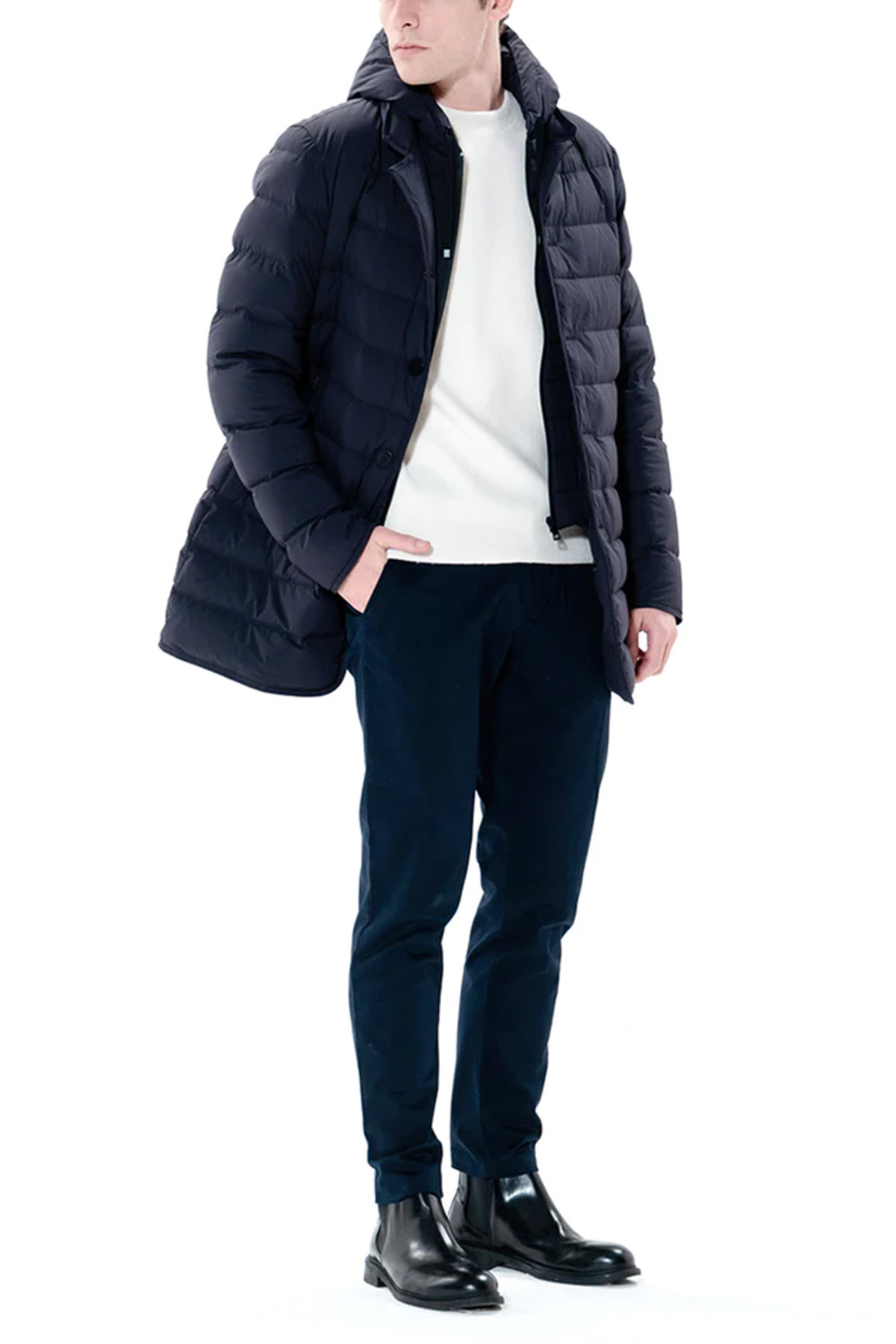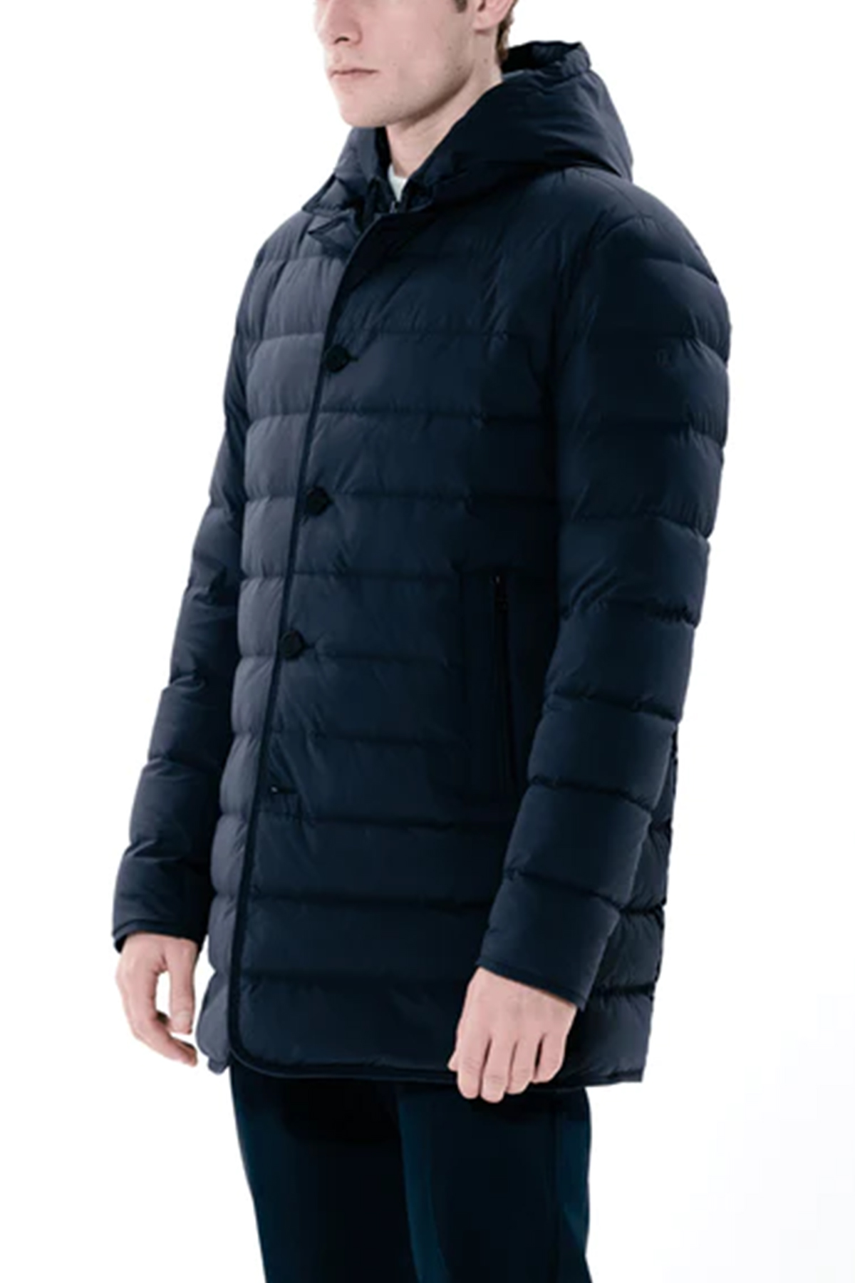 Lang gewatteerd donsjack van bi-stretch technische stof, met afneembare slab en capuchon met waterbestendige ritssluiting en trekkoord, opstaande kraag, knoopsluiting aan de voorkant, paspelzakken met waterbestendige ritssluiting en multifunctionele binnenzakken. Samenstelling: 83% Polyamide 17% Elastaan Vulling: 90% Dons 10% Veer