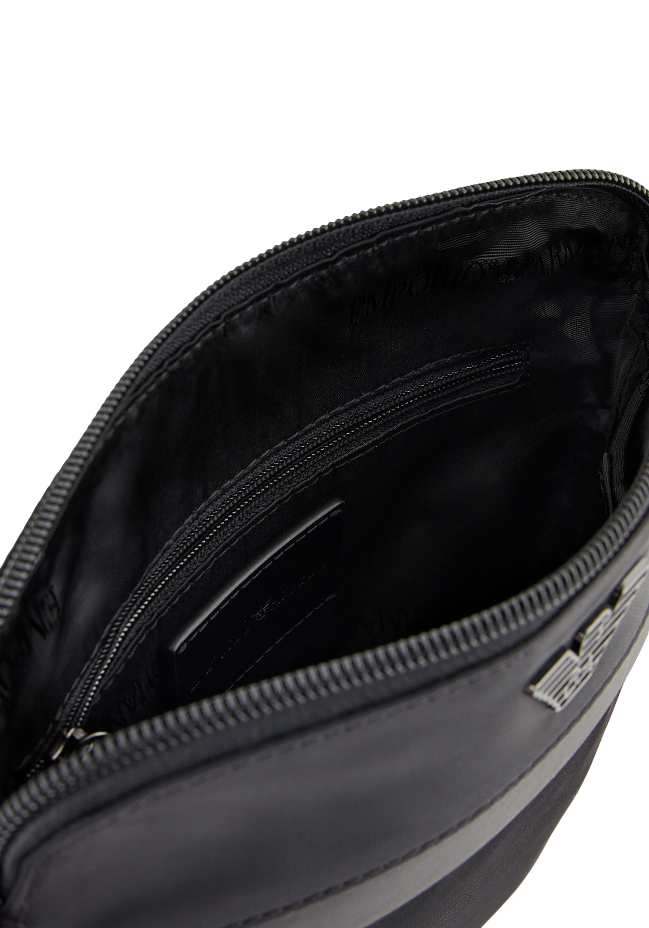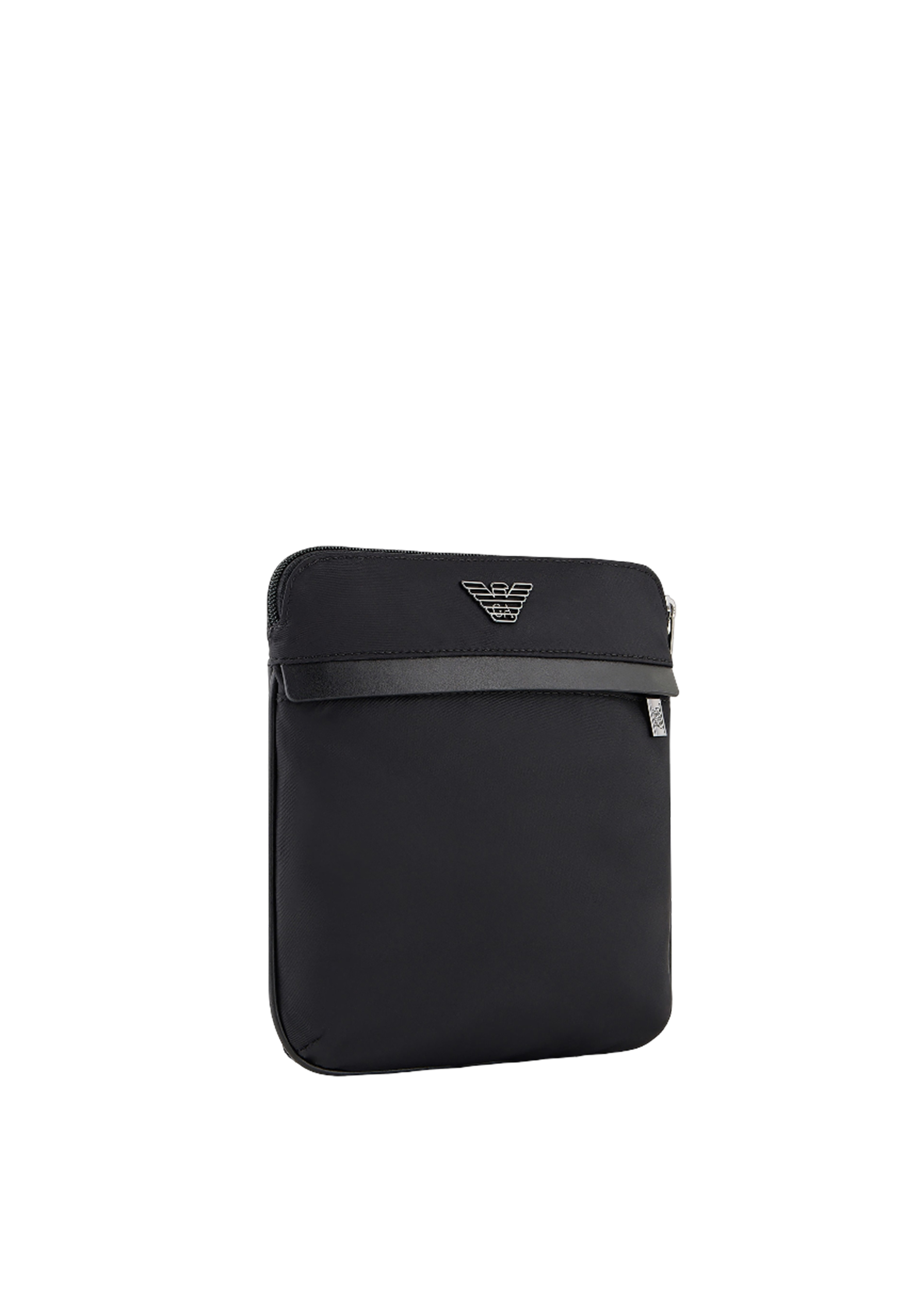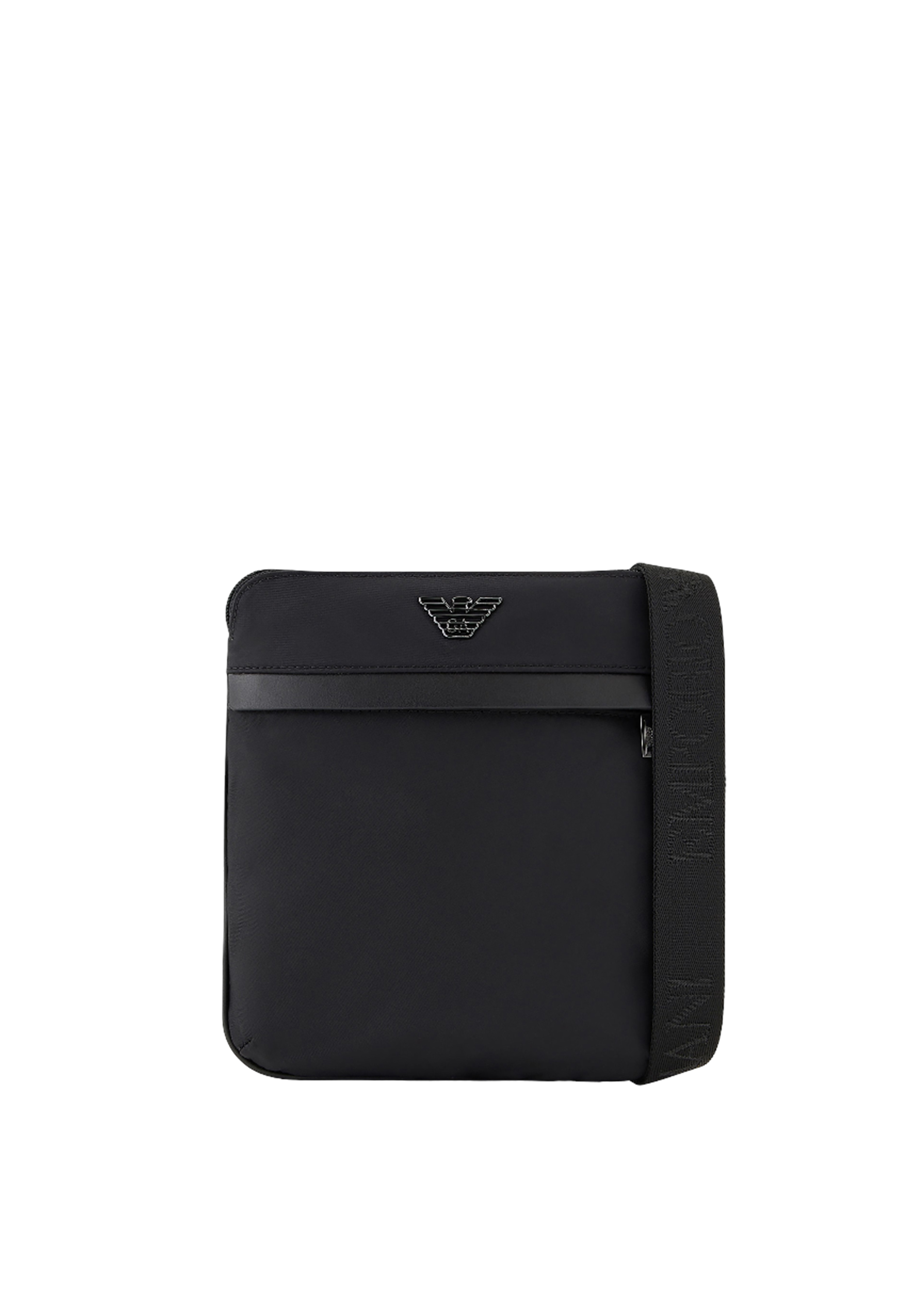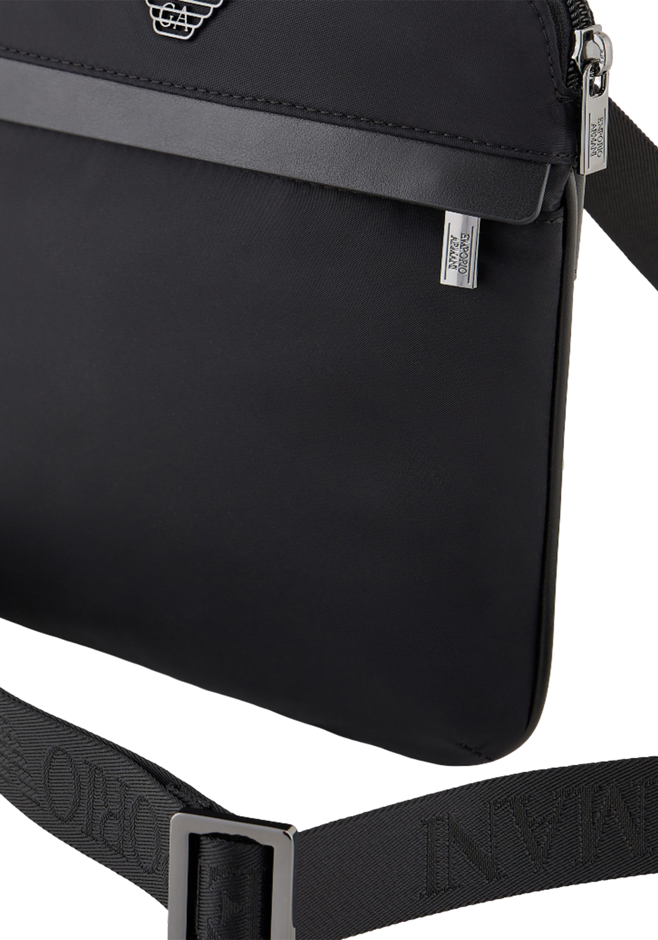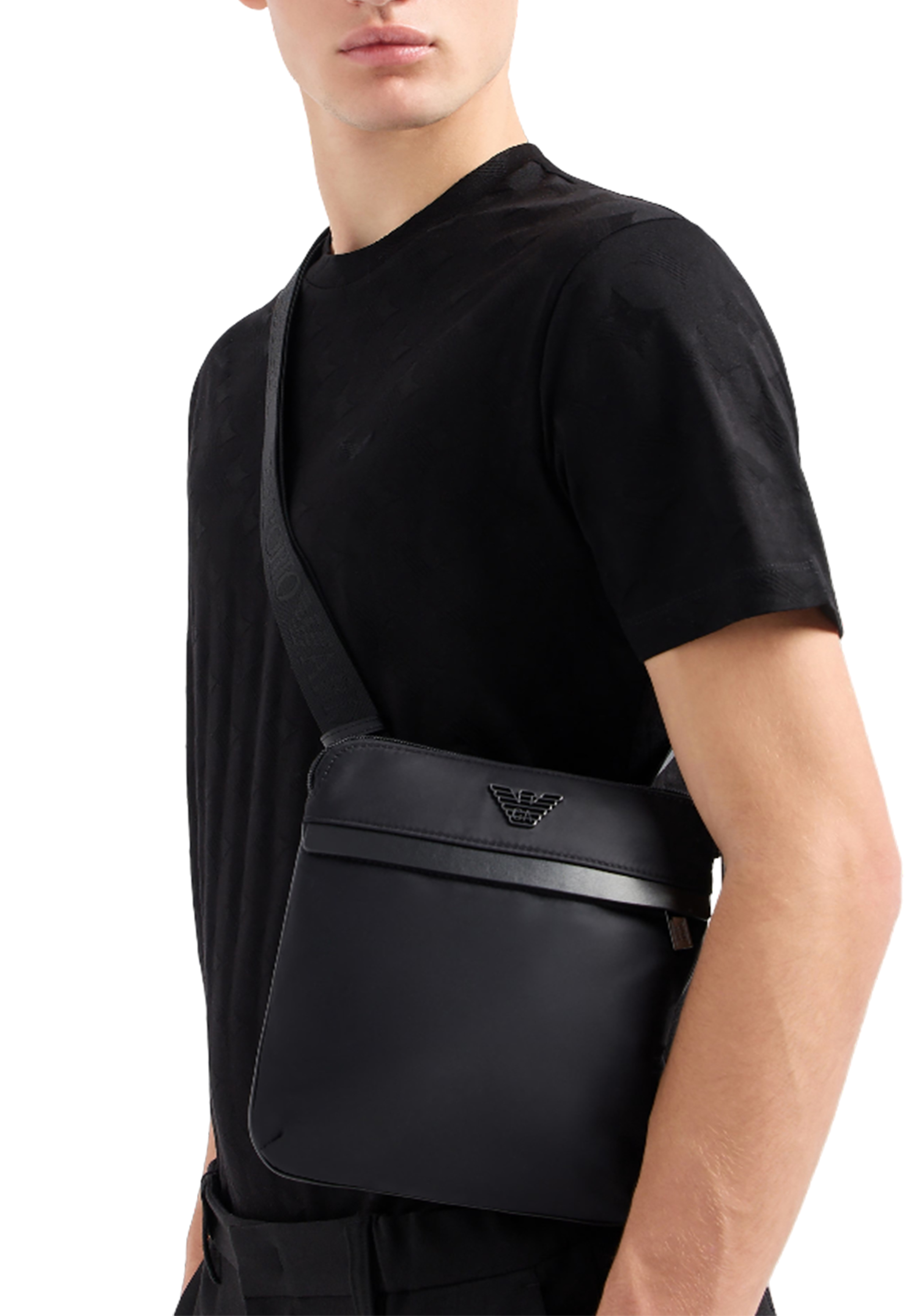 Platte crossbody in gerecycled nylon, met ritssluiting, buitenvak met ritssluiting en verstelbare logoband. Het ontwerp is lineair en eigentijds, met een zeer stedelijke aantrekkingskracht, voor een lijn van nylon items, gemaakt met gecertificeerd gerecycled materiaal, met geregenereerde lederen details en metaalvormige adelaar logo. Een familie van accessoires die het milieuvriendelijke en duurzame pad bevestigt dat het Maison al enige tijd volgt.
