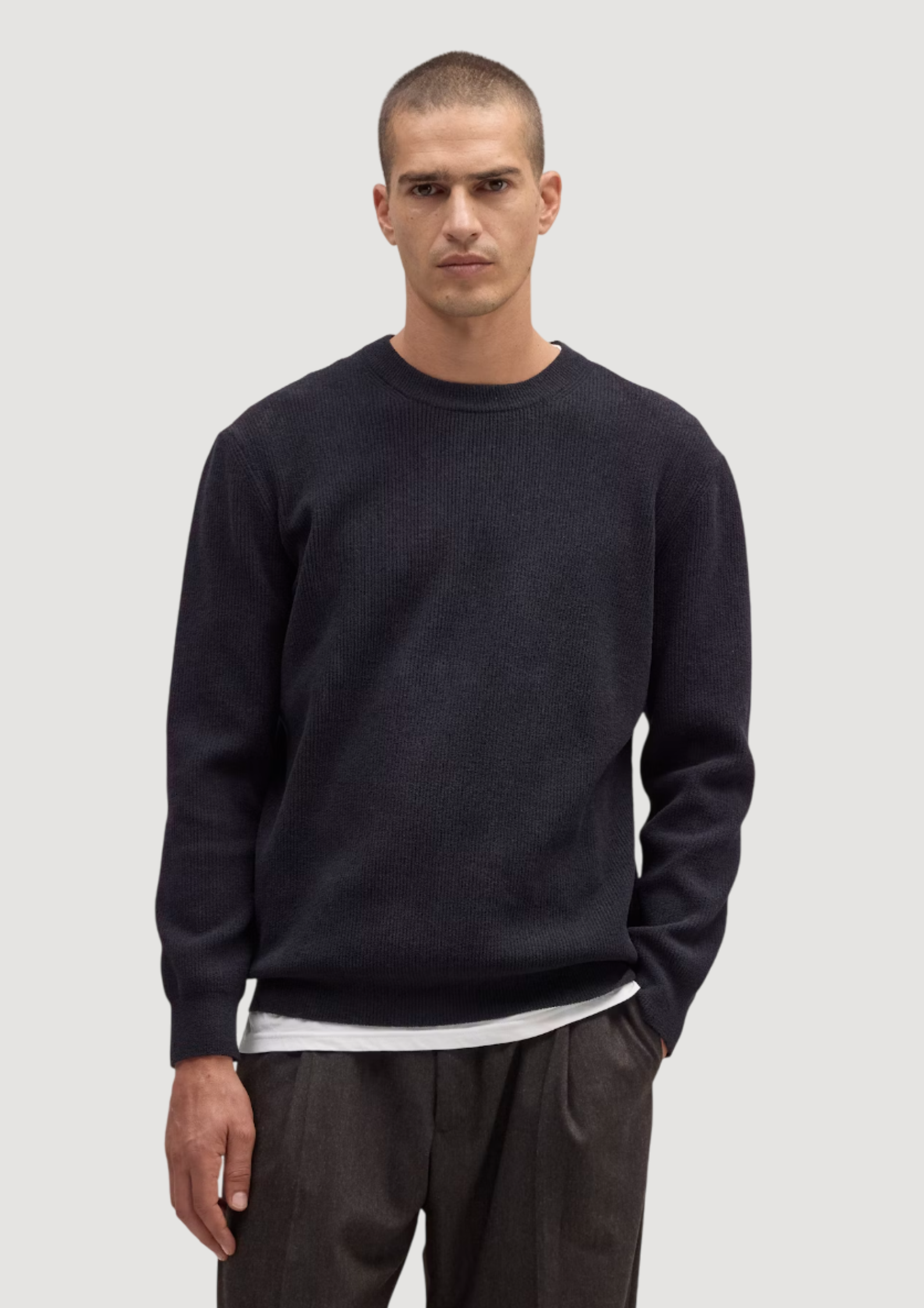 Een soft crew hals trui gemaakt van een lichtgewicht polyester mix, met fijn geribde afwerking en modieuze details langs de mouwen en halslijn.