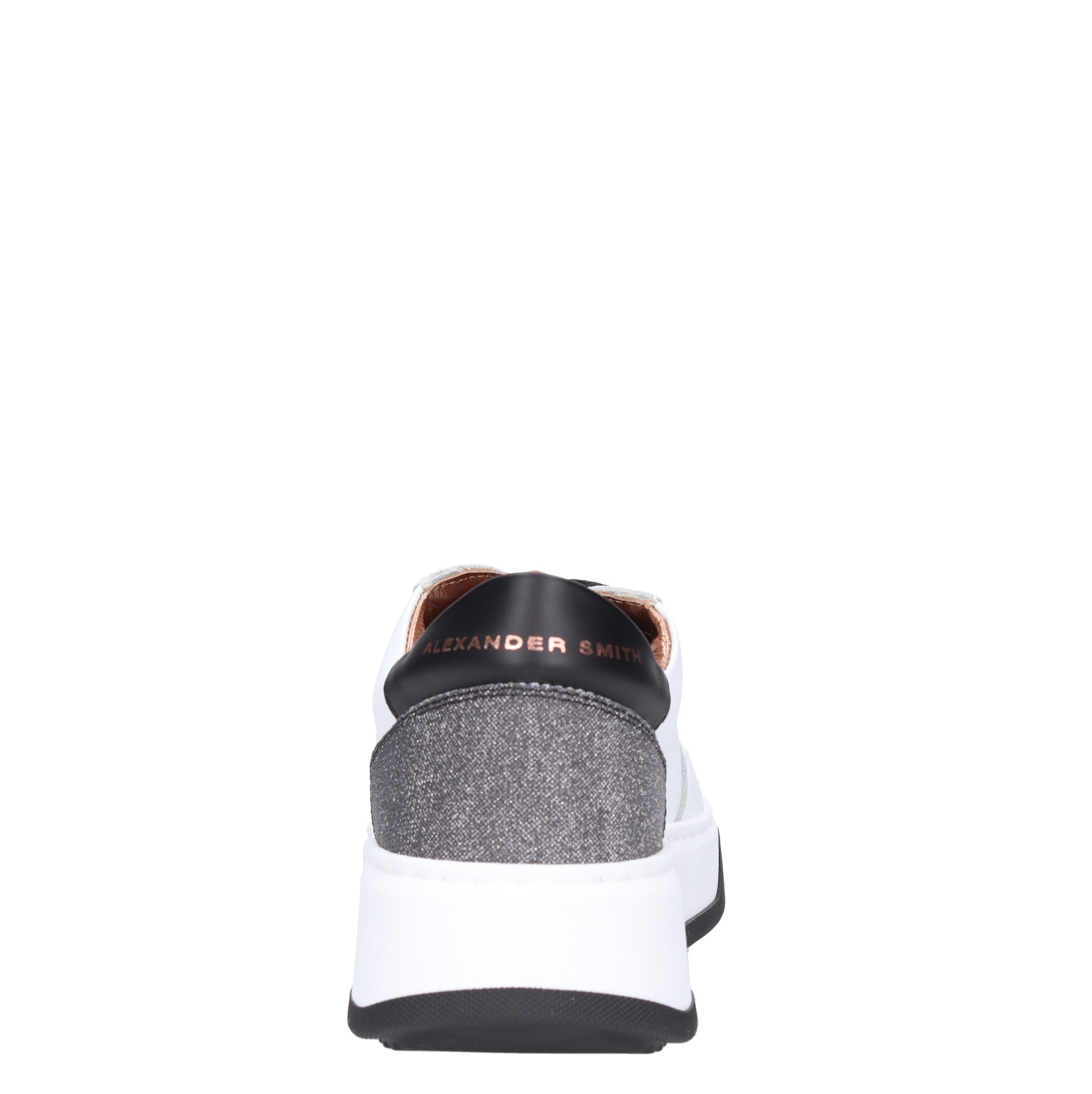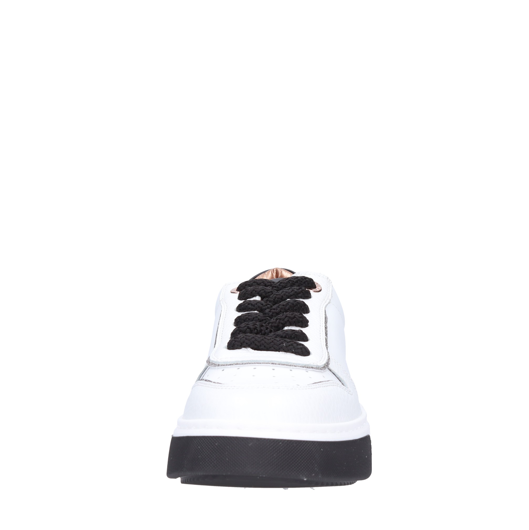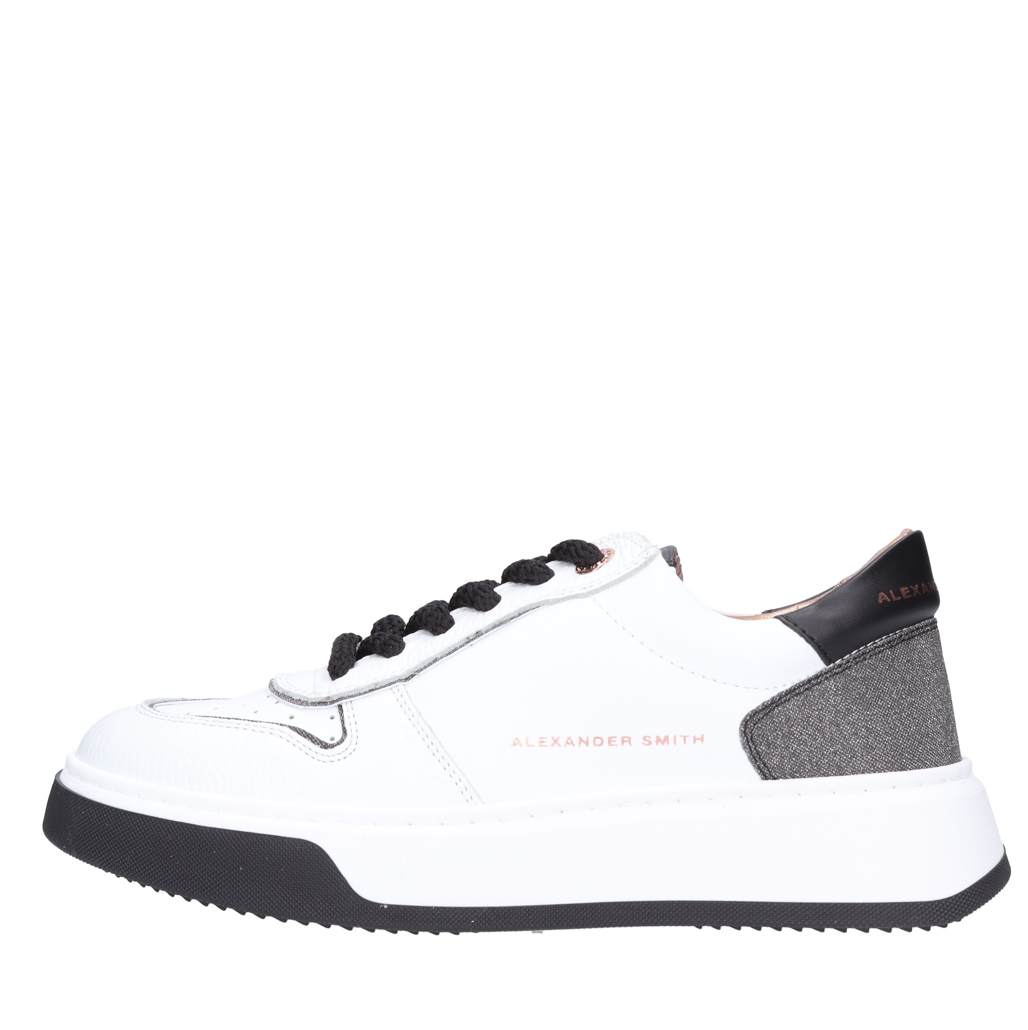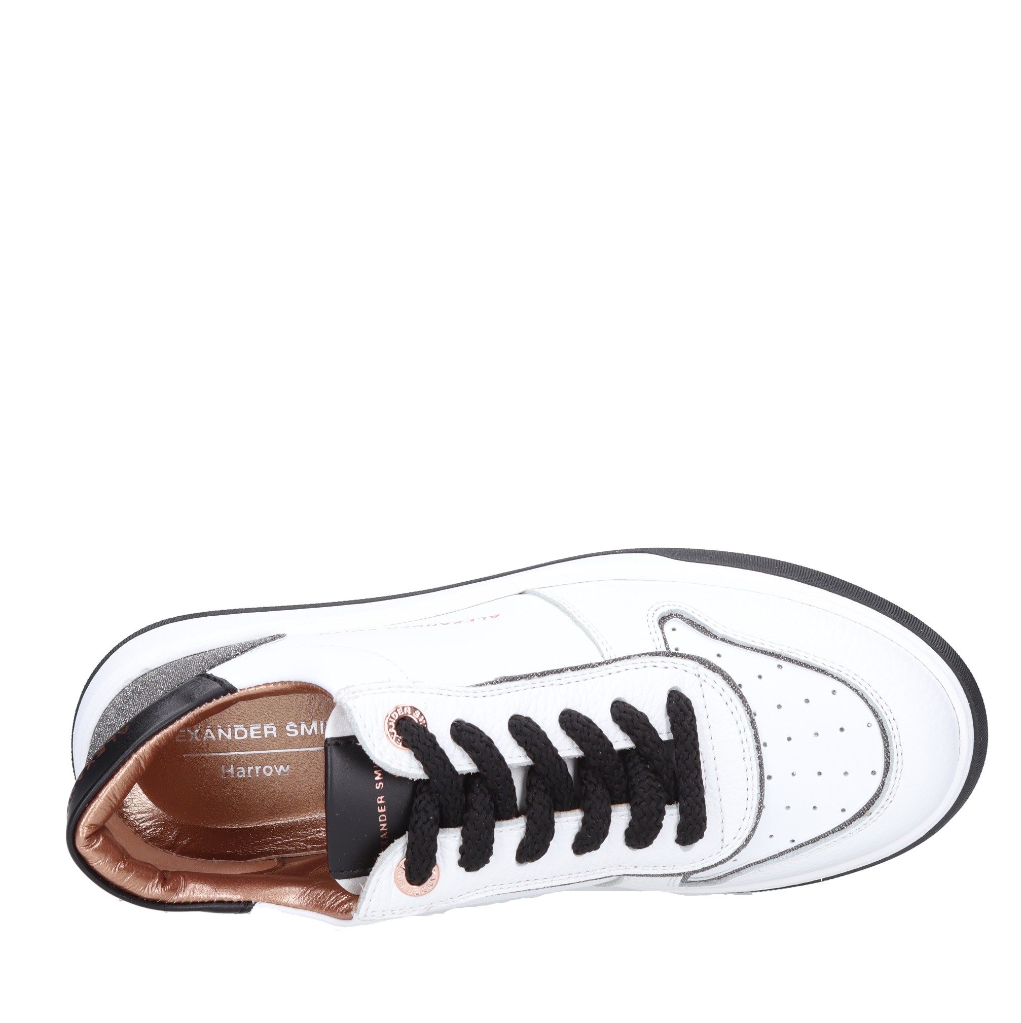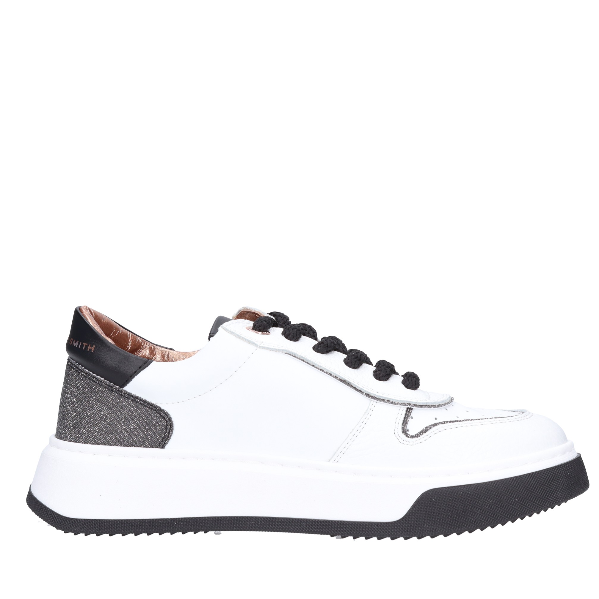 Leren sneakers. Rubberen buitenzool. Intern leren bovenwerk. Zwarte en glitter inzetstukken.