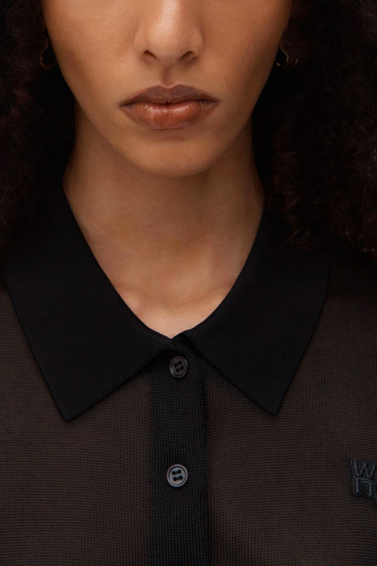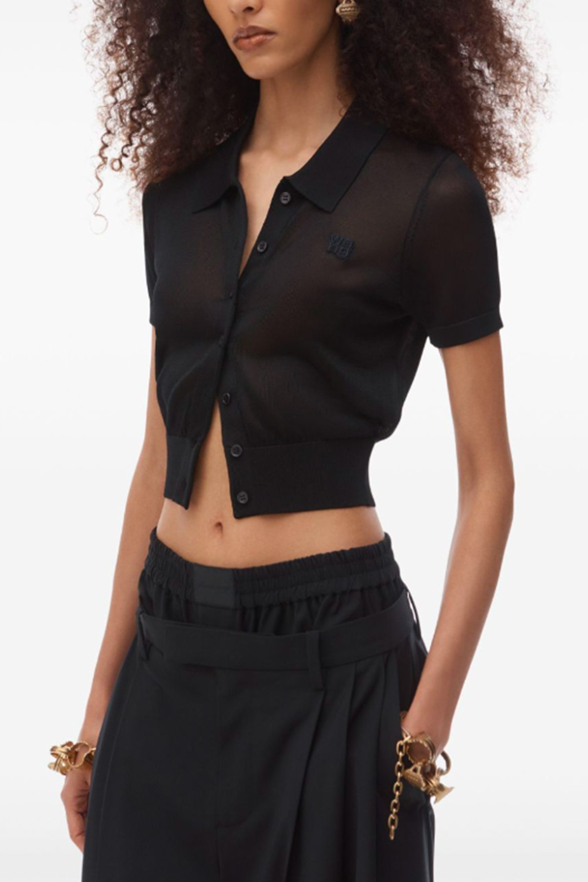 Fijn breipatroon, logo op de borst, polo stijl van de kraag, voorste sluiting met knopen, korte mouwen, geribde rand, design gewas. 100% Viscose samenstelling
