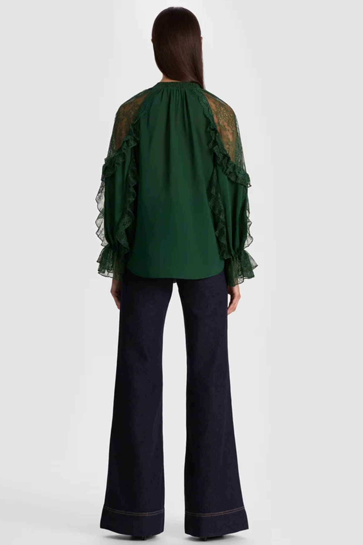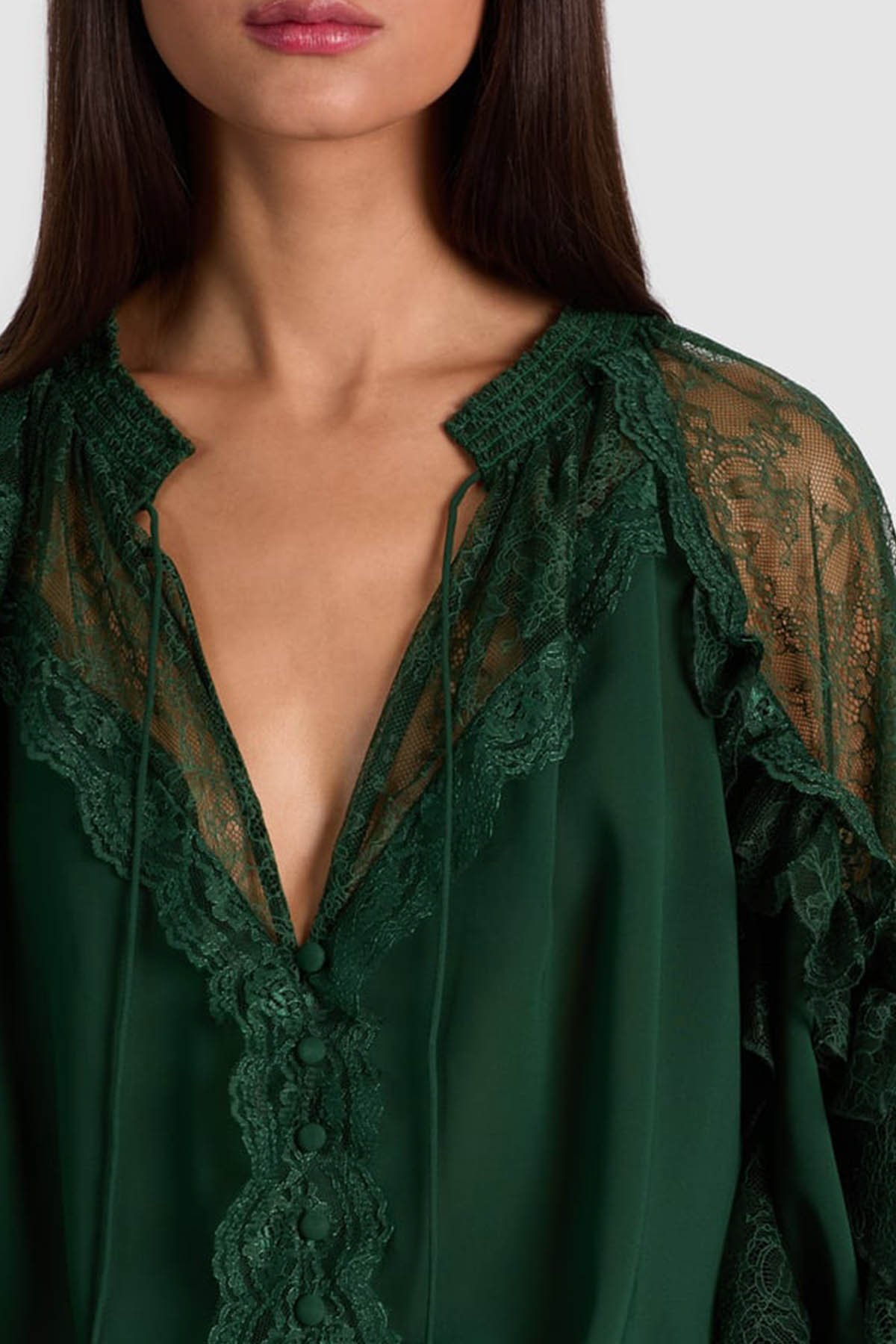 Kantmodel met volante, V-hals, lange mouwen, voorste knopen, transparantie op de schouders, elastische manchetten. Samenstelling 64% azijn, 36% polyester