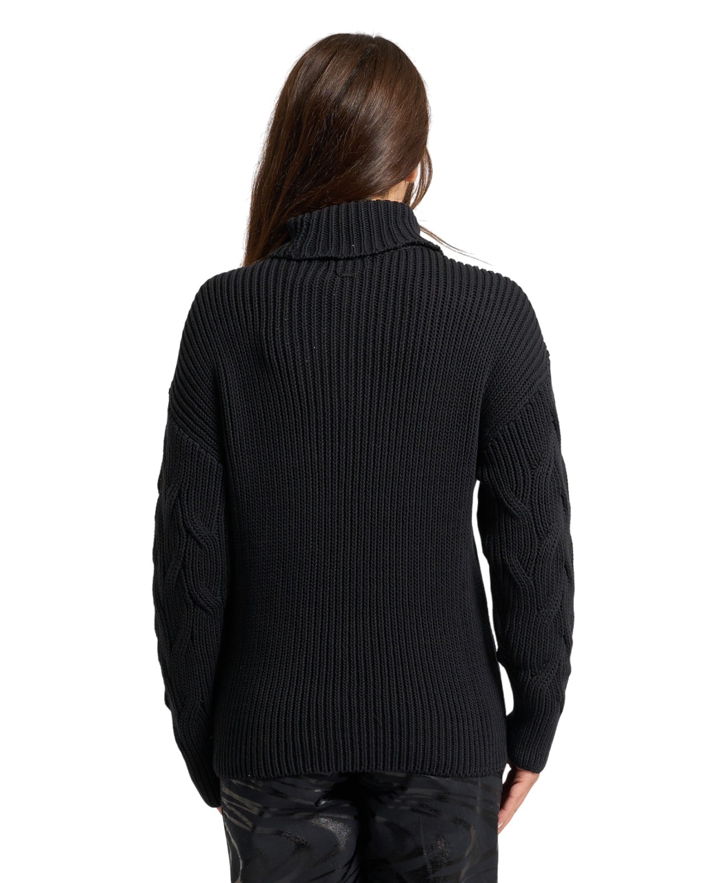 Doe een dikke knuffel om. Deze zwarte color colurtrui is je nieuwe gezellige ritueel. Rijke texturen, maximaal comfort. Perfect voor Netflix nachten of een koffie op de vlieg. Een grote coltrui. Comfortabel en ontspannen fit. Vlechtpatroon op voorkant en mouwen. Stof: 74% katoen, 26% polyester