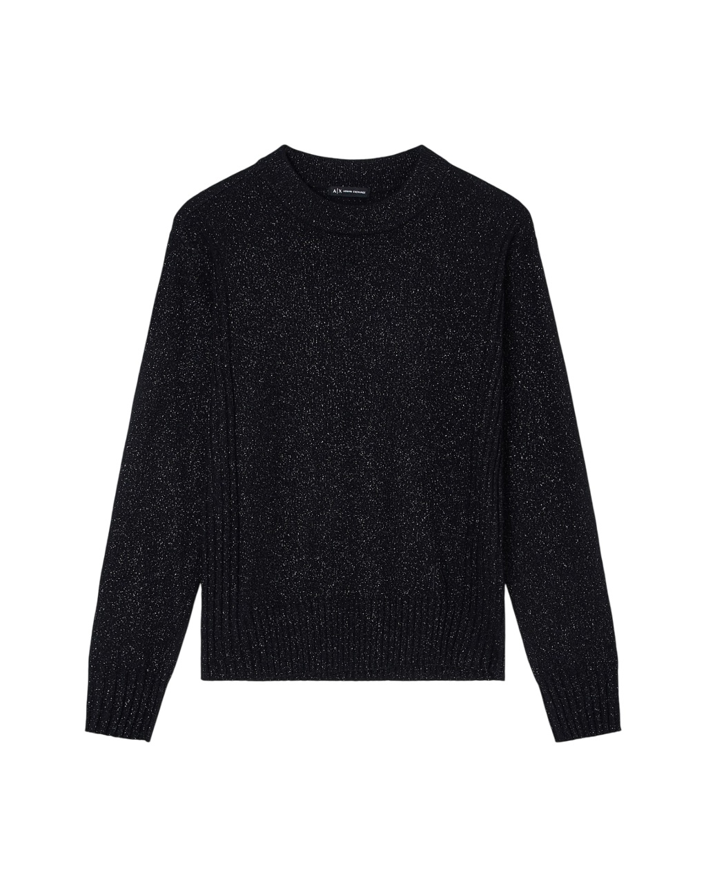 Vrouwentrui Armani Exchange in zwart garen met briljante lurex afwerking, perfect om een vleugje licht toe te voegen aan uw dagelijkse look. Het essentiële ontwerp met ronde hals en lange mouwen is verrijkt met geribde randen op manchetten en bodem, die een comfortabele en verfijnde pasvorm geven. Productgegevens: Kleur: Zwart met zilveren lurex draad Klassieke ronde hals Lange mouwen Geribde randen op de bodem en manchetten Regular fit Logo Armani Exchange discreet Een veelzijdig kledingstuk, ideaal voor een casual-chic outfit met jeans en laarzen, zowel voor de avond gekoppeld met elegante broek of midi rokken.