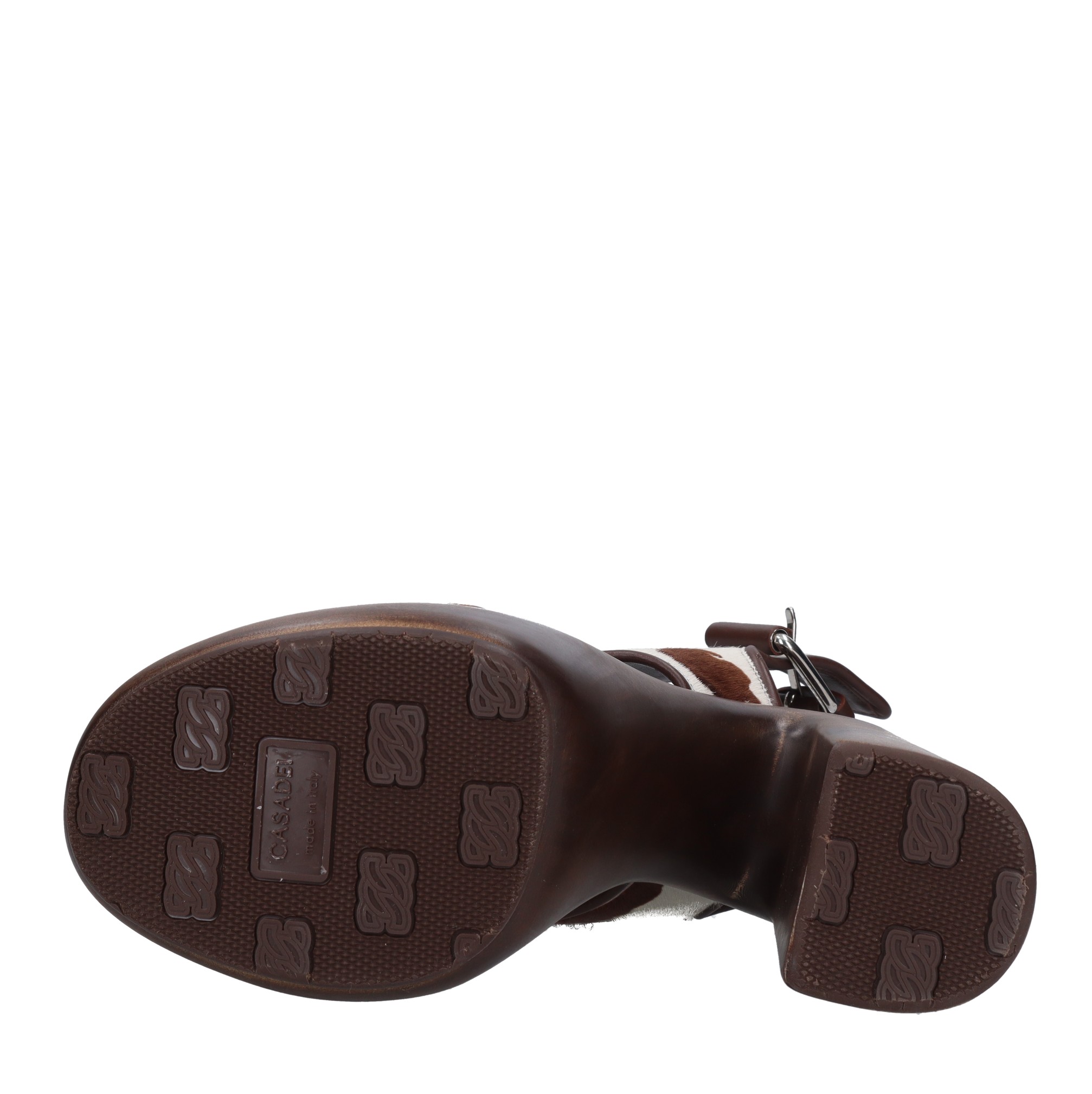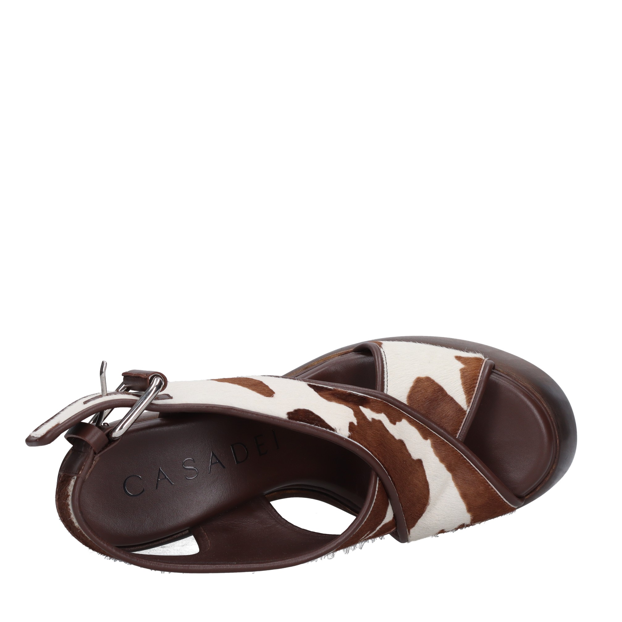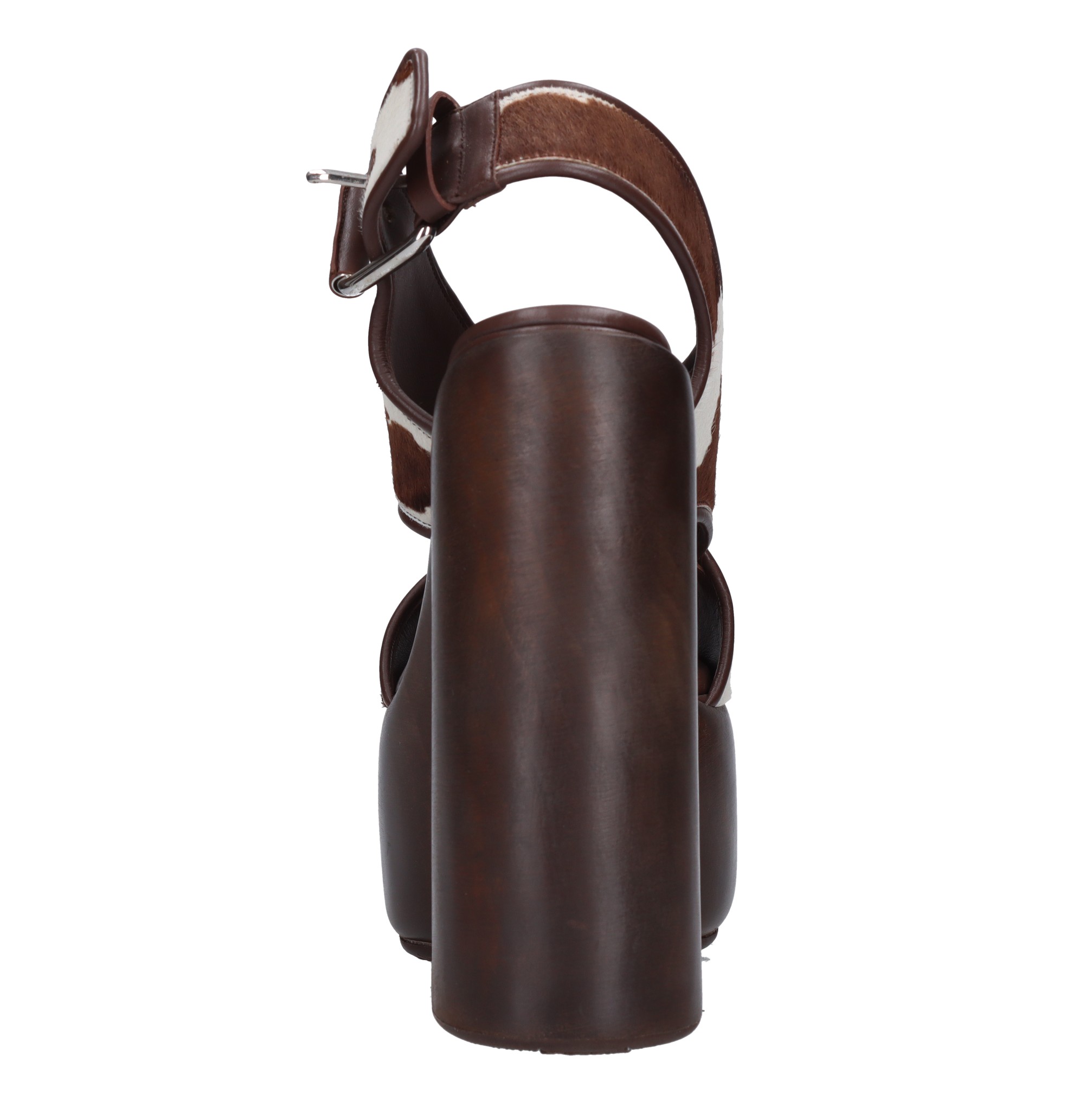 Sandalen van ponyhaar. Plateau: 7 cm. Rubberen buitenzool. Intern leren bovenwerk. Hout met vintage effect. Monsters. Wordt verzonden in een neutrale doos.