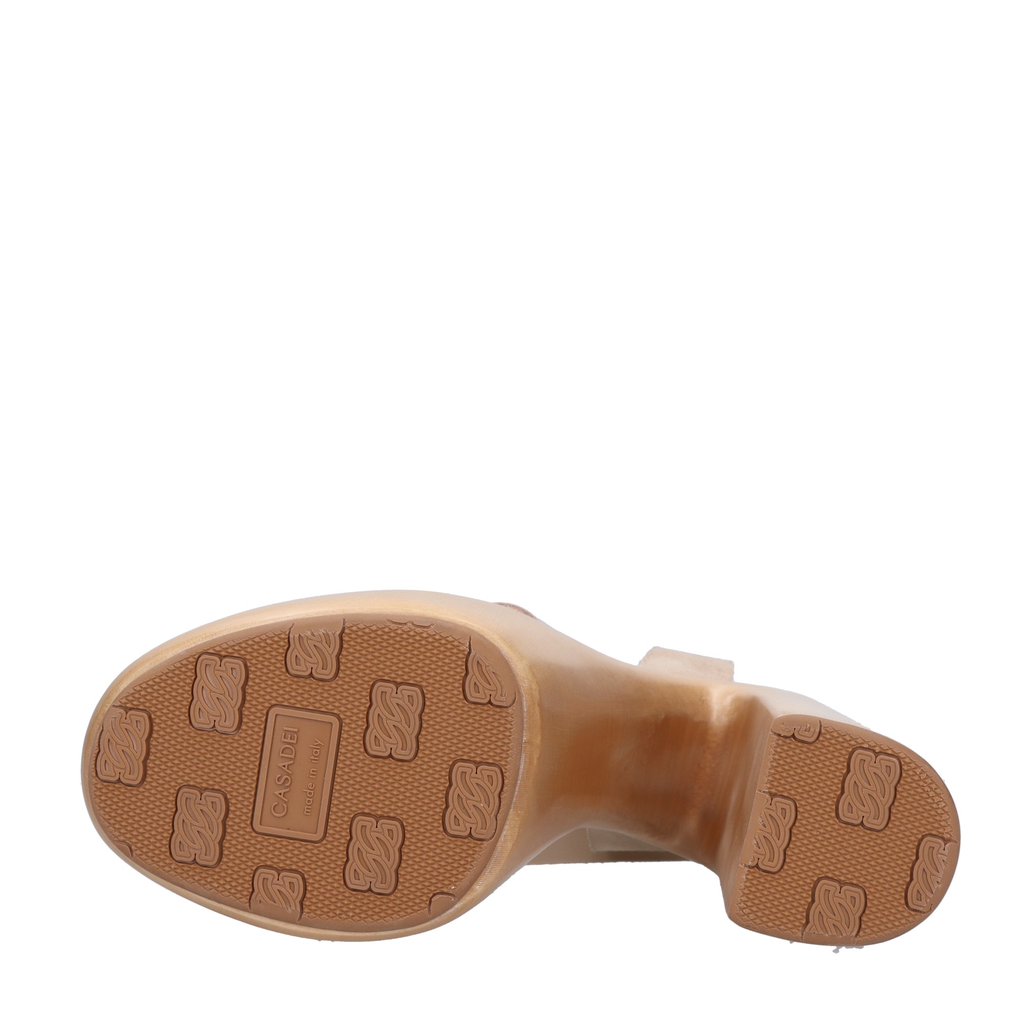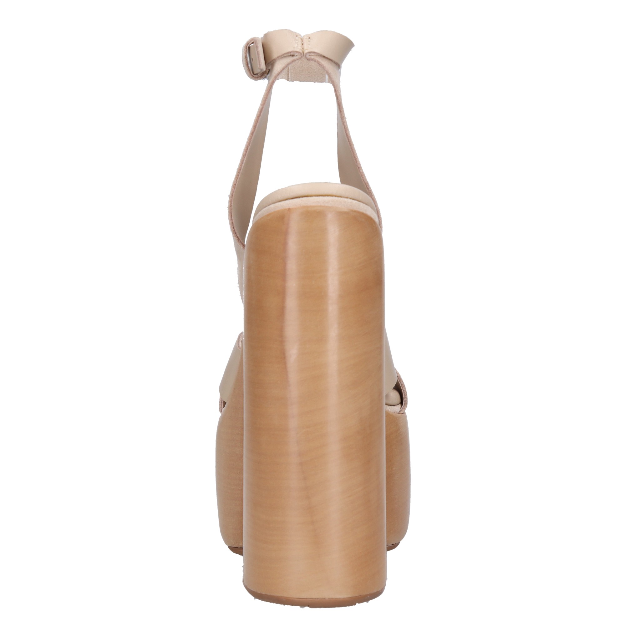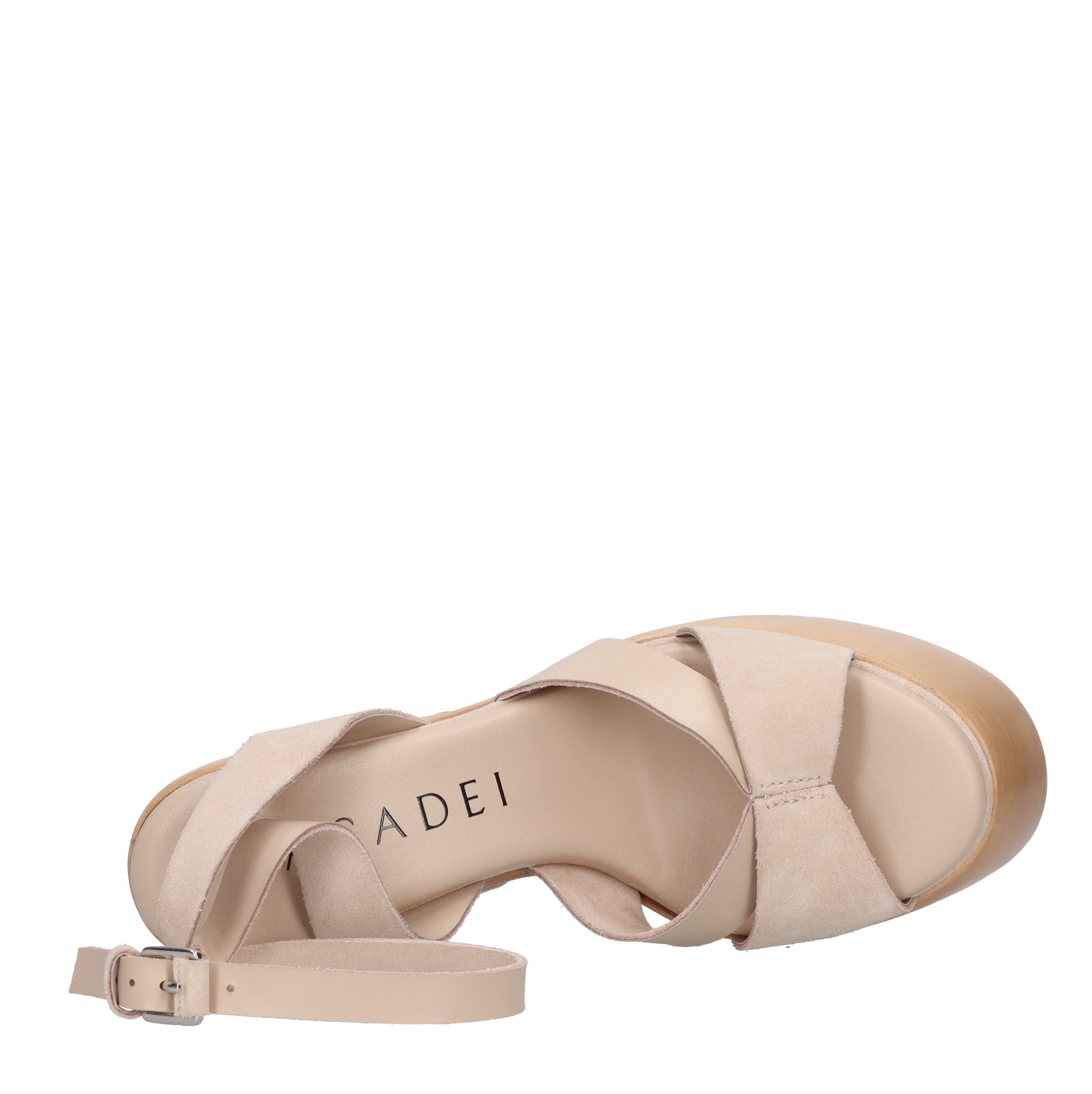 Sandalen van leer en suède. Plateau: 7 cm. Rubberen buitenzool. Intern leren bovenwerk. Kleine imperfecties op het leer en hout. Vintage-effect. Monsters. Wordt verzonden in een neutrale doos.