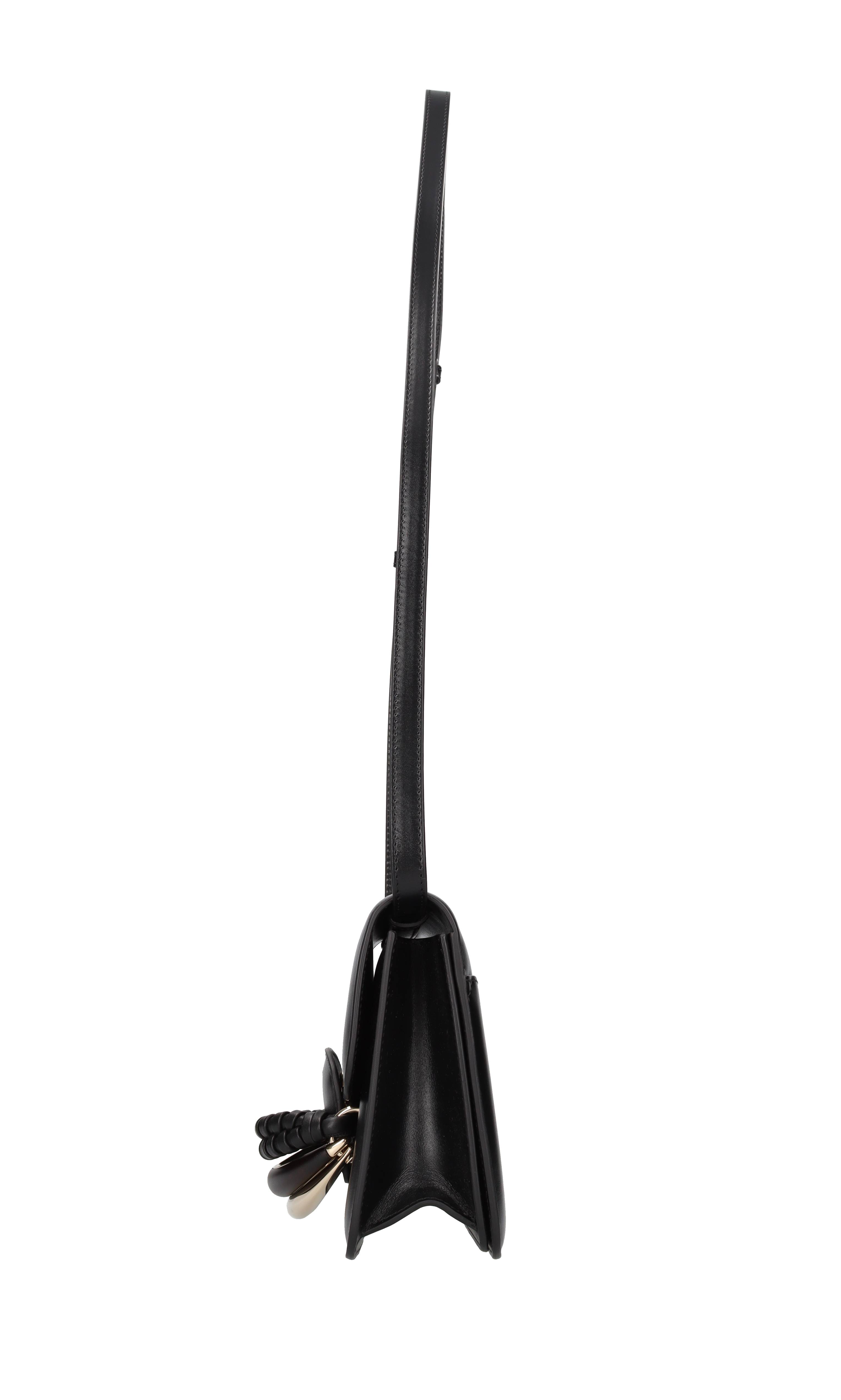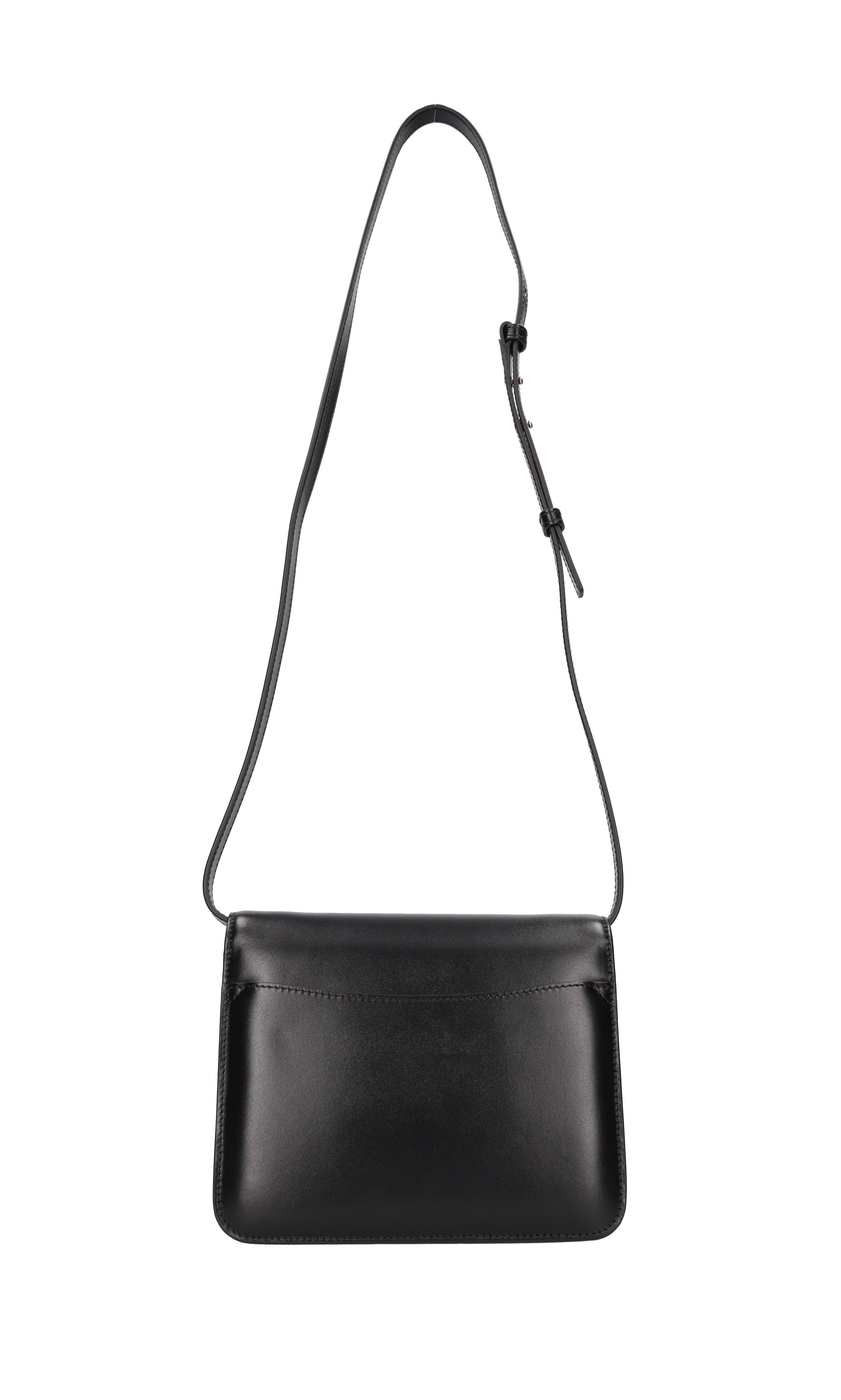 Leren tas. 1 compartiment. Sluiting met klep en drukknoop. Afneembare en verstelbare lederen schouderband met gesp.