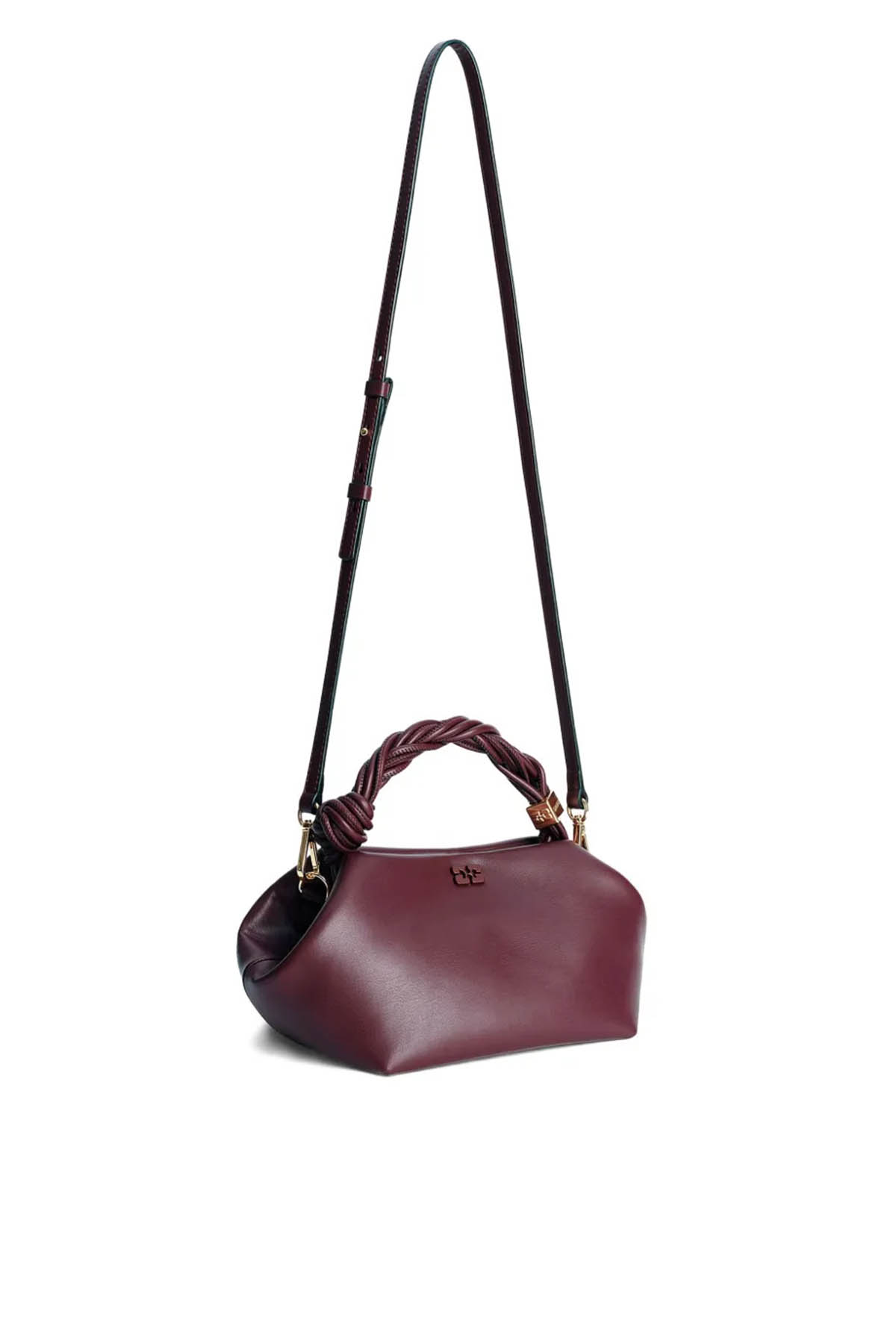 Gerecycleerd leer model, gouden kleur details, logo plaat, magnetische sluiting, verstelbare en verwijderbare schouderband, gevlochten handvat, binnenste compartiment, interne split zolder. Samenstelling gerecycleerd leder 65%, polyurethaan 19%, polyester 16%