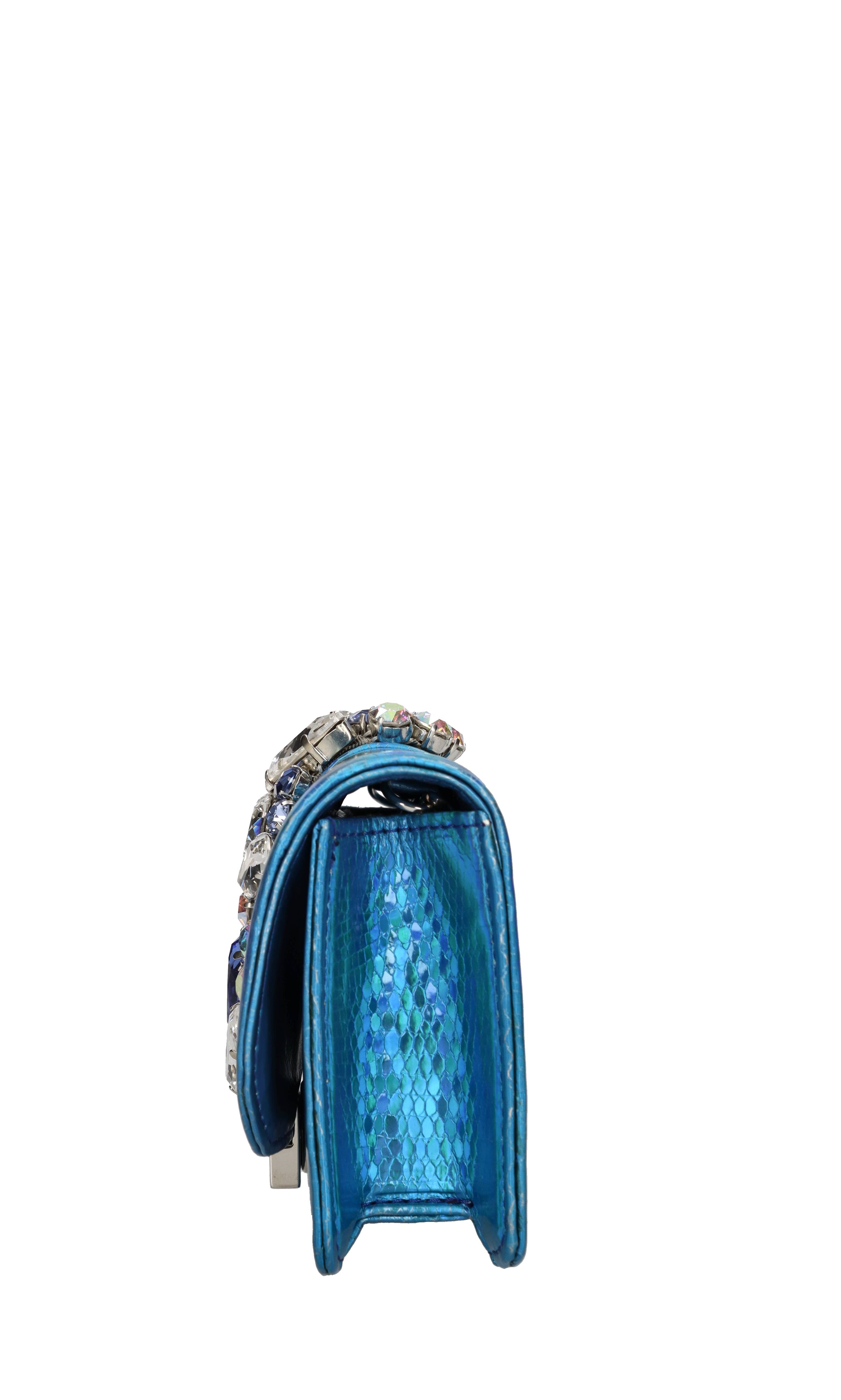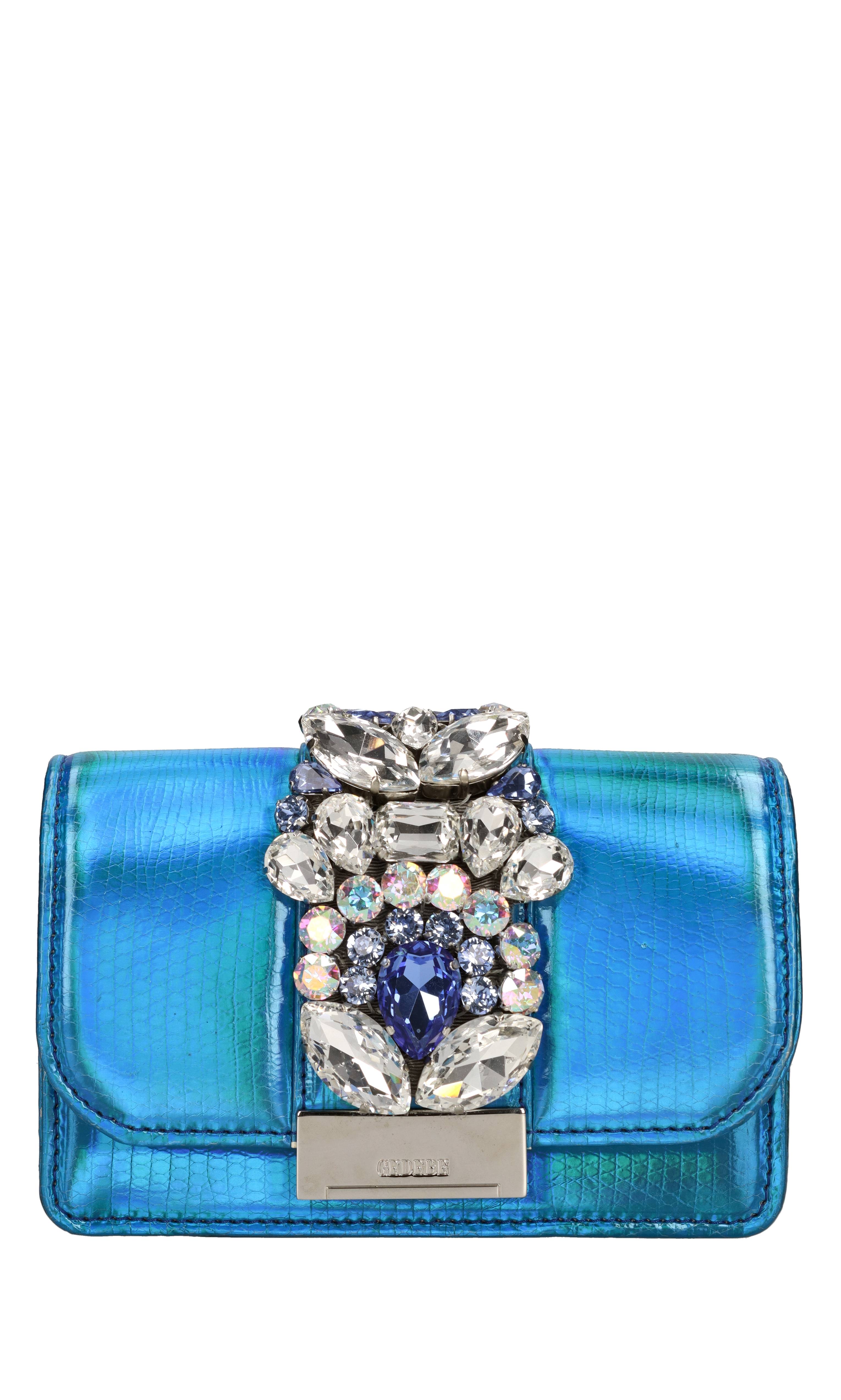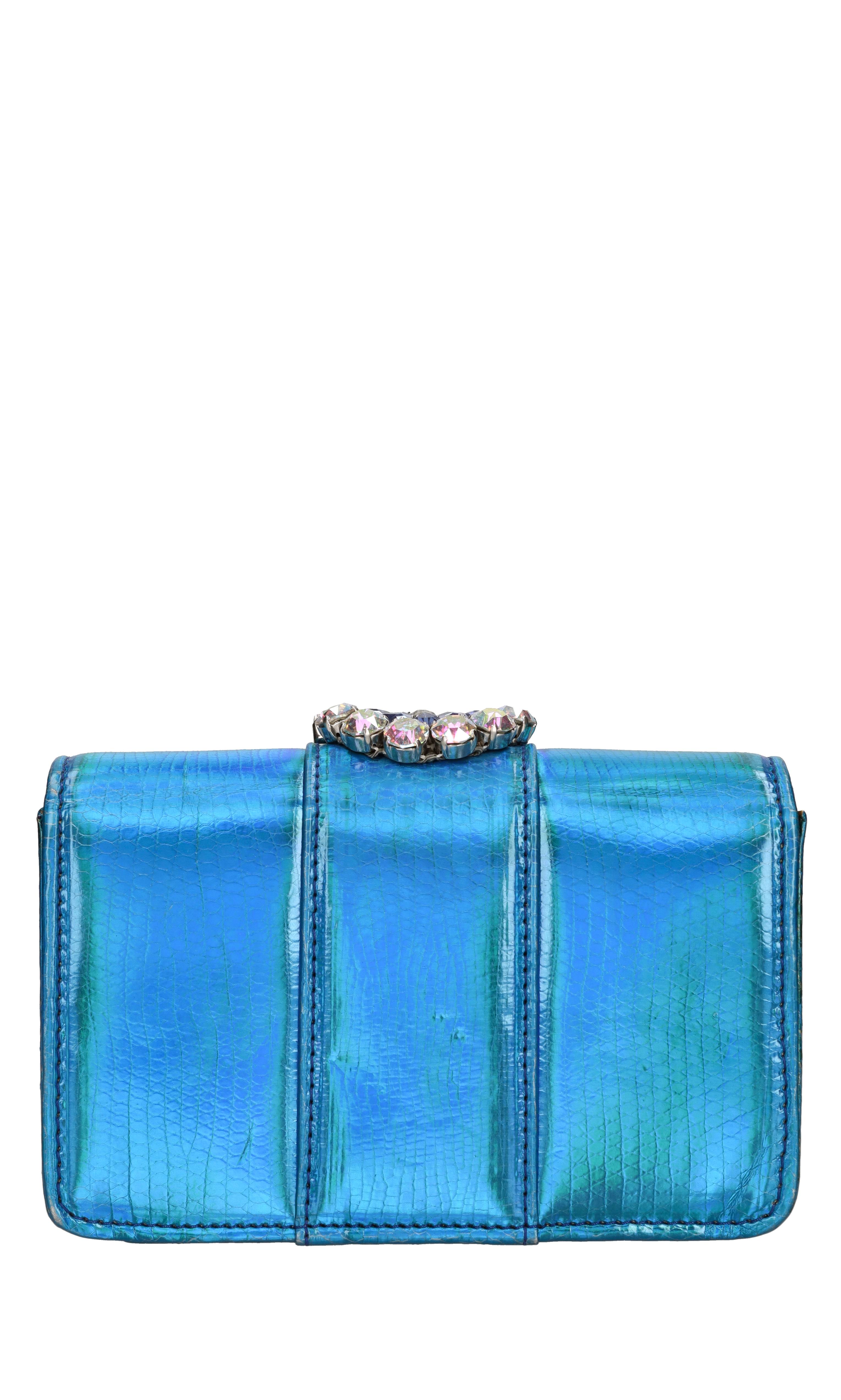 Mini Cliky leren tas. Een compartiment. Juweelsluiting. Magnetische knoopsluiting en flap. Zilveren ketting schouderband. Monsters. Kleine sporen op het leer.