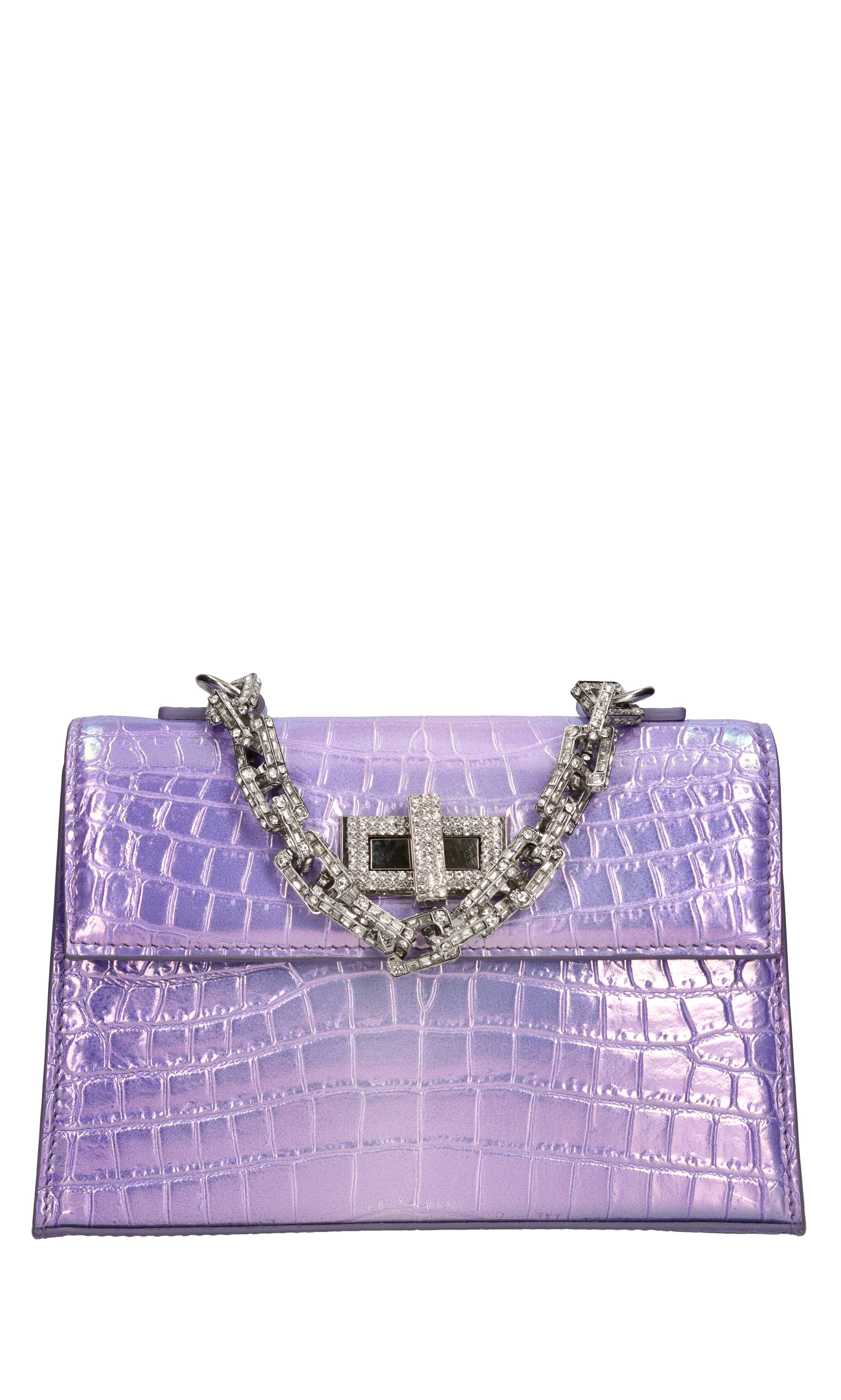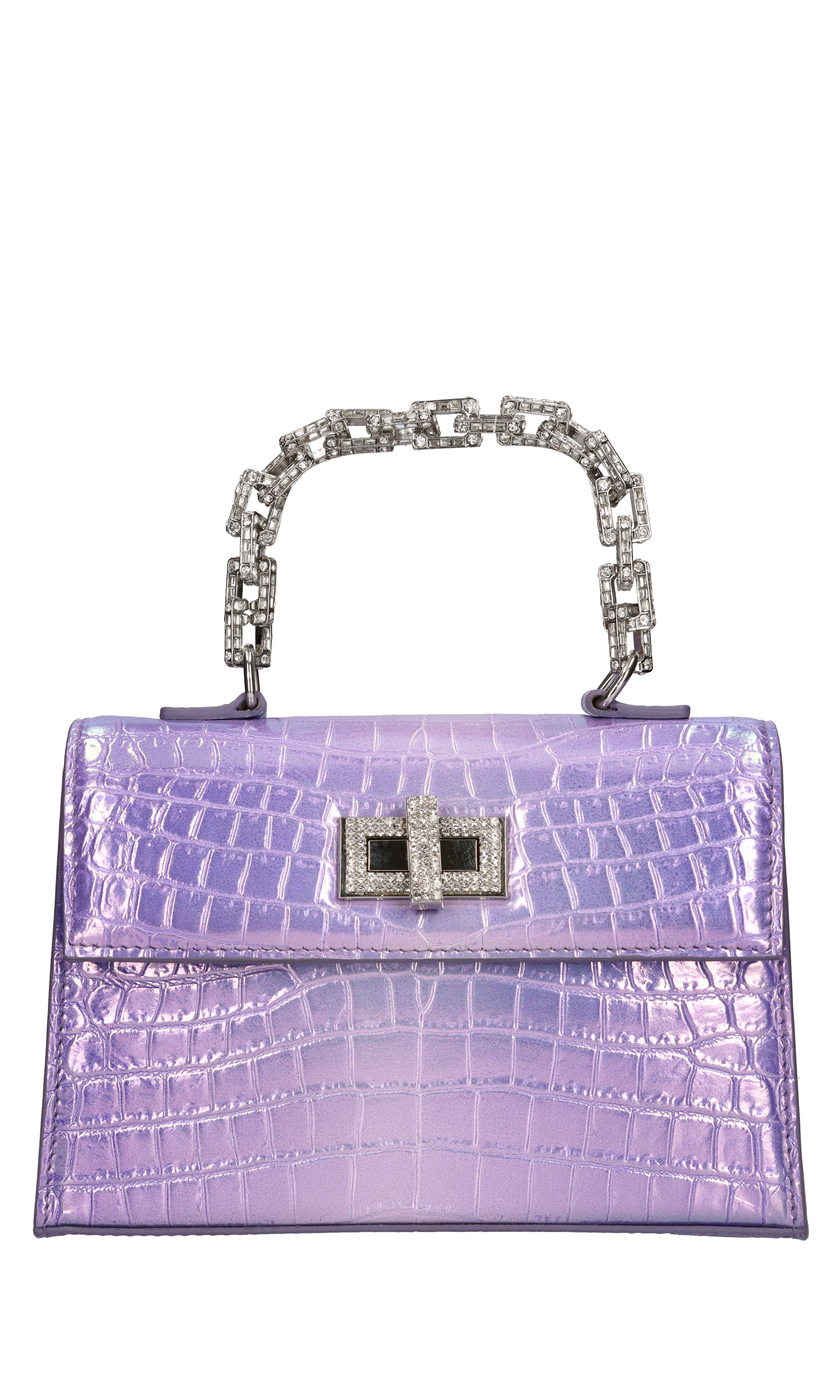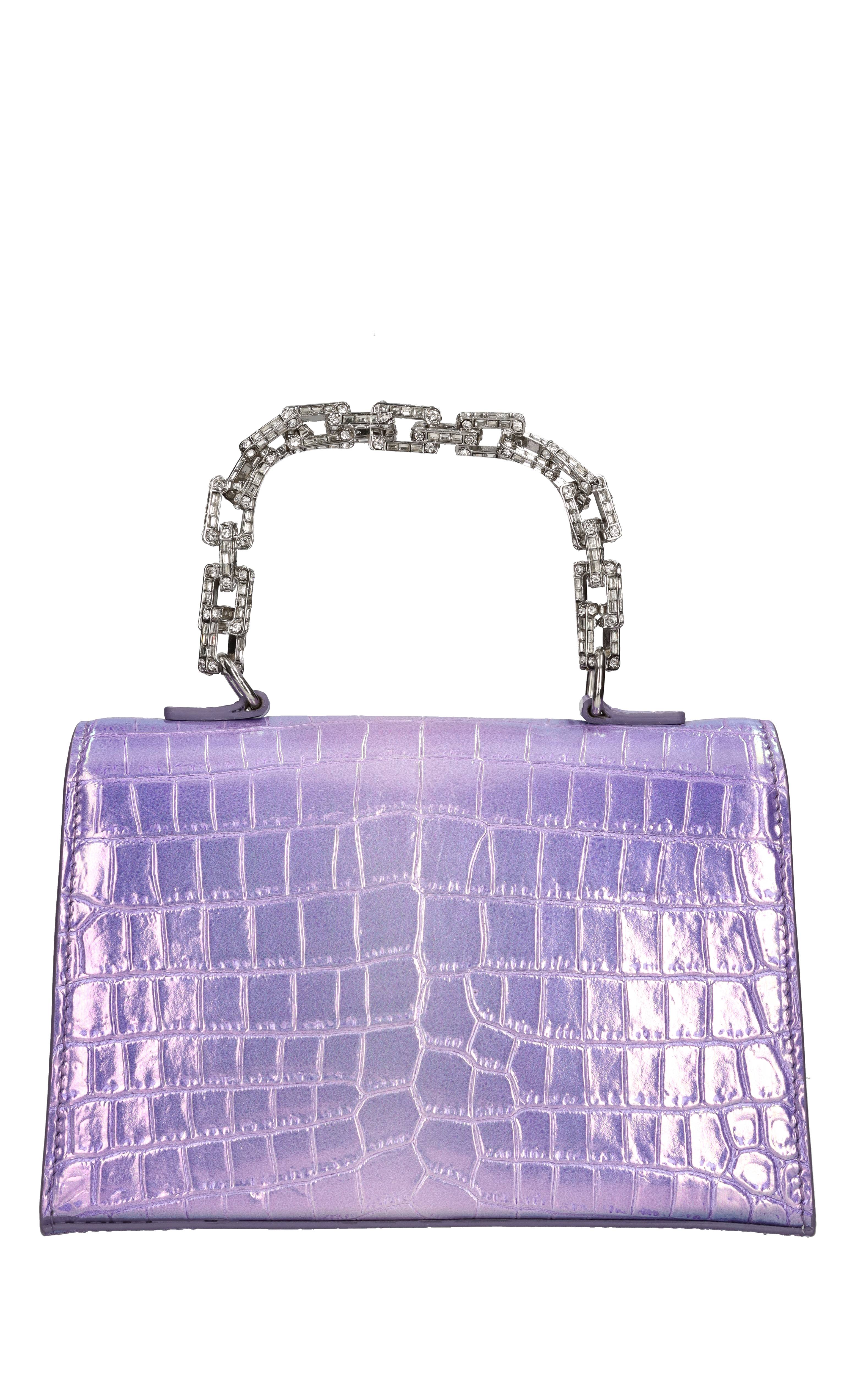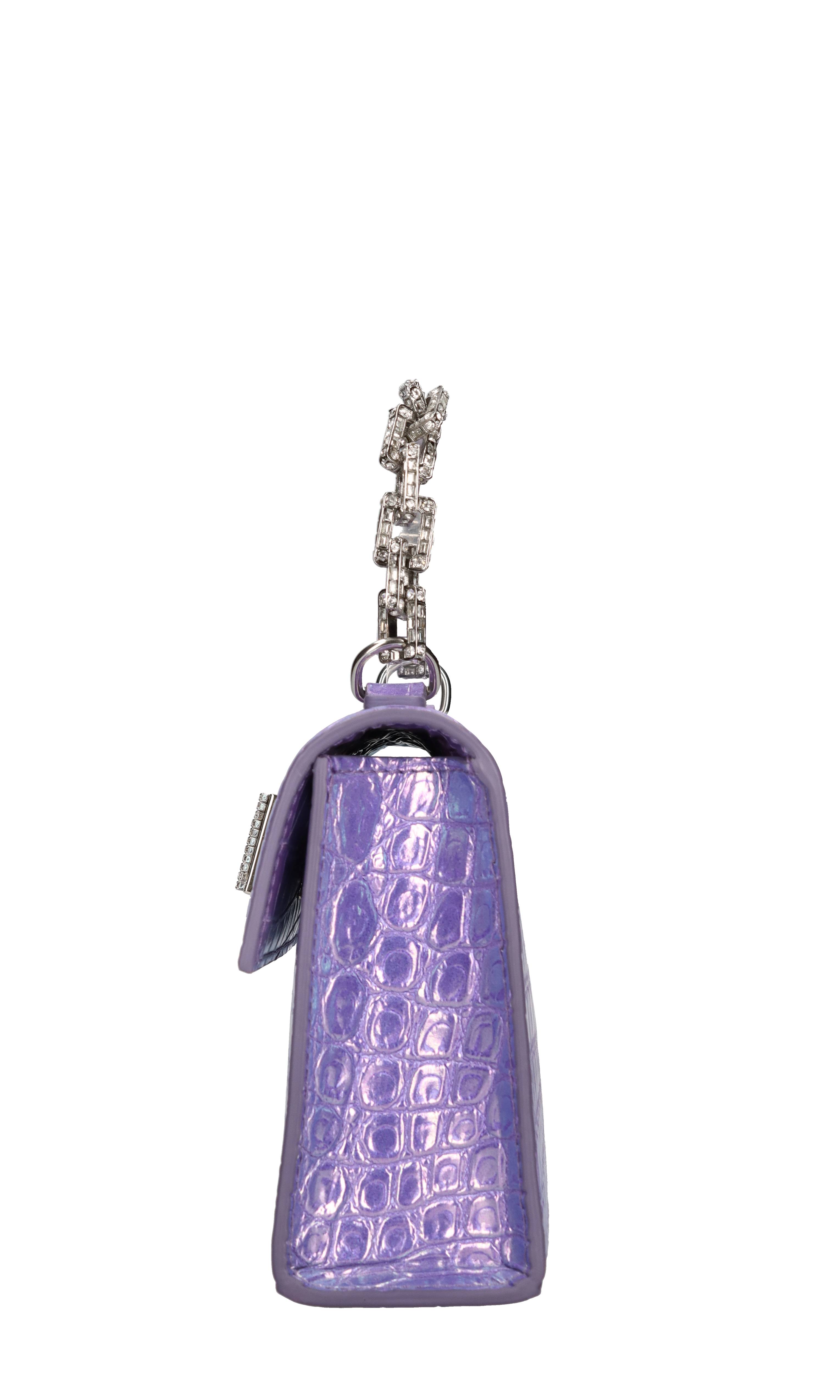 Mini Sophie handtas in leer. Snap sluiting met juweel gesp. Een compartiment. Afneembare leren schouderband. Jewel ketting handvat met toegepaste strass stenen. Monsters.