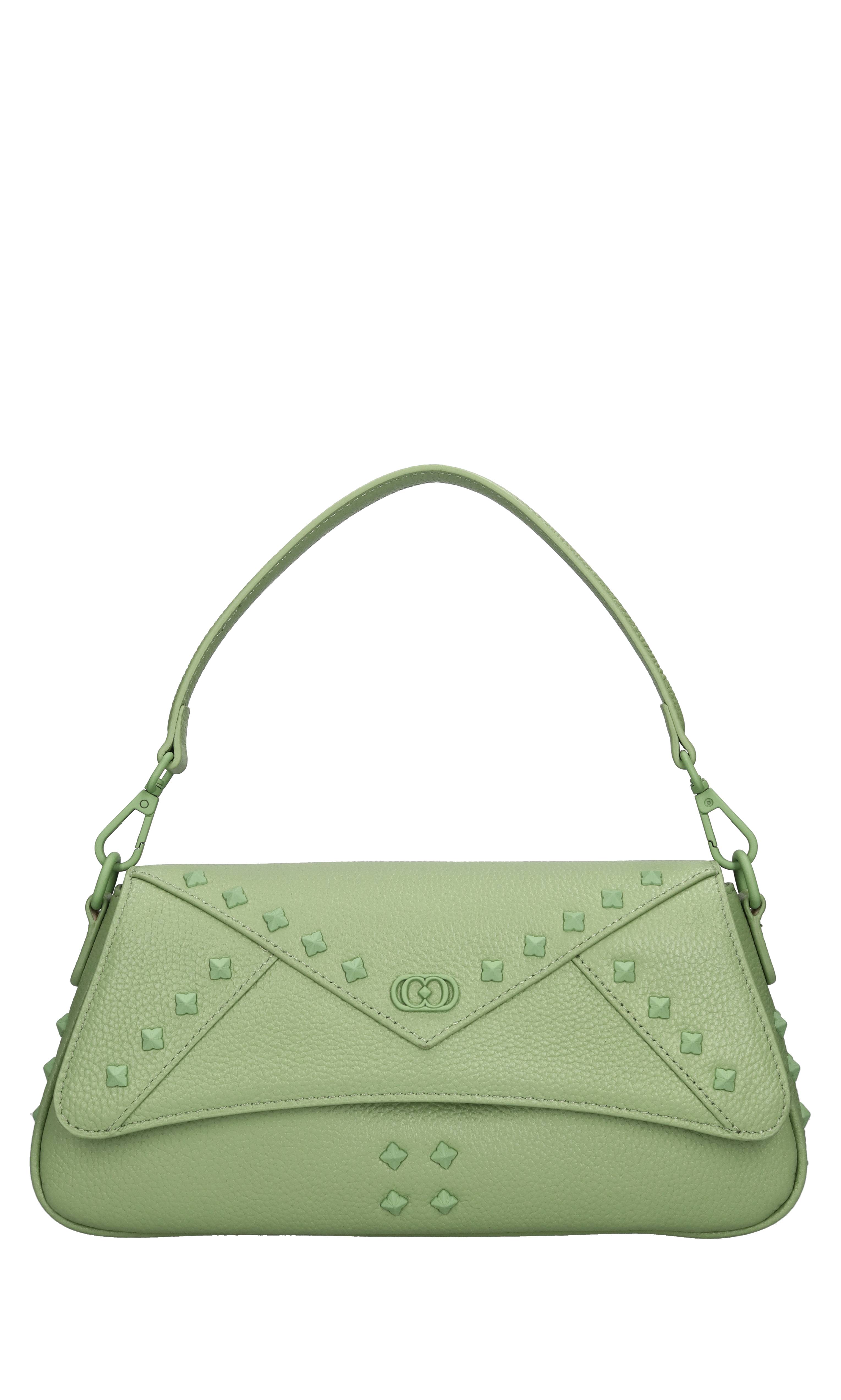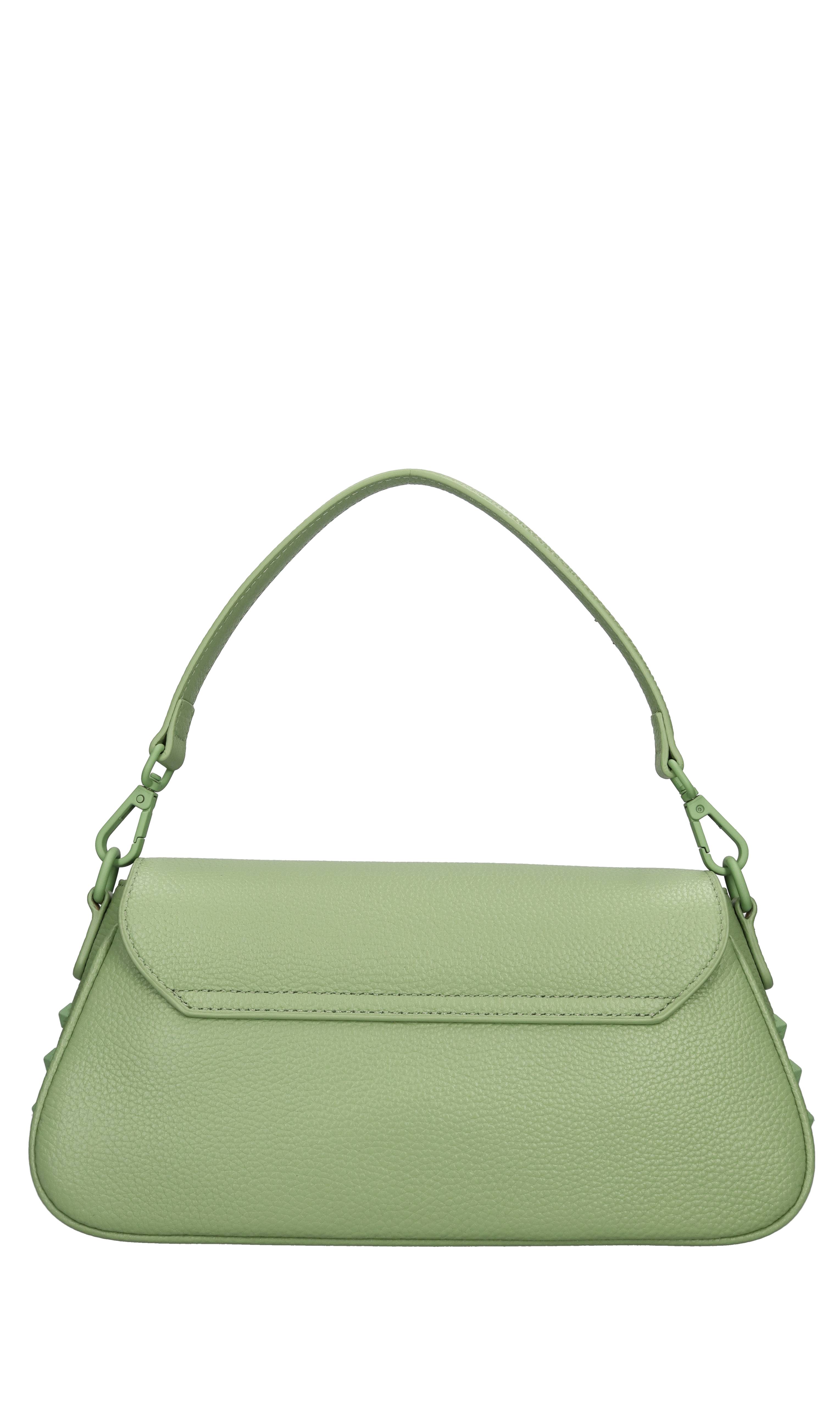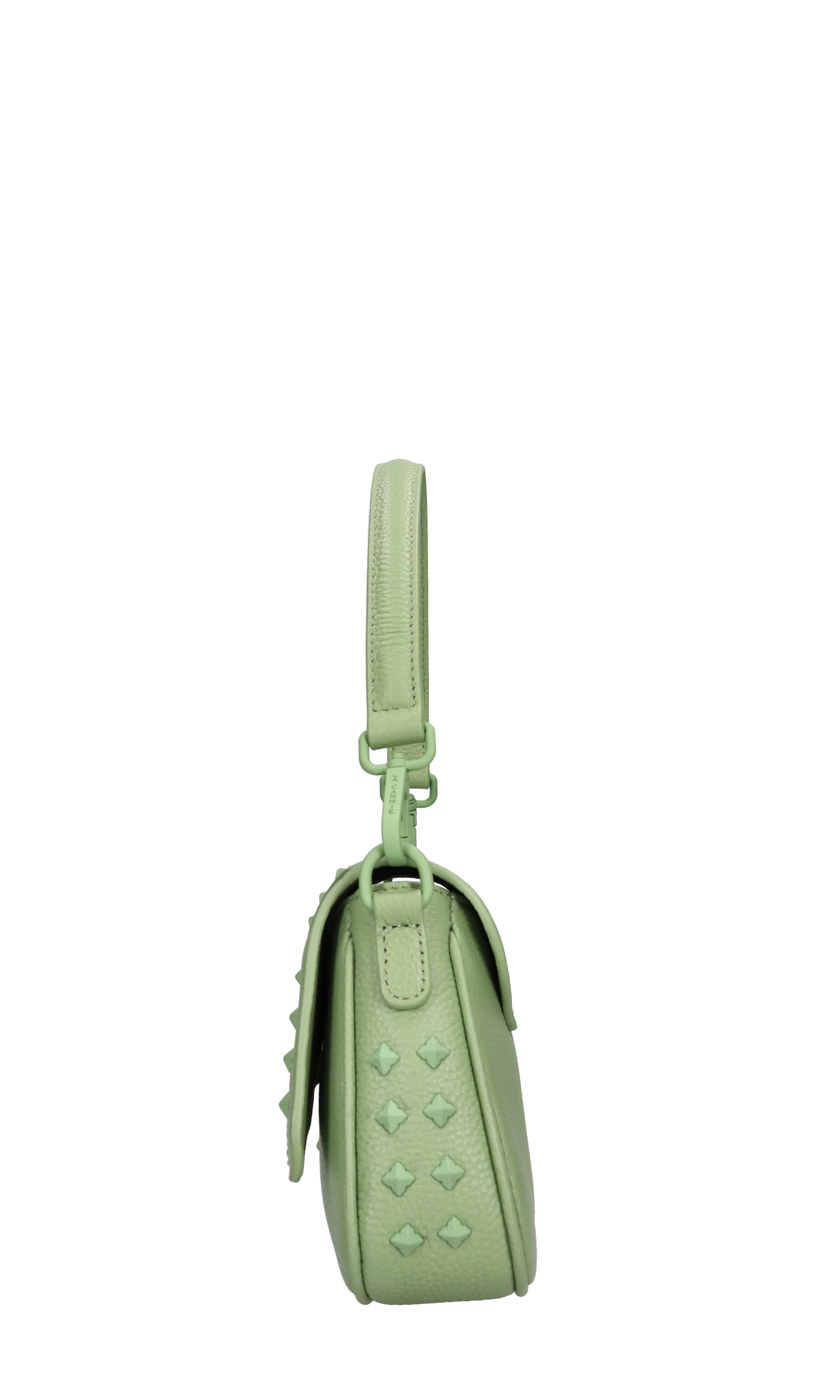 Frivolous leren tas en studs. Een compartiment. Details in metalen toon op toon. Afsluiten met klikknop. Handvat en ketting tone schouder band op verwijderbare leren toon.