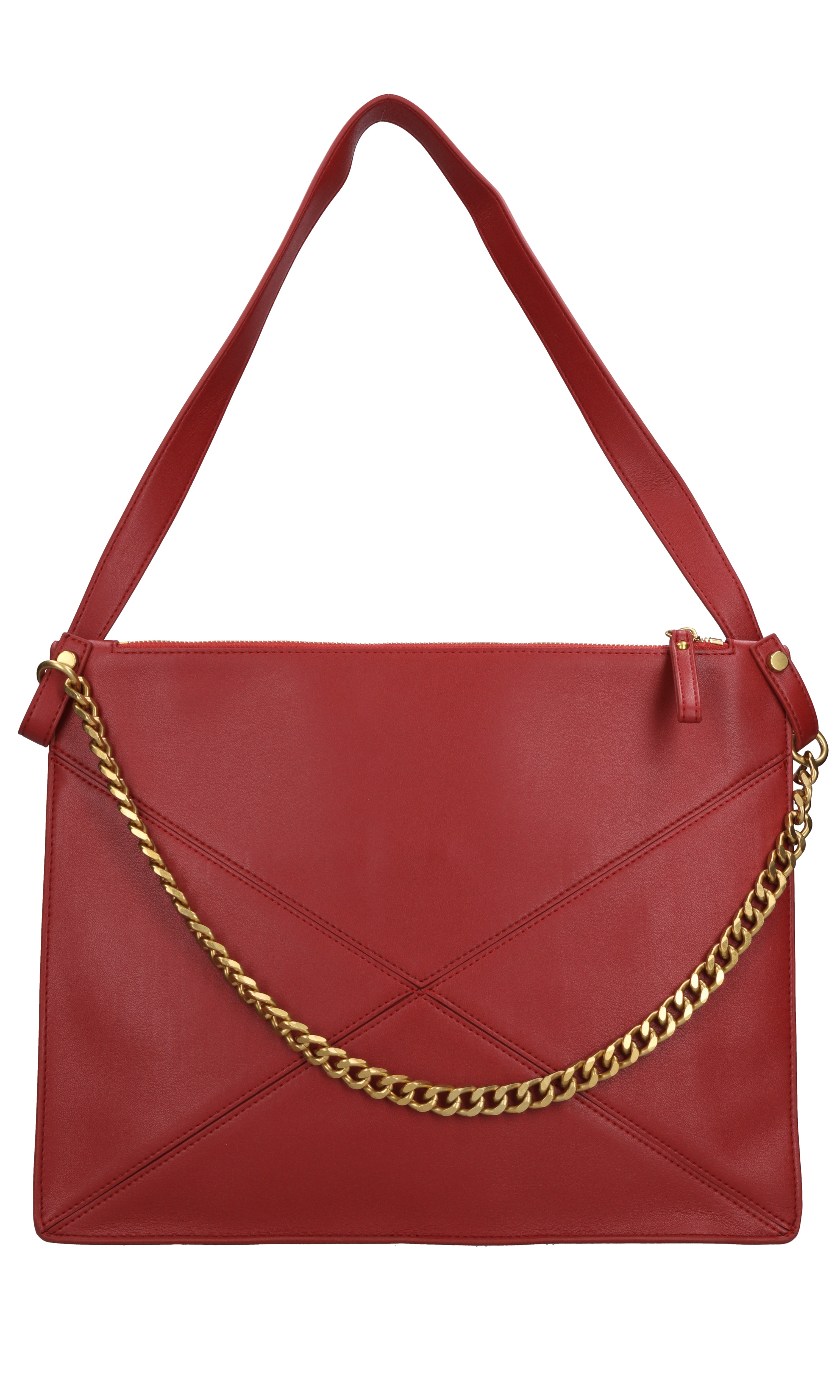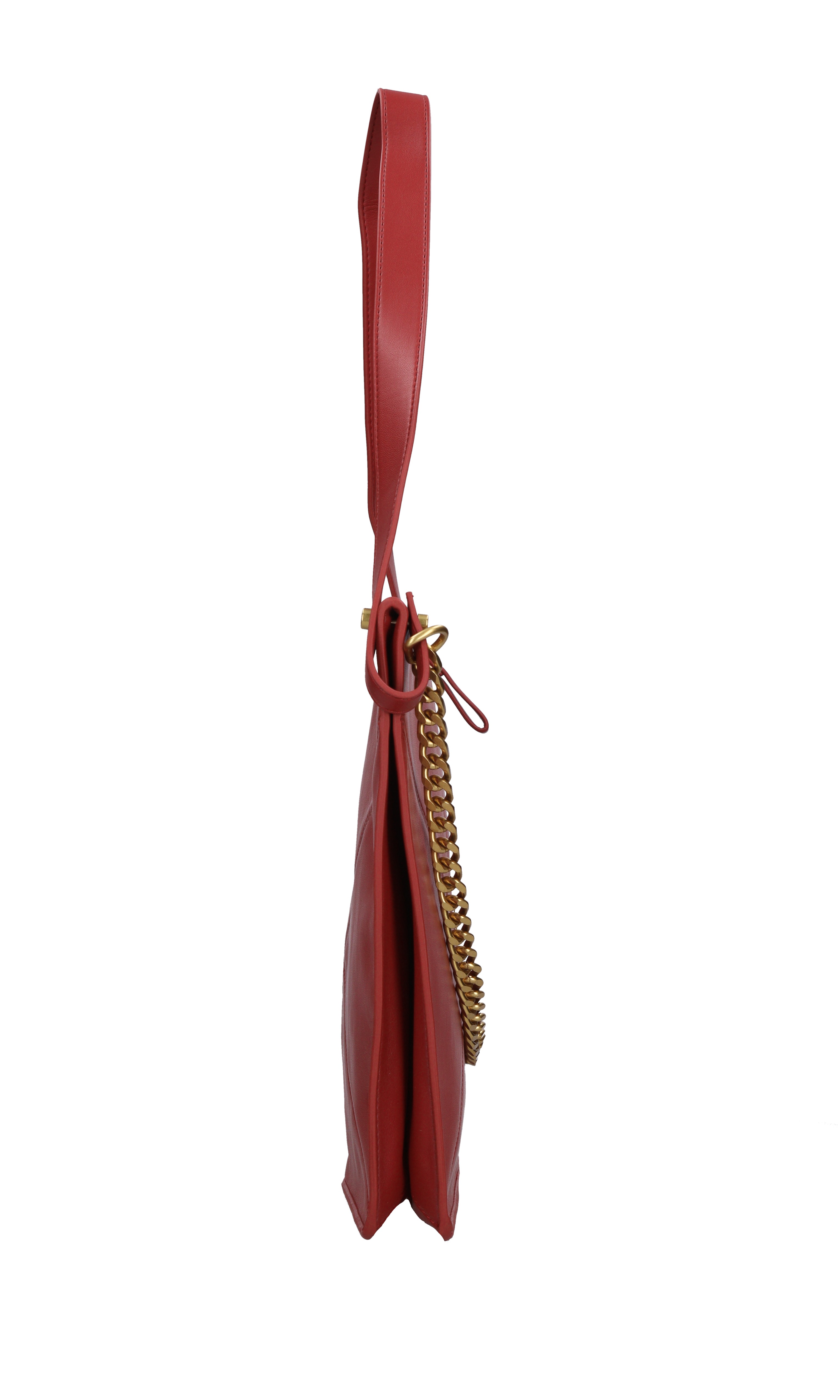 Hoek Emy handtas in eco-leer. Een compartiment. Zip sluiting. Dubbele gouden ketting schouderband en eco-leer.