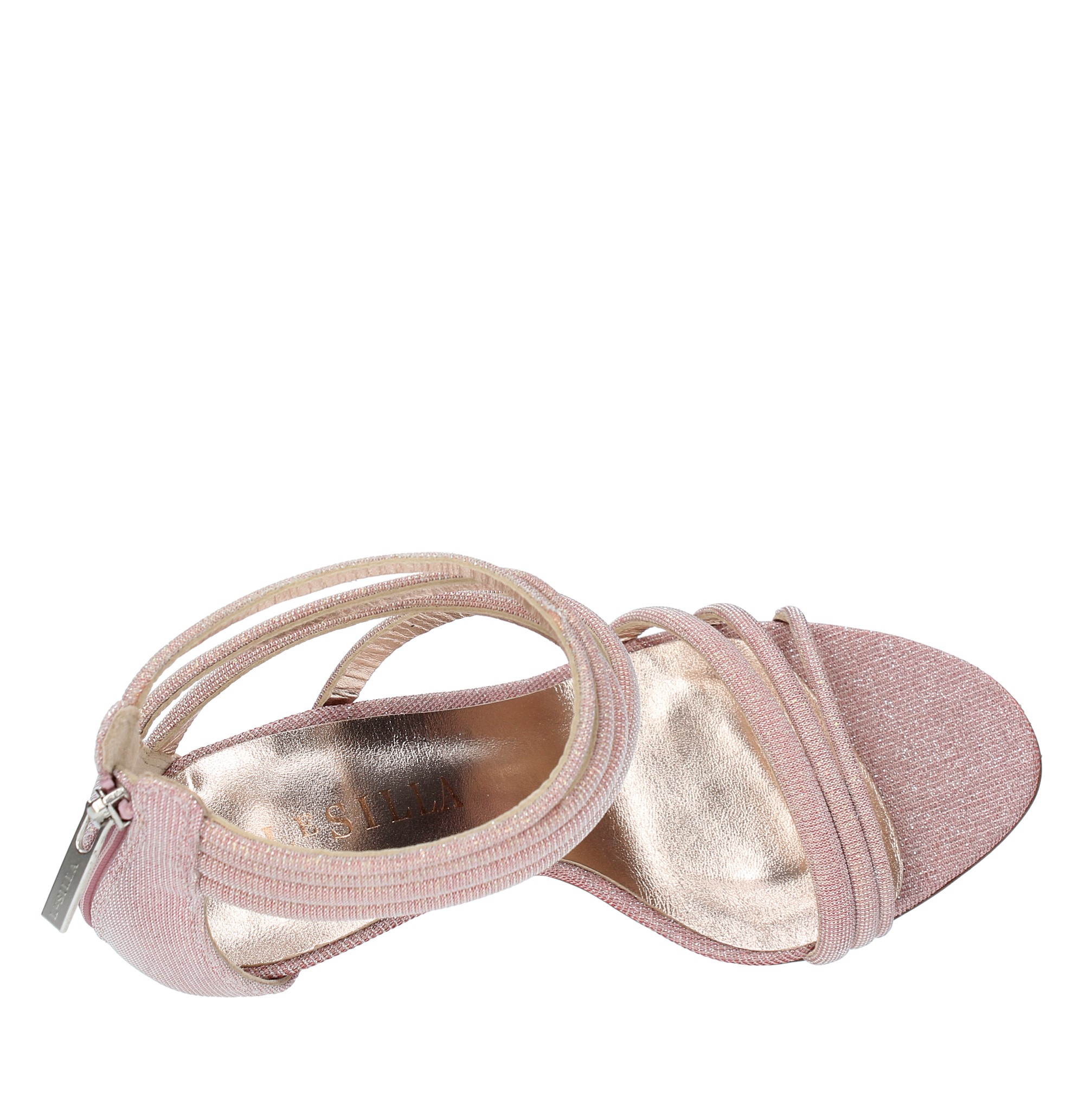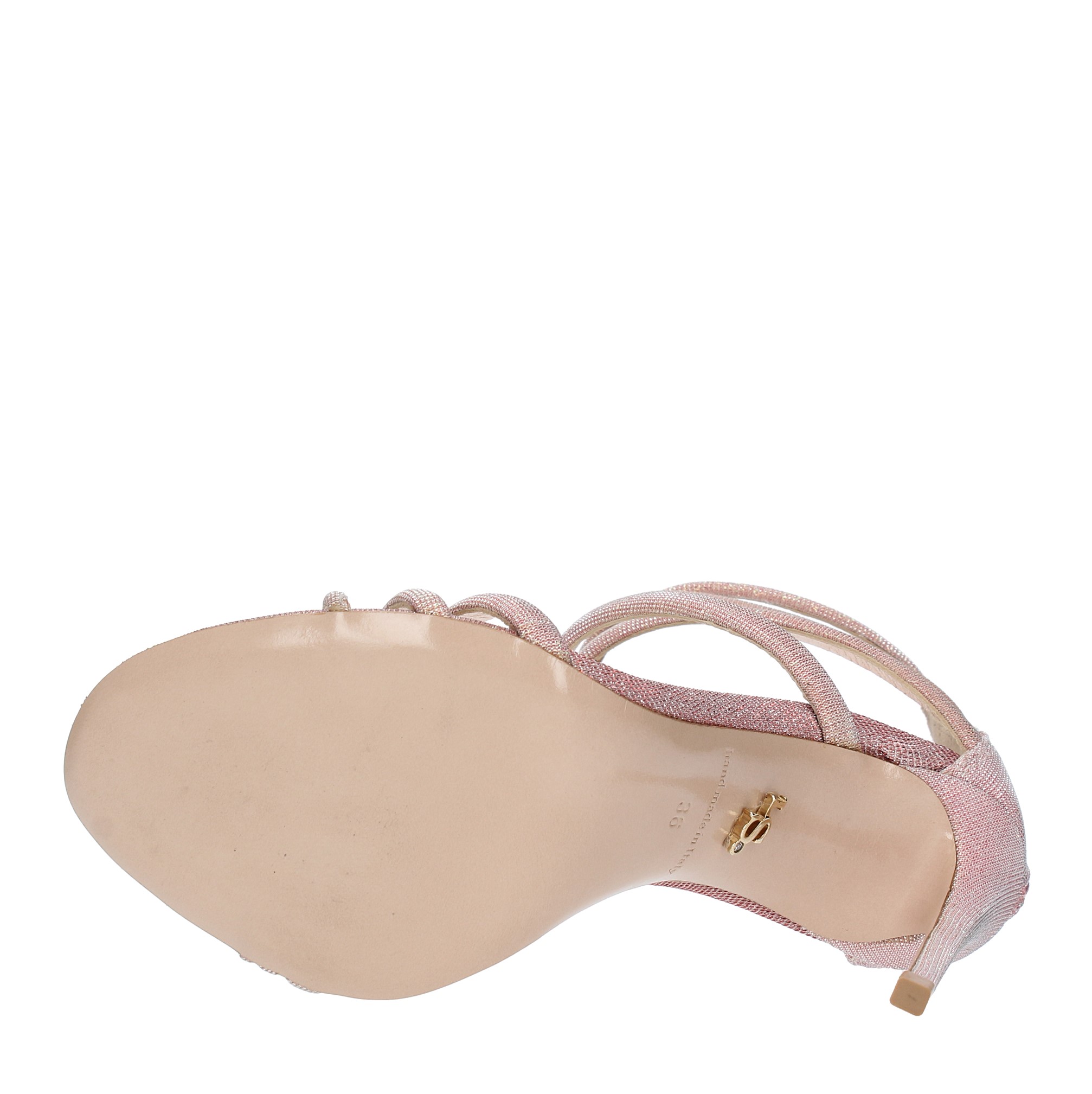 Sandalen van glitterstof. Buitenzool van leer en rubber. Intern bovenwerk van leer en stof.