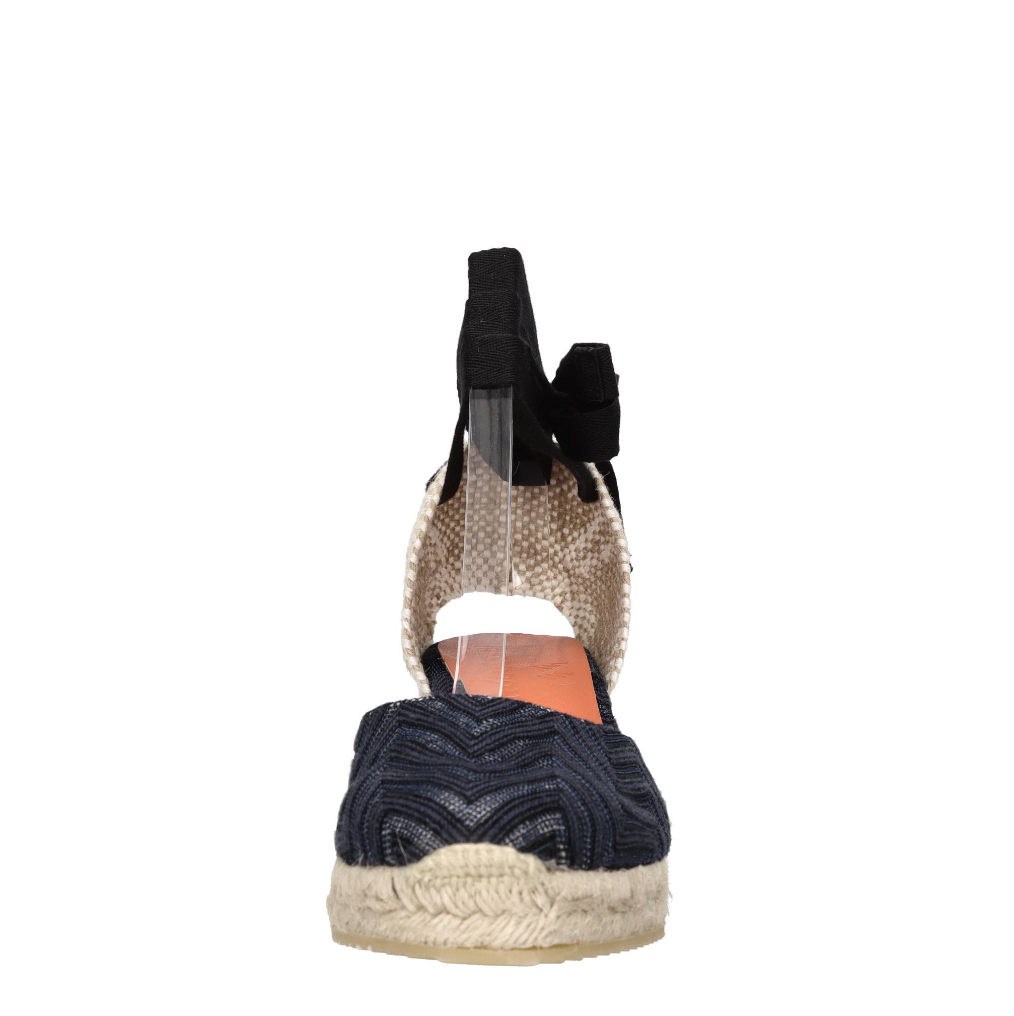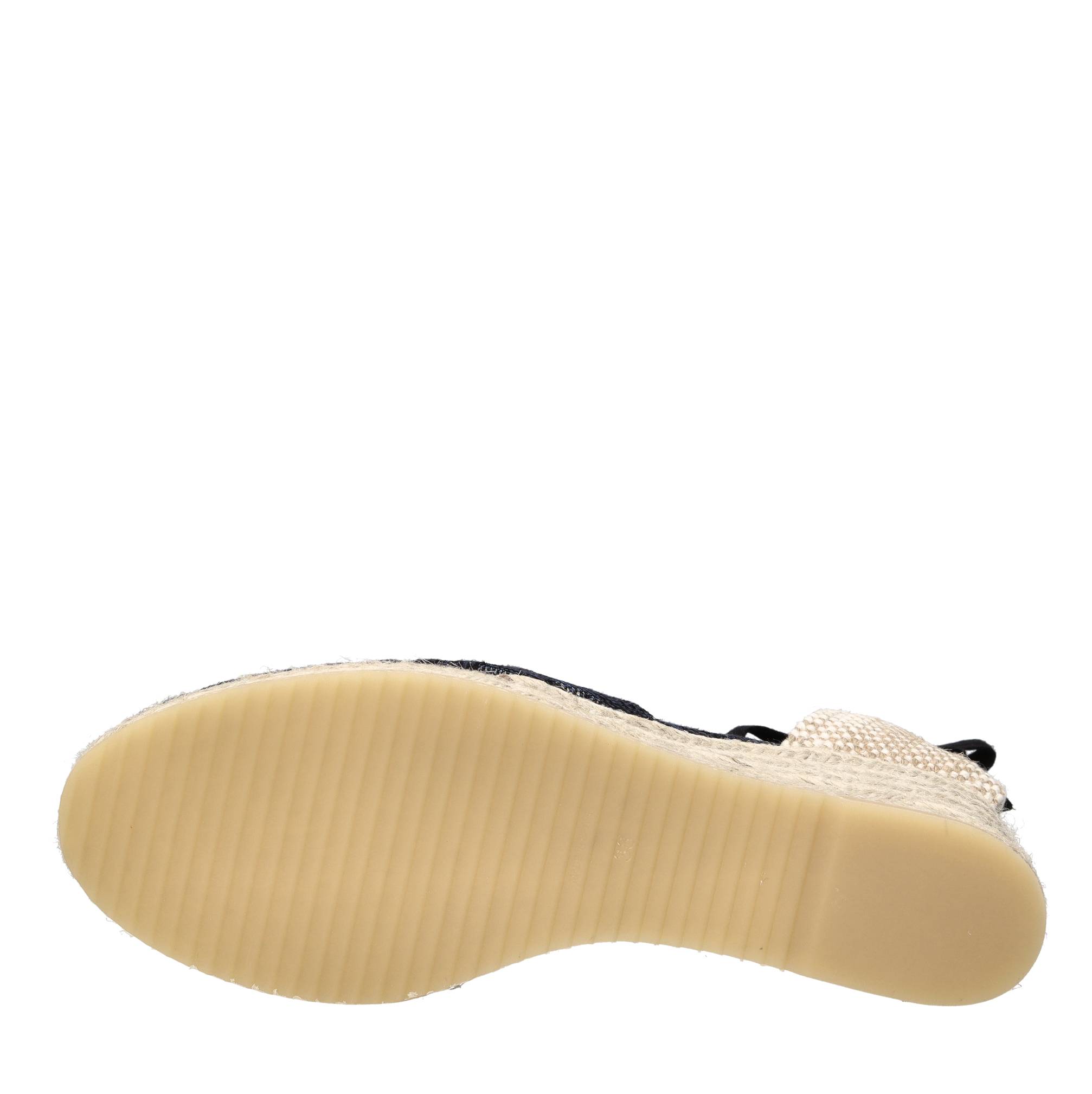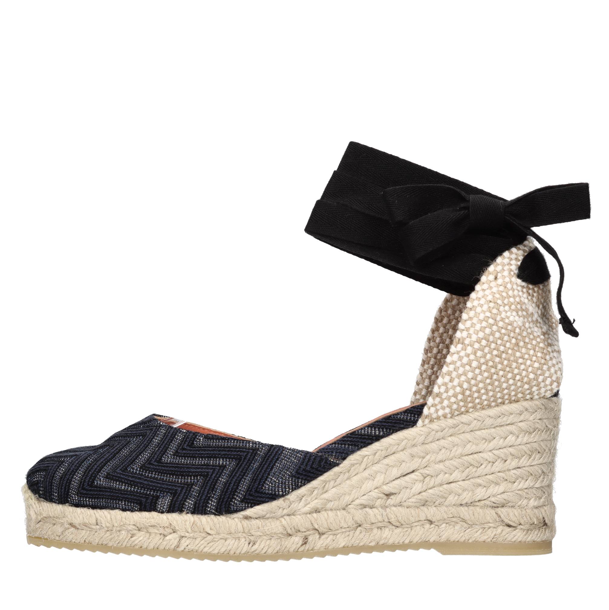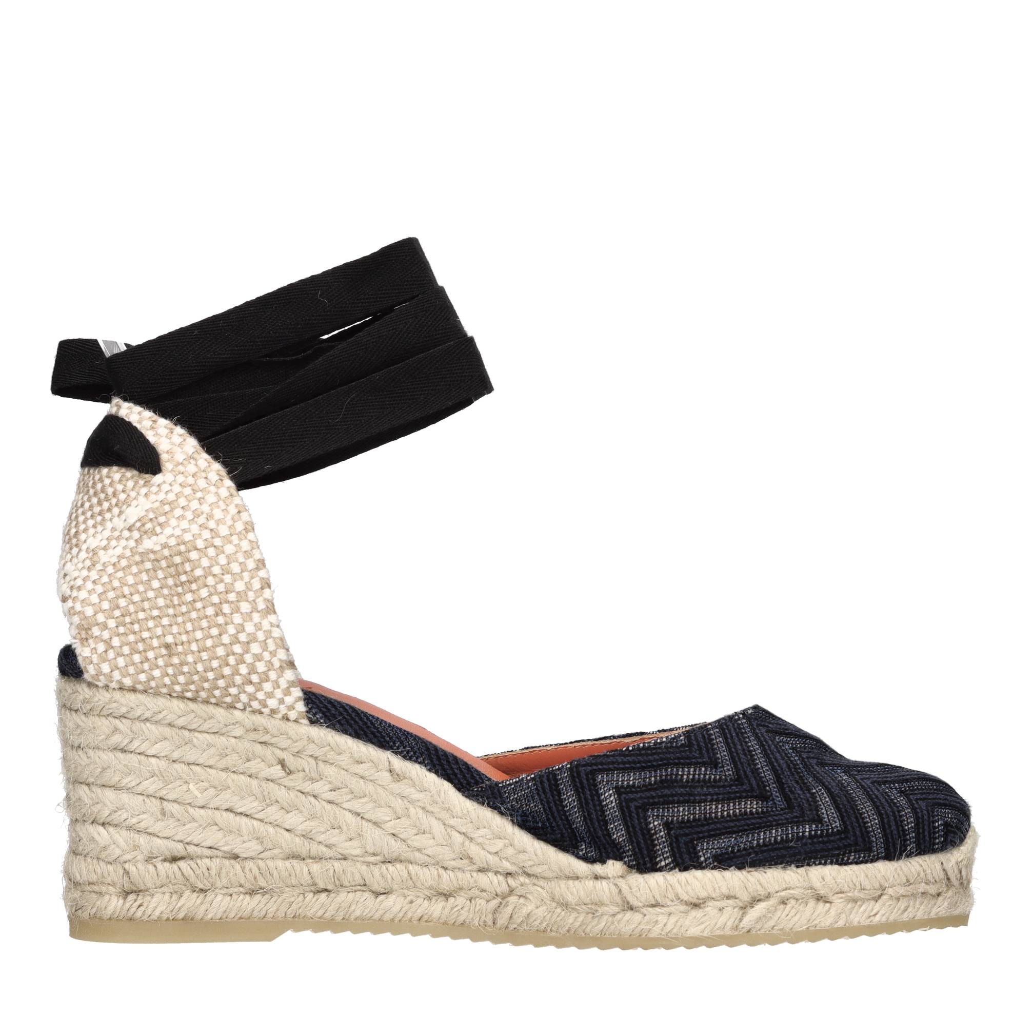Wedges in zigzag stof en leer. Rubberen buitenzool. Binnenzool in leer en stof. Bovenzijde in stof. De afdrukreeks kan anders zijn dan die op de foto.