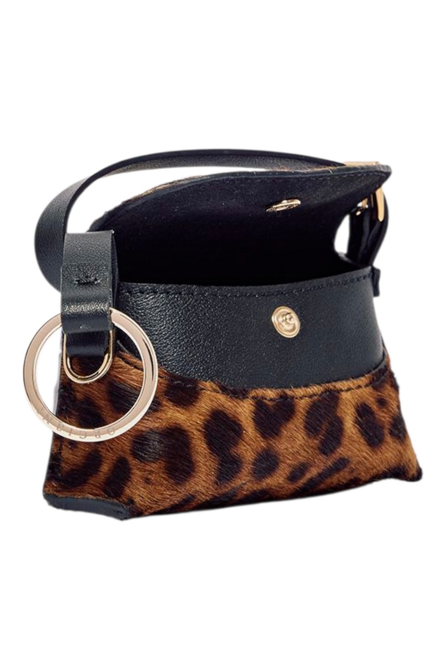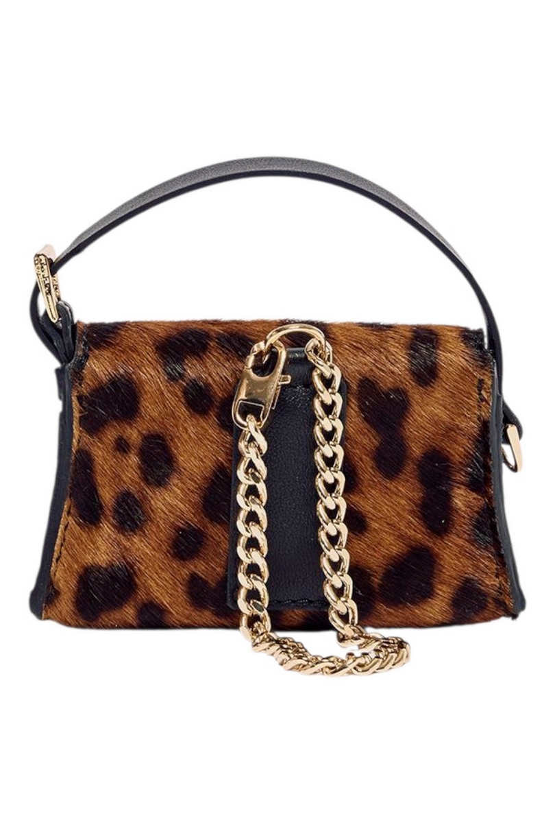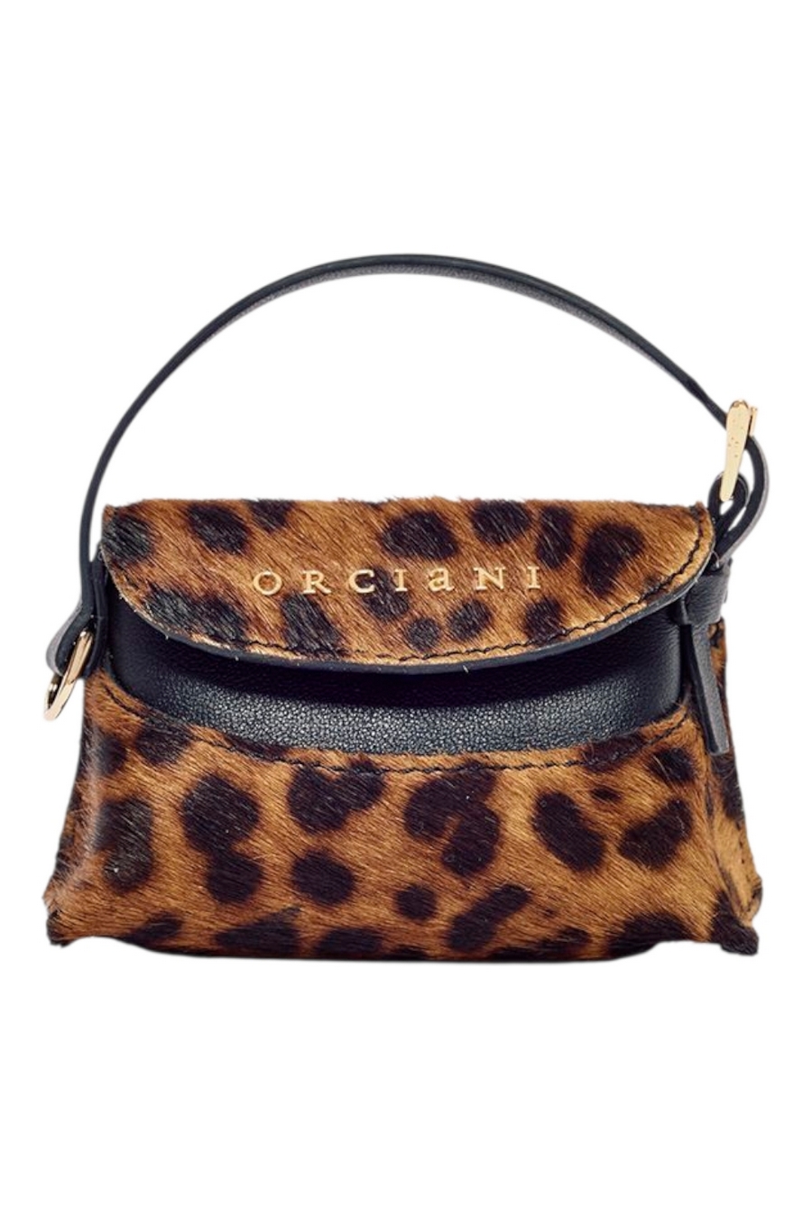Charme Orciani te bevestigen aan de handgrepen van de zakken, in de riemen te doen als mini-zakje of te gebruiken als speelse sleutelhangers. Afmeting: Breedte: 11 cm / Hoogte: 6,5 cm / Diepte: 4 cm. Sluiting: met flap en drukknop. Functionaliteit: binnenste sleutelhanger / karabijnhaak met achterketting/ruglus voor riem. Materiaal: paarden print leo en kalfshuid. Details: metalen afwerking licht goud. Gemaakt in Italië