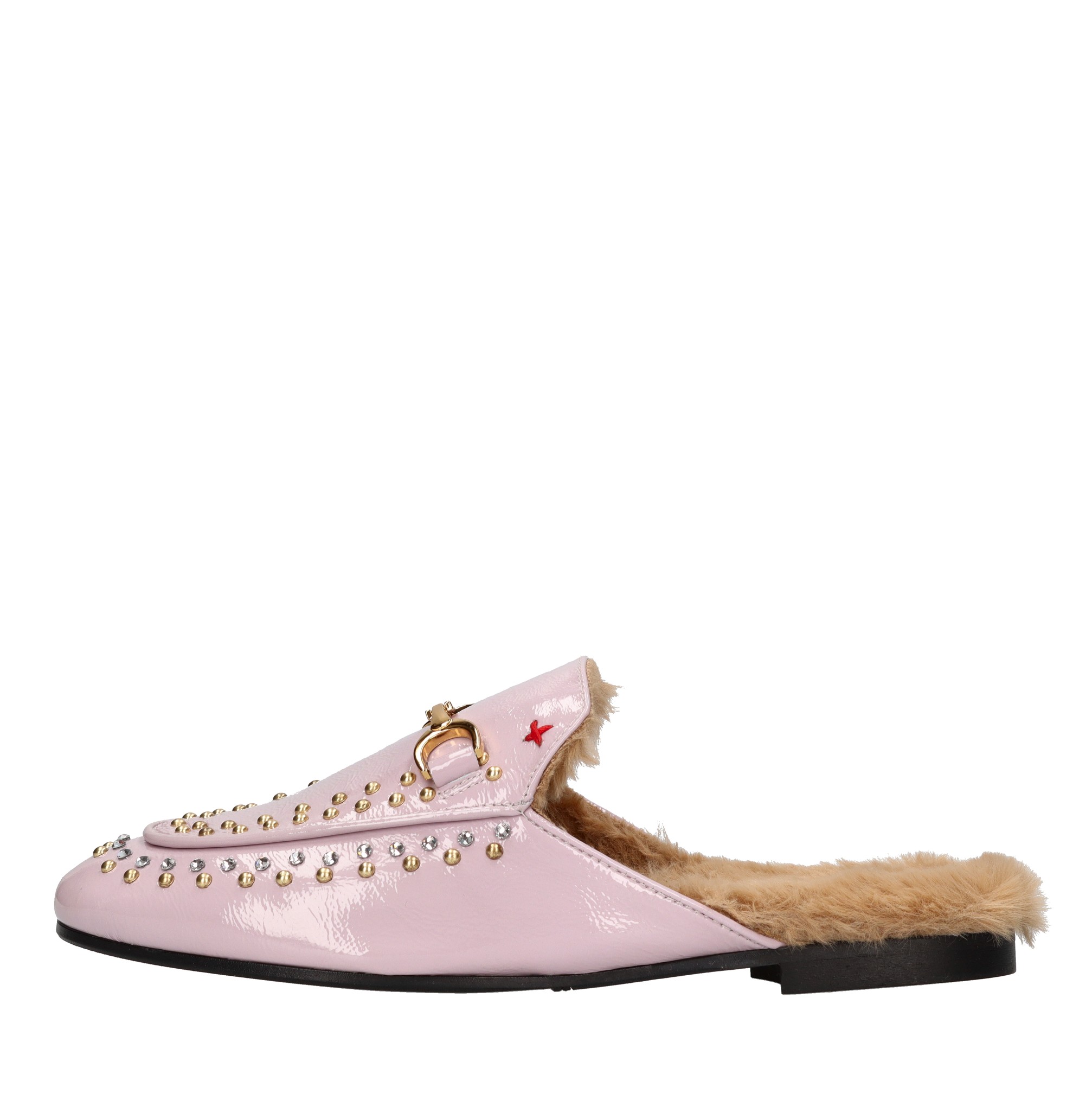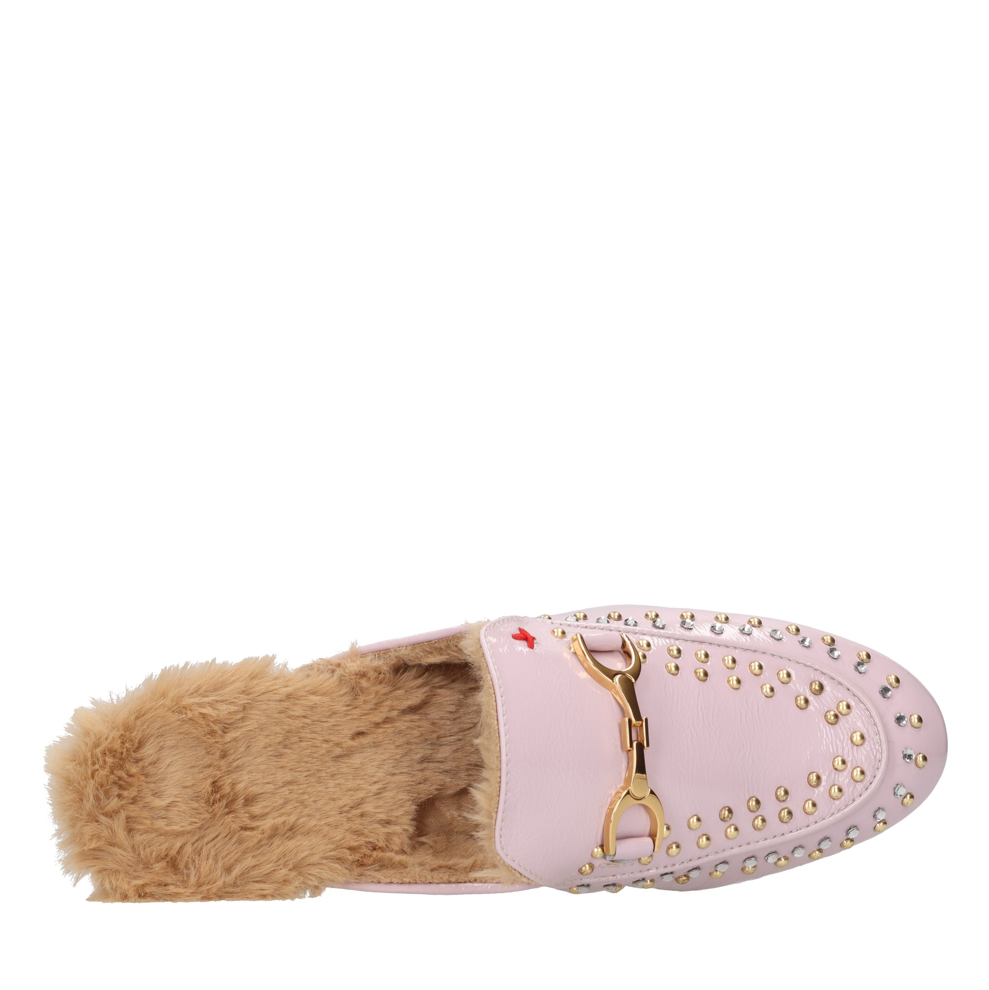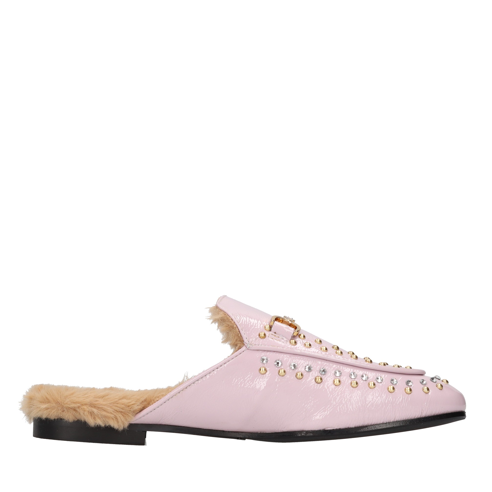 Muiltjes van leer met strass-steentjes en studs. Lila/roze kleur. Klem en gouden studs. Kristallen steentjes. Buitenzool van rubber en leer. Leren bovenwerk. Binnenbont.