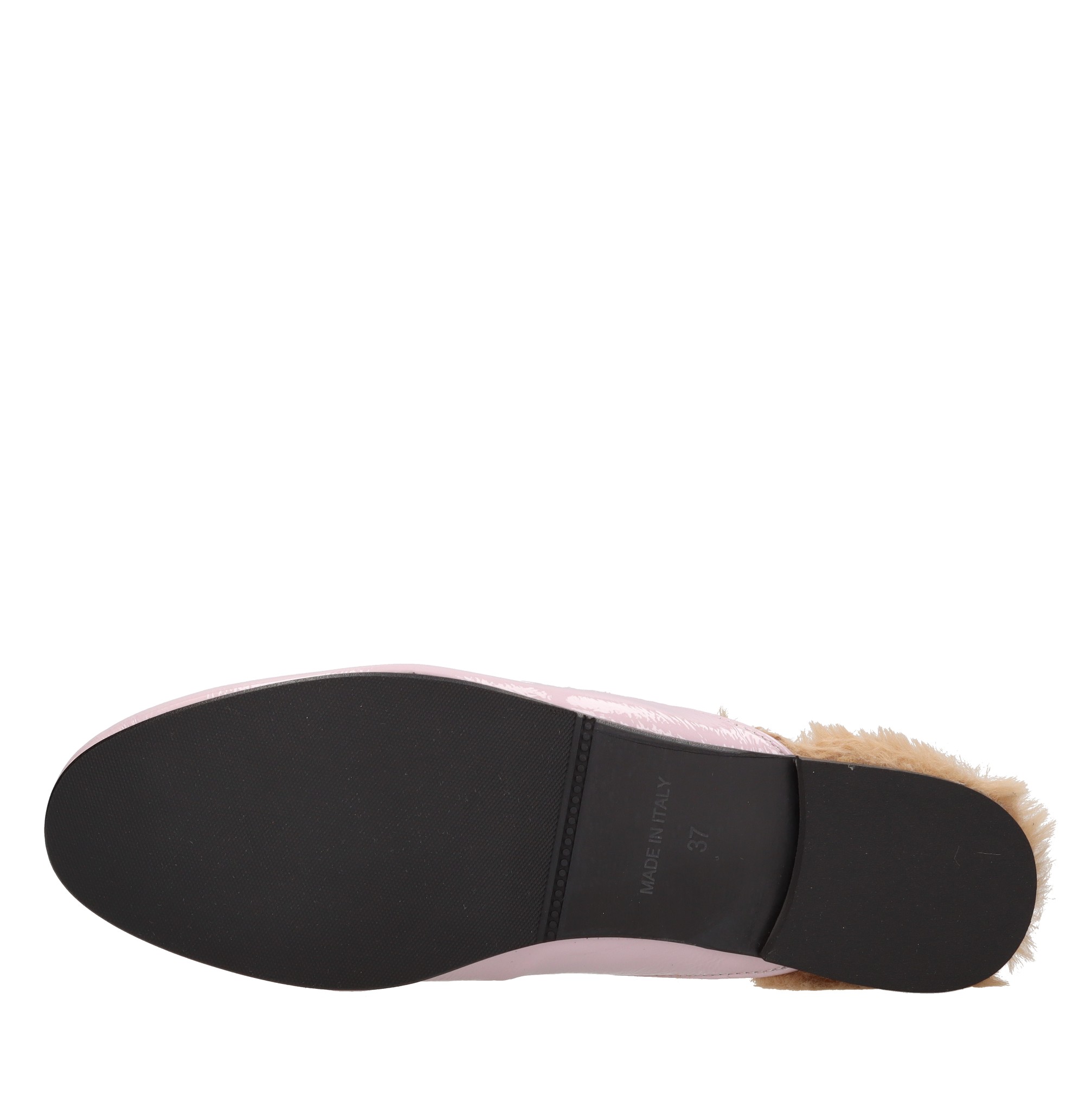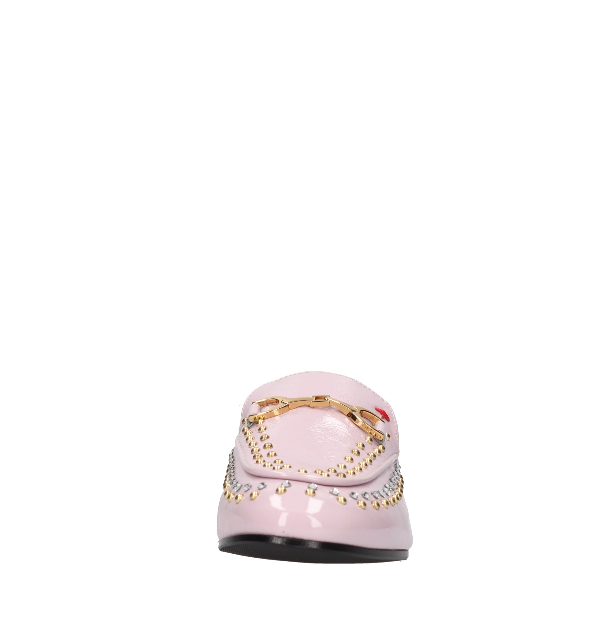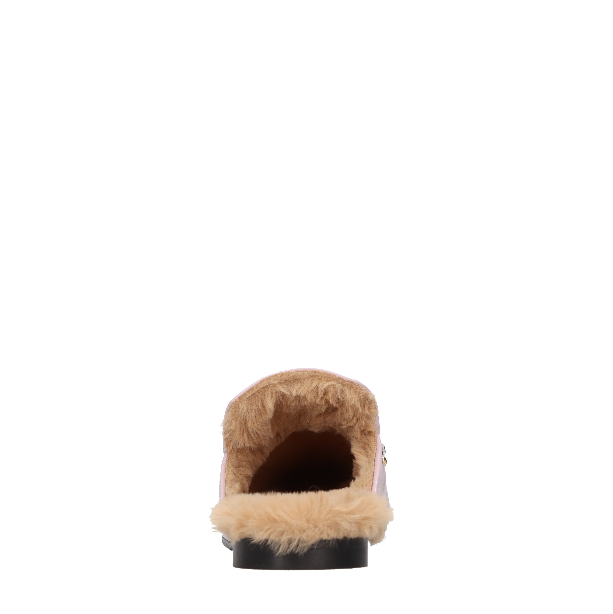 Muiltjes van leer met strass-steentjes en studs. Lila/roze kleur. Klem en gouden studs. Kristallen steentjes. Buitenzool van rubber en leer. Leren bovenwerk. Binnenbont.