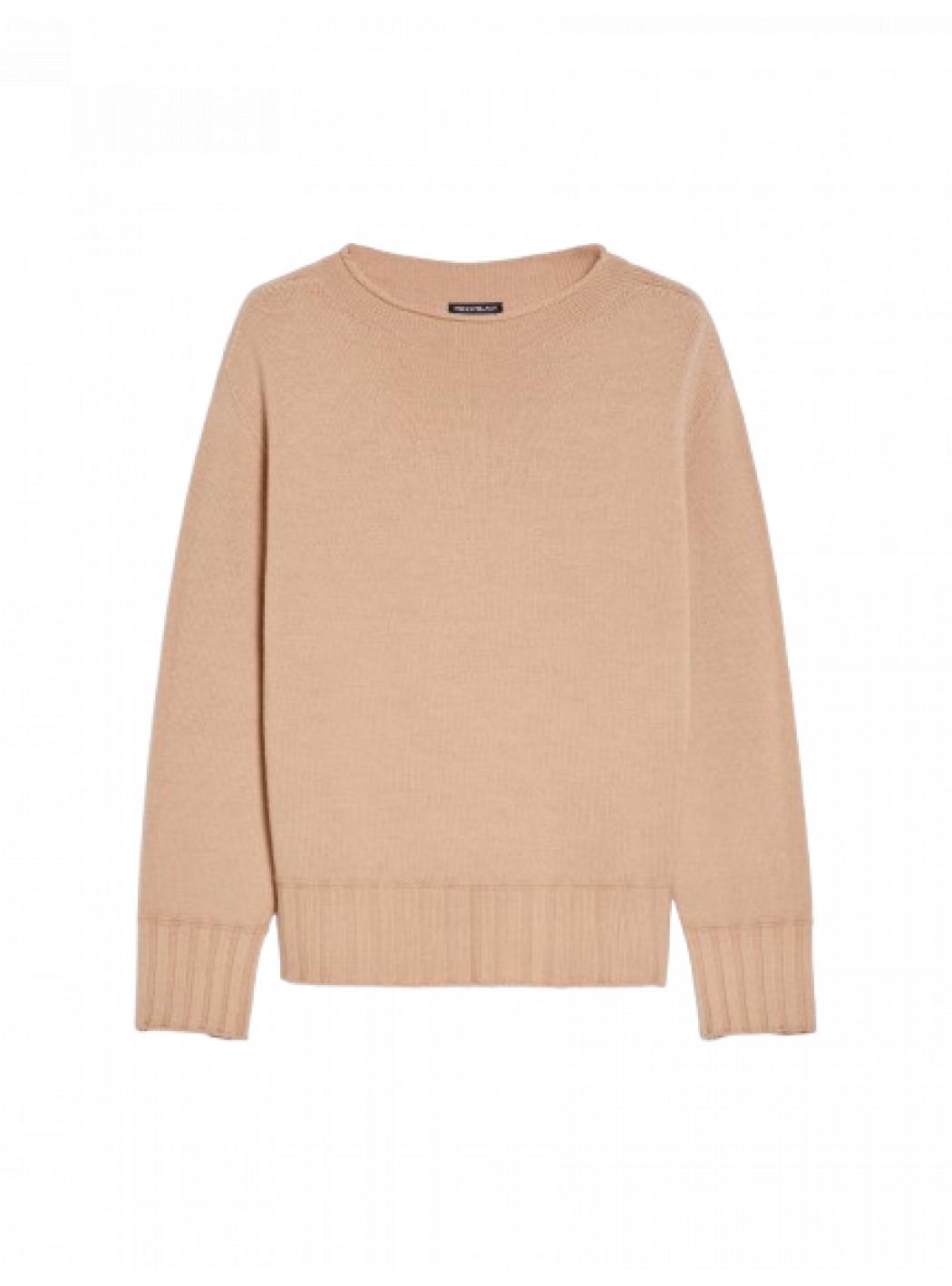 Pure wollen trui geverfd met pigmenten van plantaardige oorsprong. Het heeft naadloze integrale verwerking, geribde randen en details op punt links. Kraterhals met opgerolde rand, rechte en zachte lijnen met lagere schouders