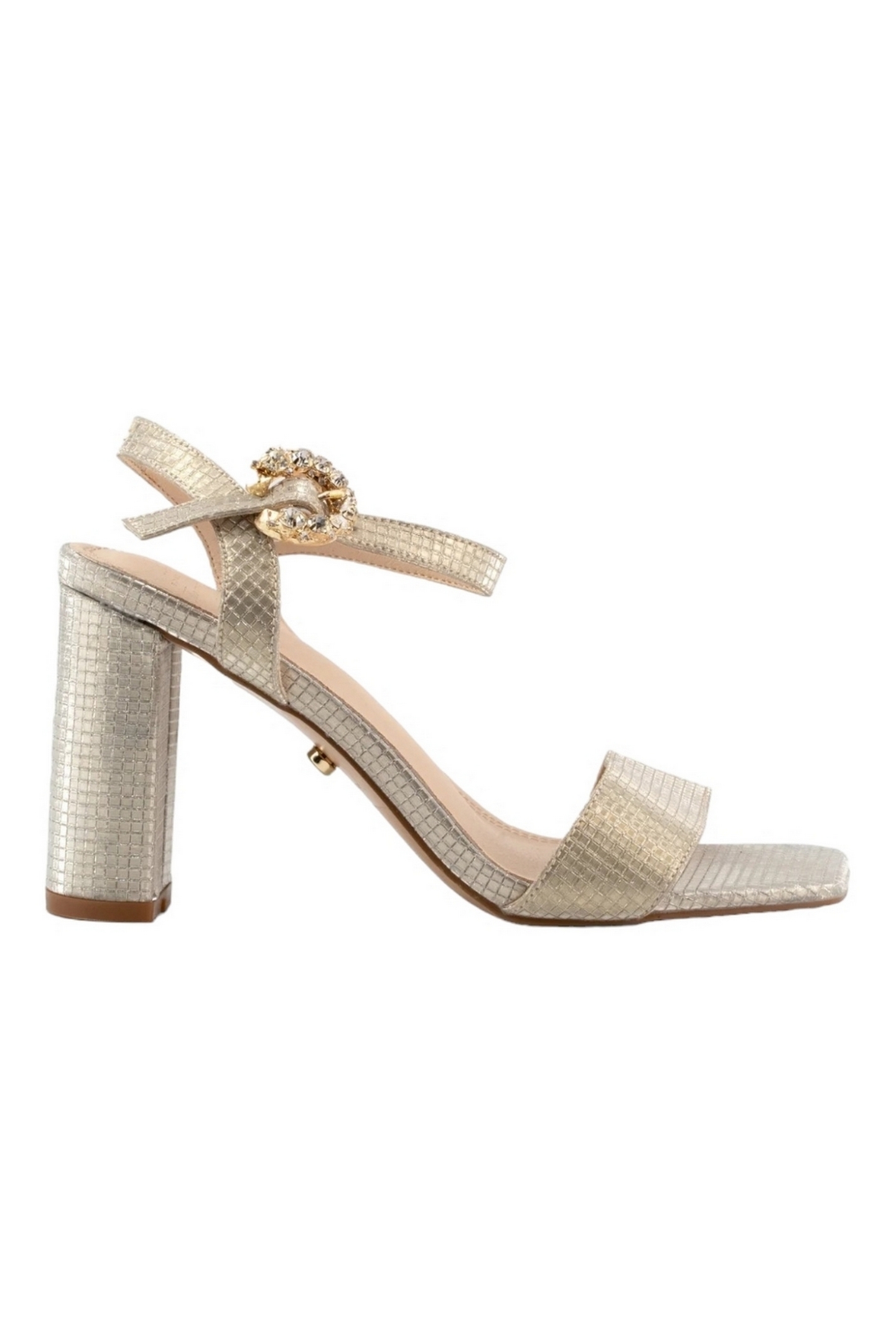 Sandal met Twenty Fourhaitch juweel gesp. Afsluiting en vergrendel hiel bedekt. Hoogte hiel 9 cm